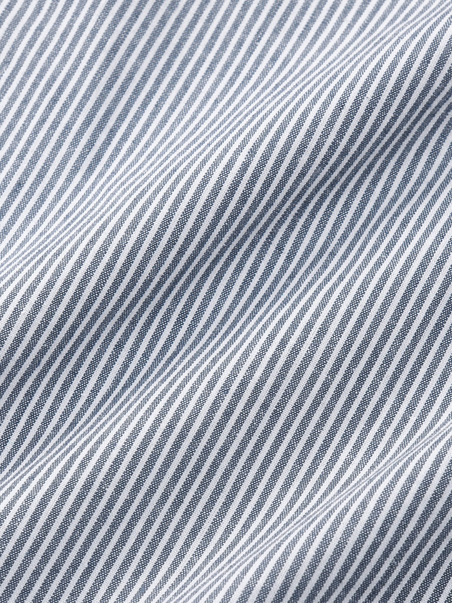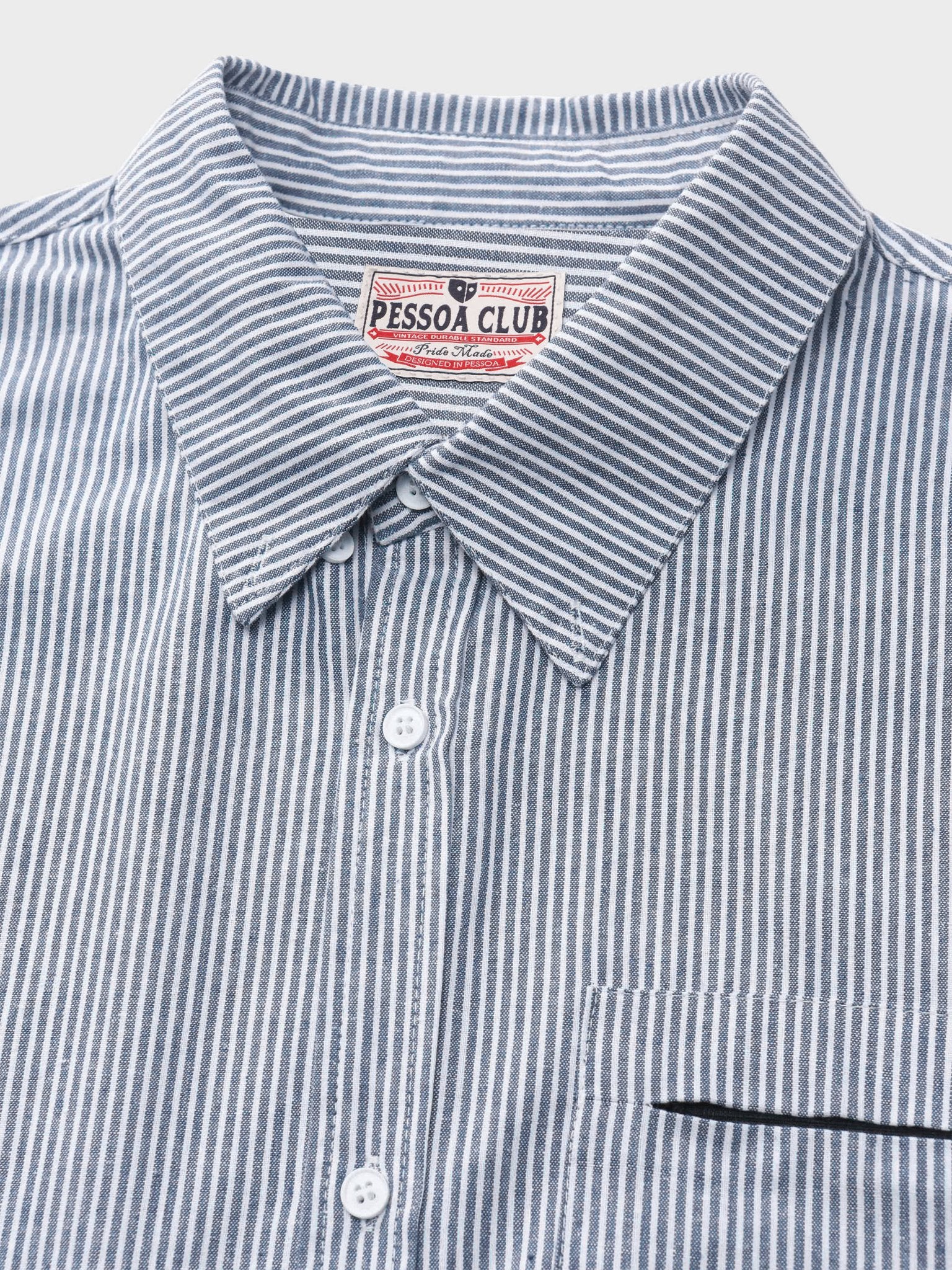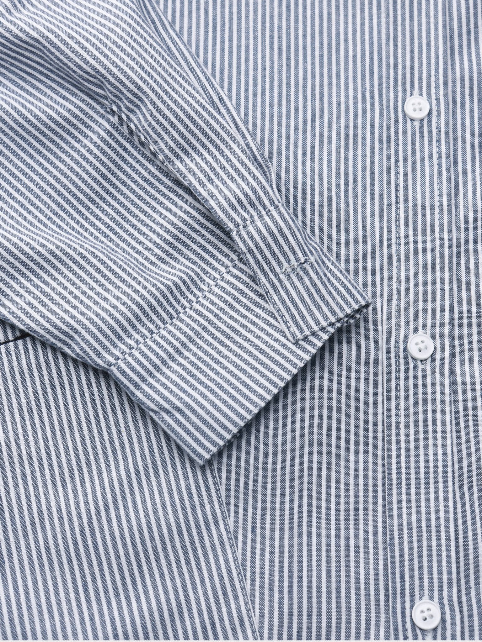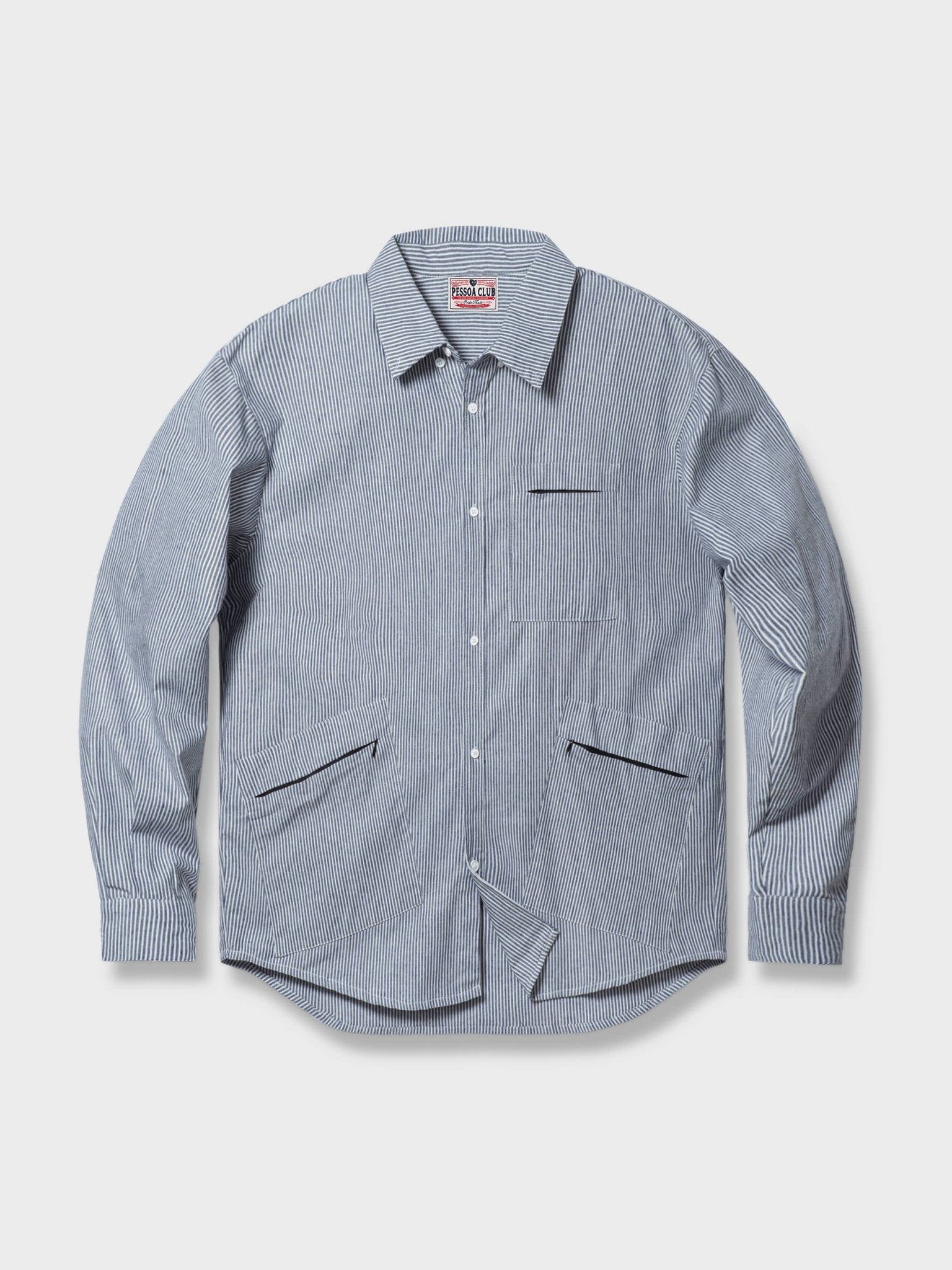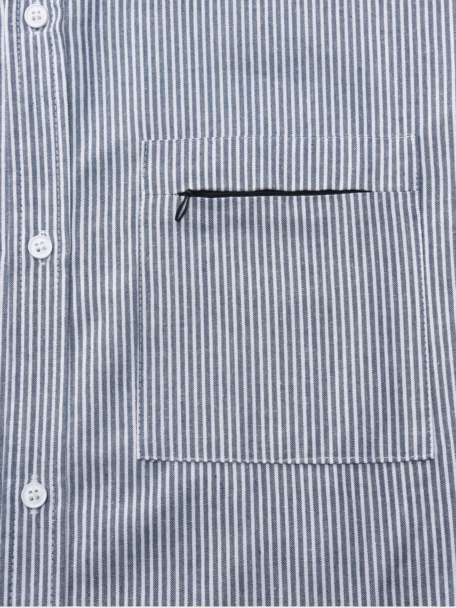 ストライプ柄は繊細な凹凸があり、前中心のボタンもさりげなくおしゃれなアクセントになっています。身頃には左右対称の斜めポケットが配置され、こなれた印象を演出します。落ち着いた印象のデザインで、1枚で着用してもインナー使いでも着回しできる。