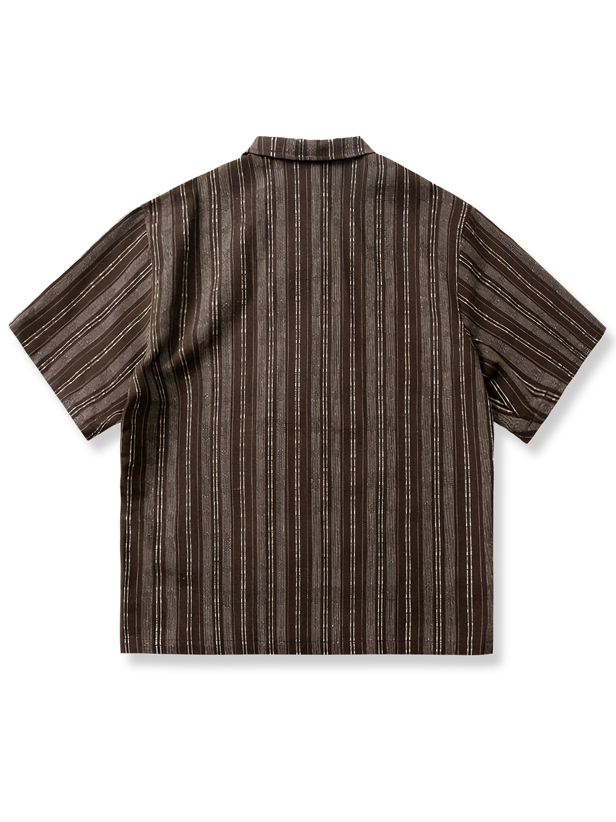 綿麻生地のベースに織り込まれたマルチストライプ柄が、民族調の中に高級感を演出します。キューバ襟がおしゃれで、コーディネートの立体感をアップしています。ストライプ柄がワークテイストのイメージを程よく中和し、完成度の高い1着に仕上がっています。