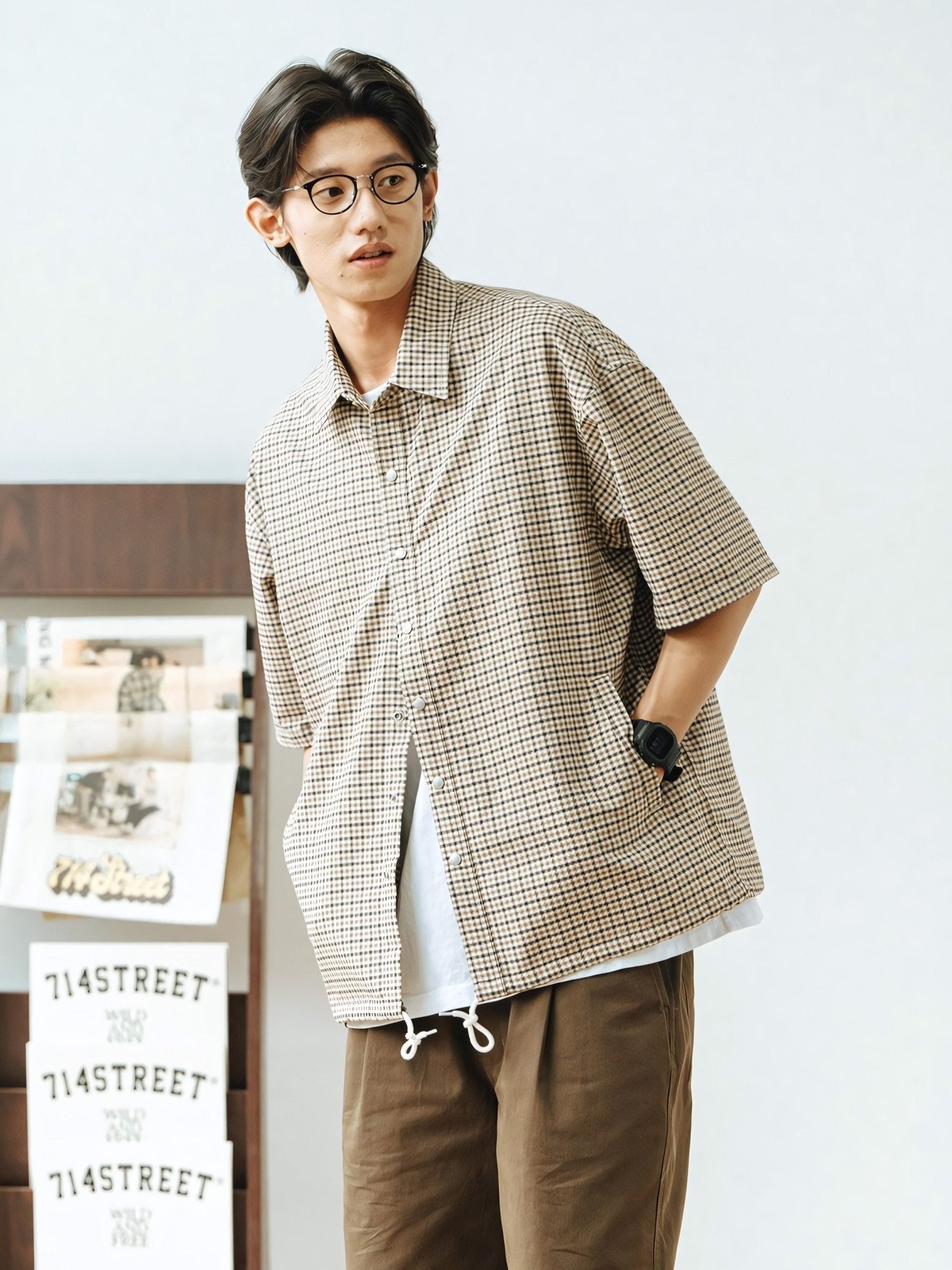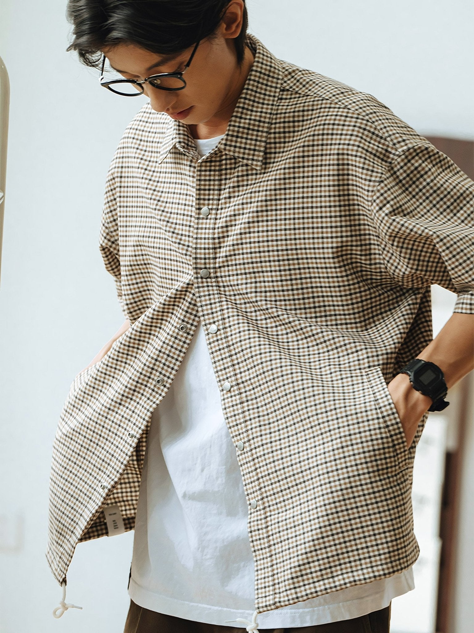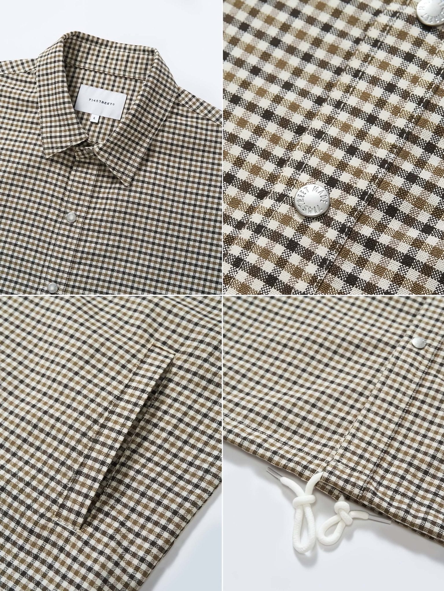 このシャツは千鳥格子模様の生地を使用し、ブラウンの格子がベースで、低彩度の黄色とベージュの格子を組み合わせ、軽やかなレトロなファッションを演出しています。全体のデザインは日本風のクラシックであり、リラックスした雰囲気が漂います。裾部分の白い紐のデザインは、カジュアルな要素を加えると同時に、適度な調整が可能で、シャツをより多様なスタイルに変えることができます。