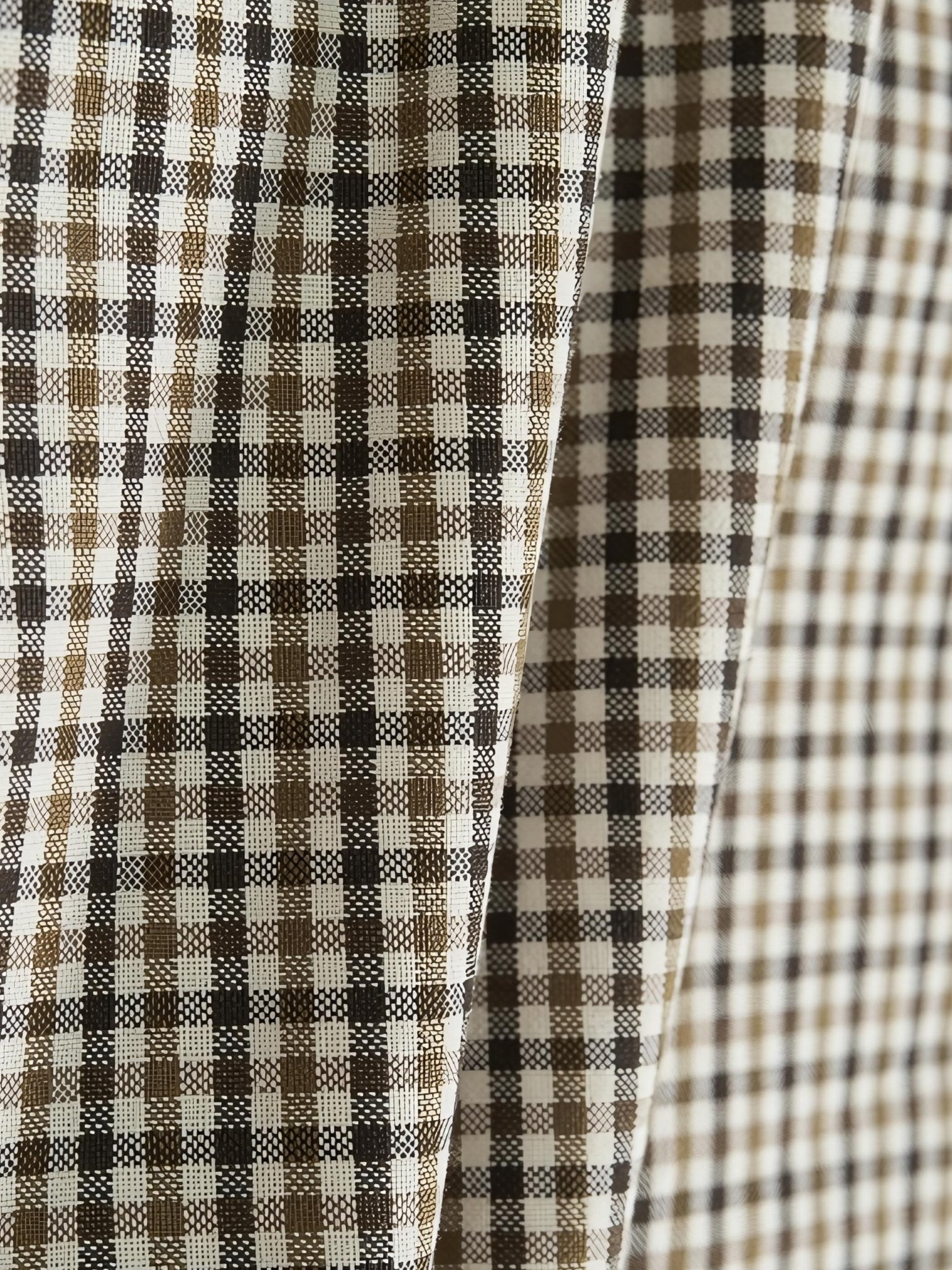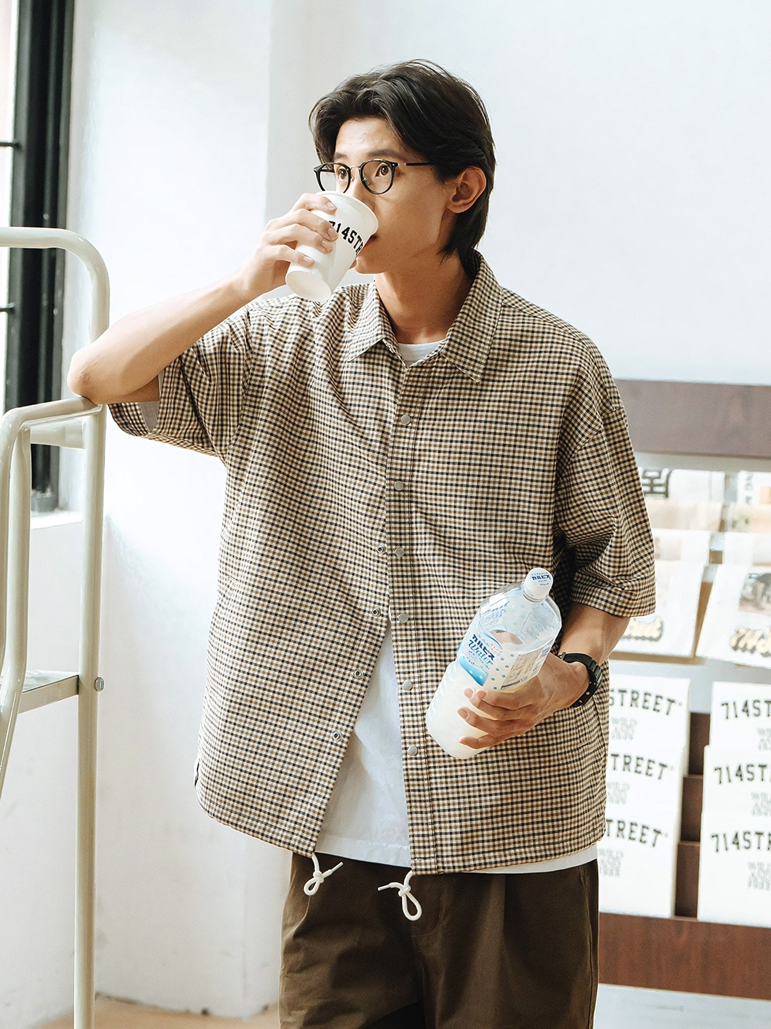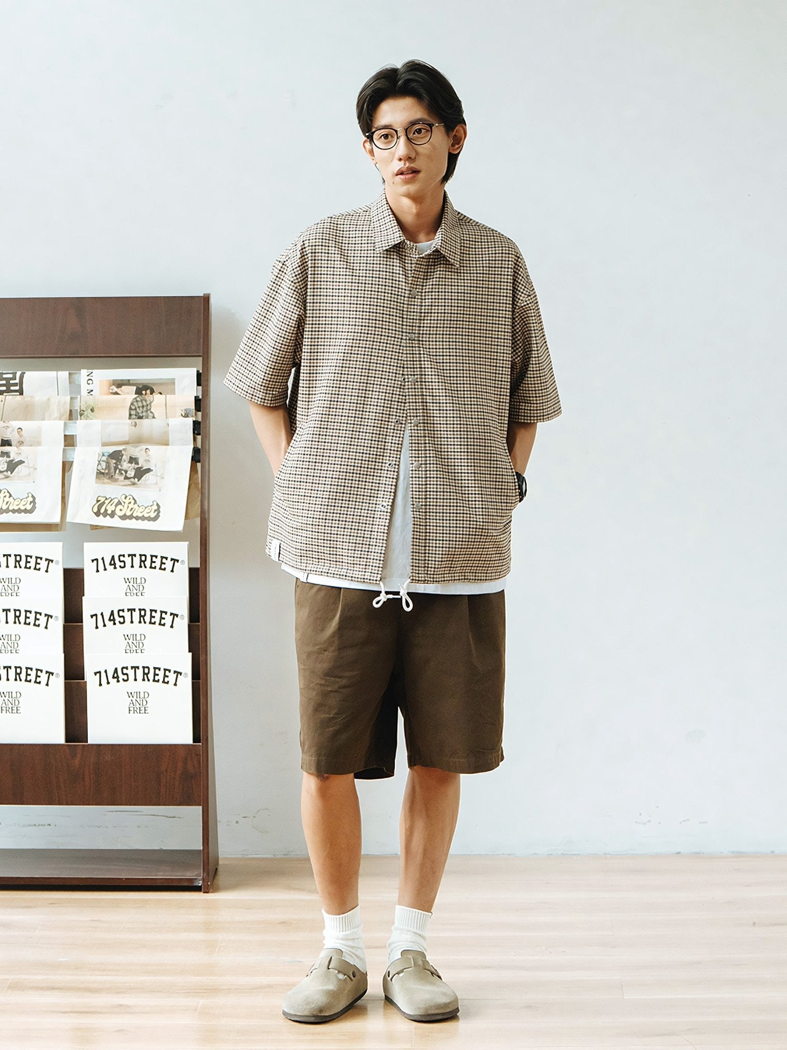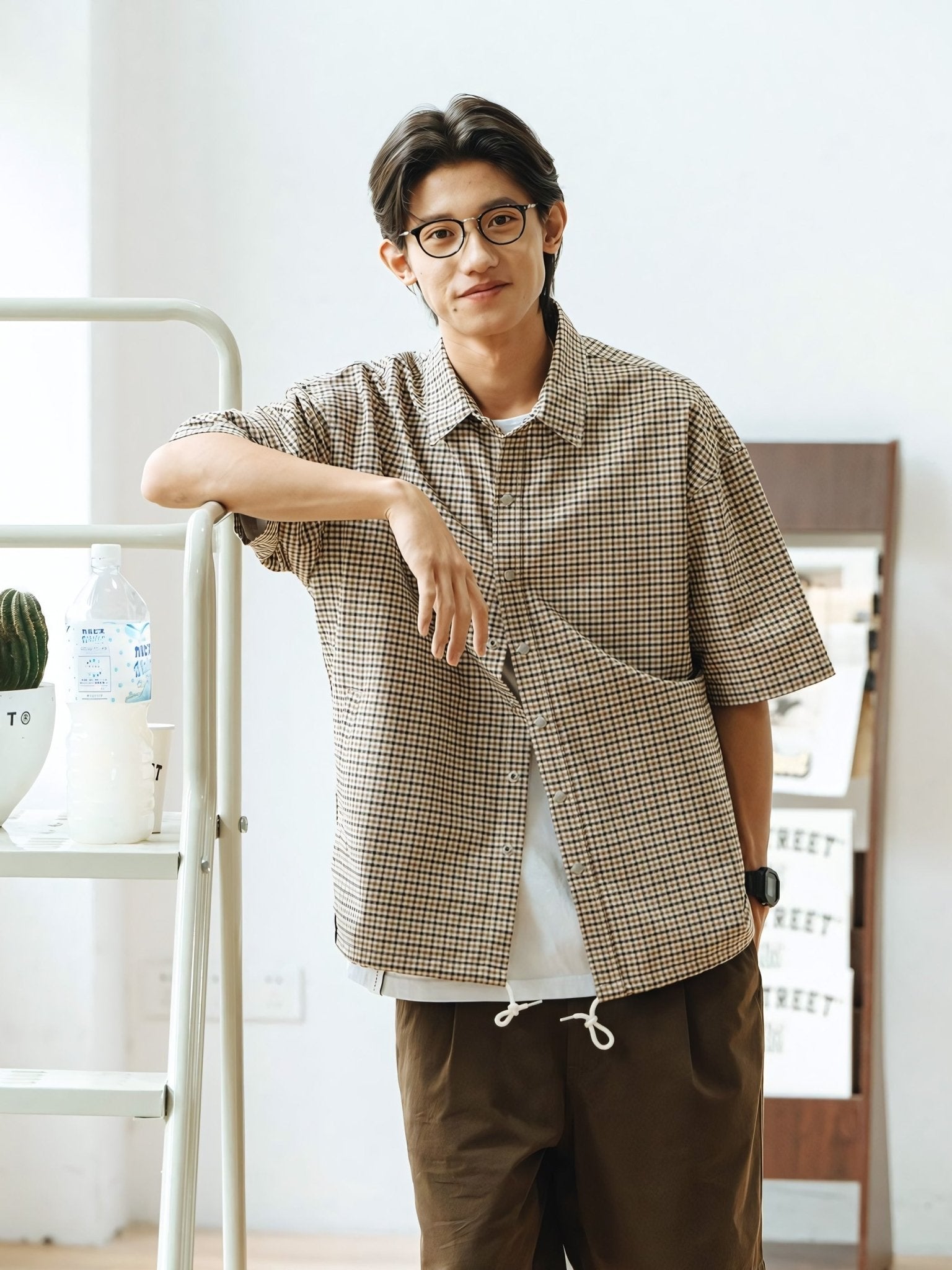 このシャツは千鳥格子模様の生地を使用し、ブラウンの格子がベースで、低彩度の黄色とベージュの格子を組み合わせ、軽やかなレトロなファッションを演出しています。全体のデザインは日本風のクラシックであり、リラックスした雰囲気が漂います。裾部分の白い紐のデザインは、カジュアルな要素を加えると同時に、適度な調整が可能で、シャツをより多様なスタイルに変えることができます。