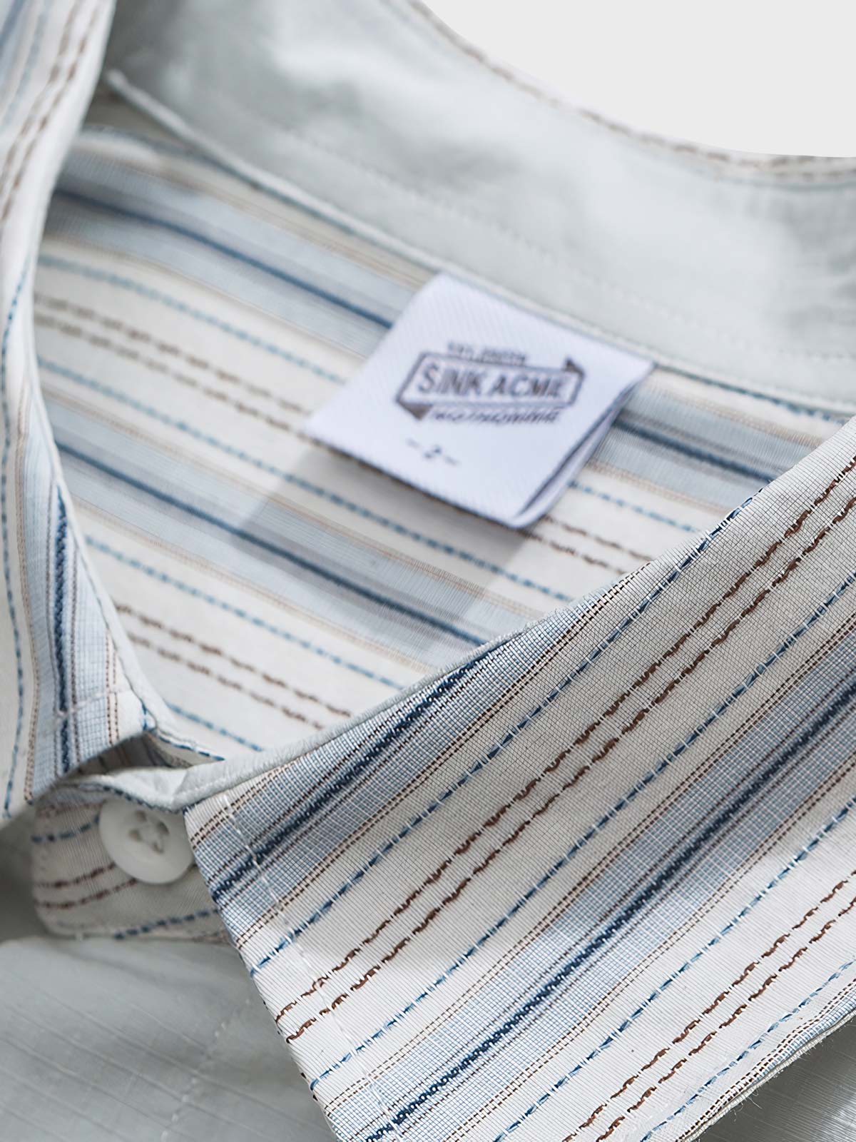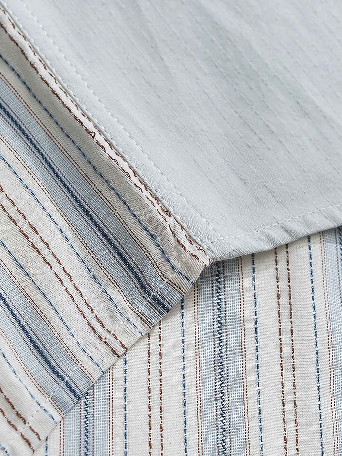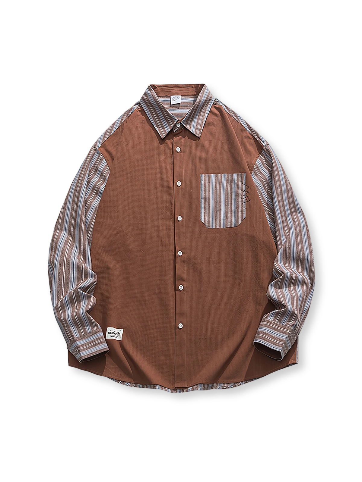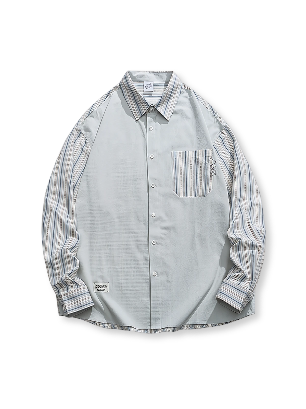 こちらは長袖のストライプパッチワークデザインが特徴のシャツです。異なるストライプ柄の布地を使用することで、独特の視覚効果を生み出しており、現代的な感覚を取り入れたクラシックなスタイルを提案しています。フロントのポケットはストライプ柄で、さりげないアクセントになっています。