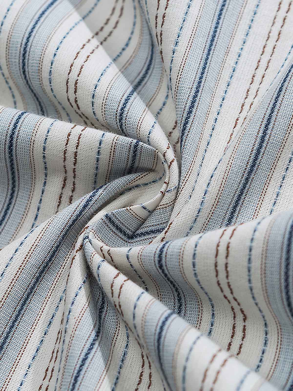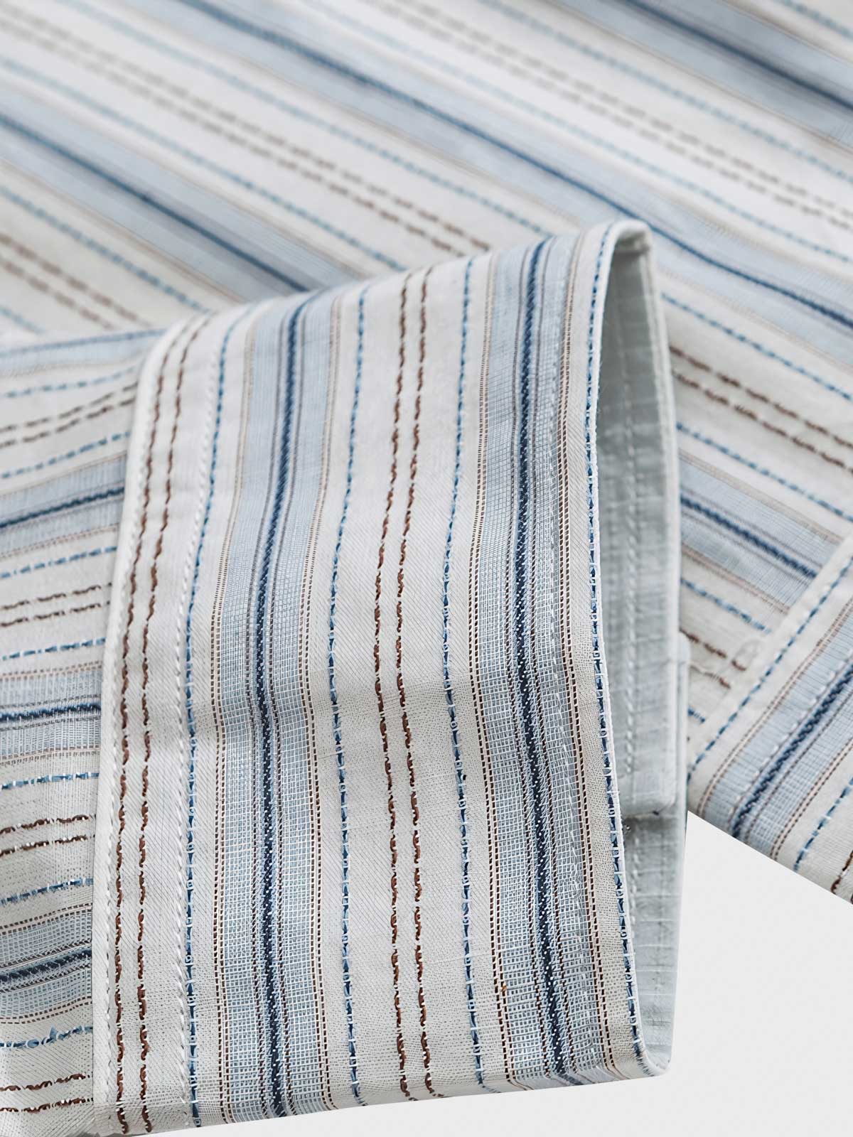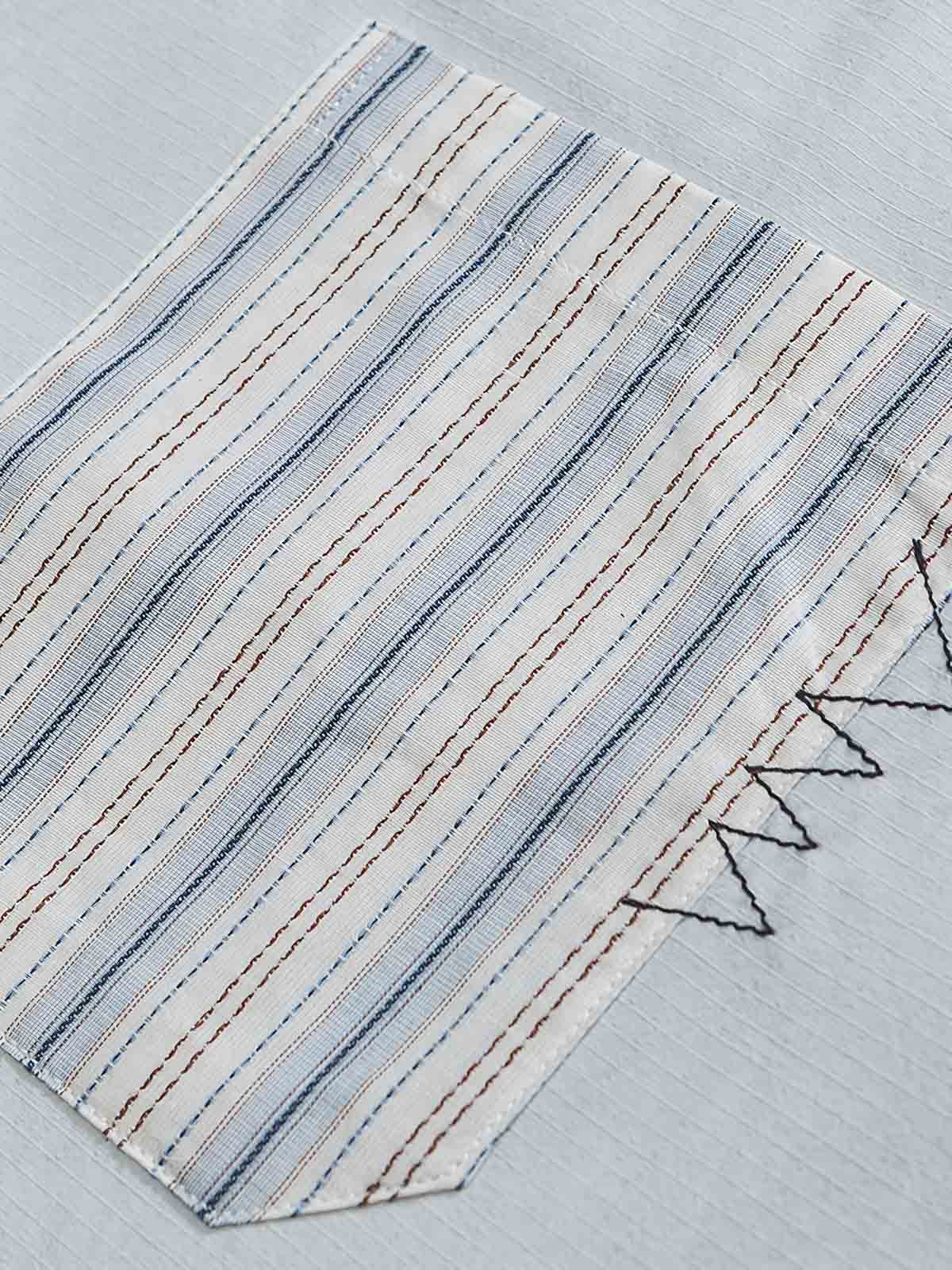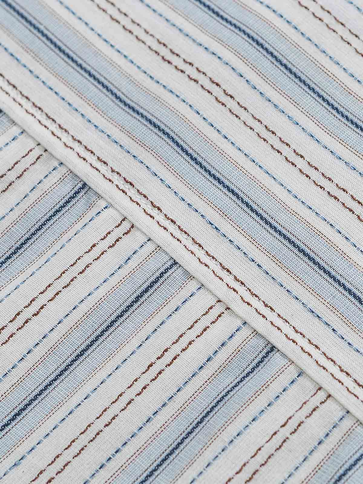 こちらは長袖のストライプパッチワークデザインが特徴のシャツです。異なるストライプ柄の布地を使用することで、独特の視覚効果を生み出しており、現代的な感覚を取り入れたクラシックなスタイルを提案しています。フロントのポケットはストライプ柄で、さりげないアクセントになっています。