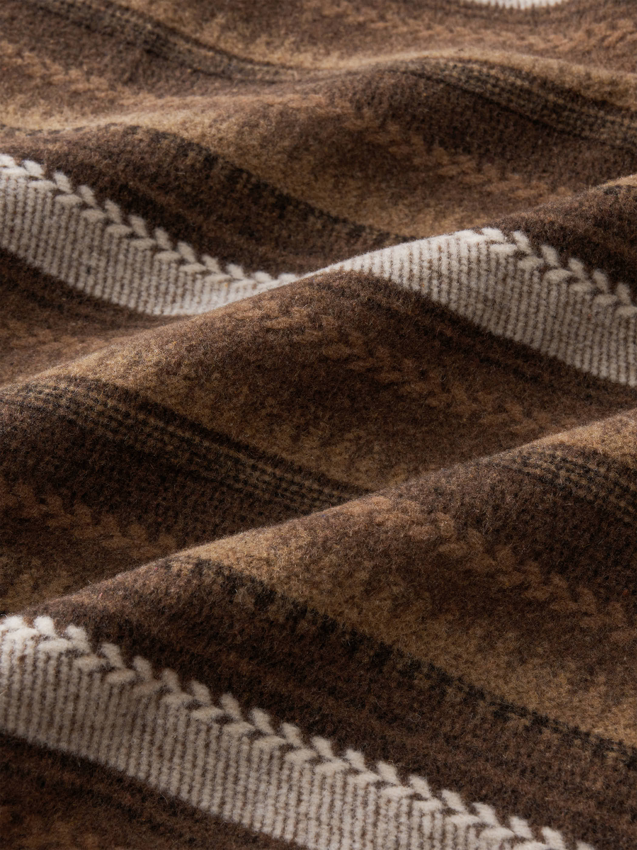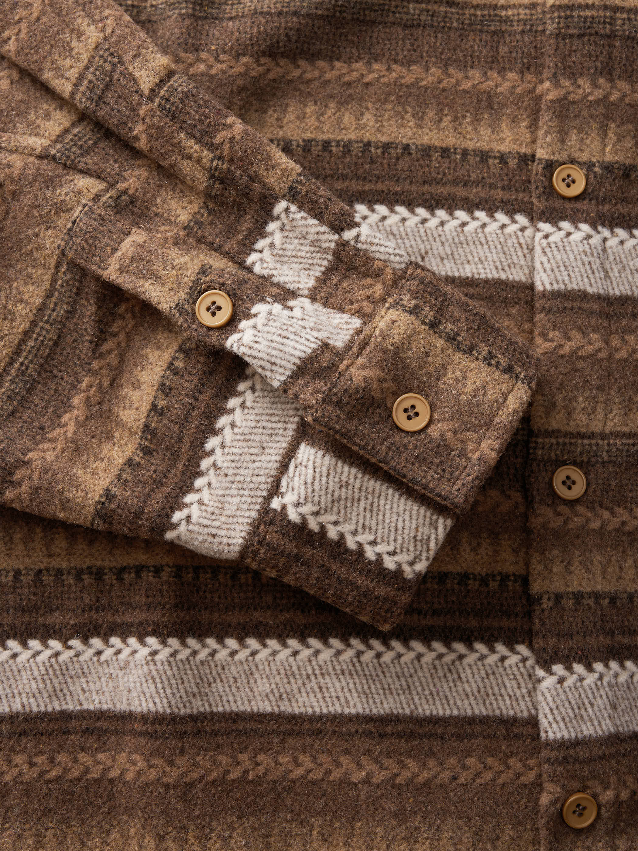 暖かみのある起毛感のある生地に、民族調の模様を配置している。ポリエステル100%で、標準的な生地の厚さを持っている。