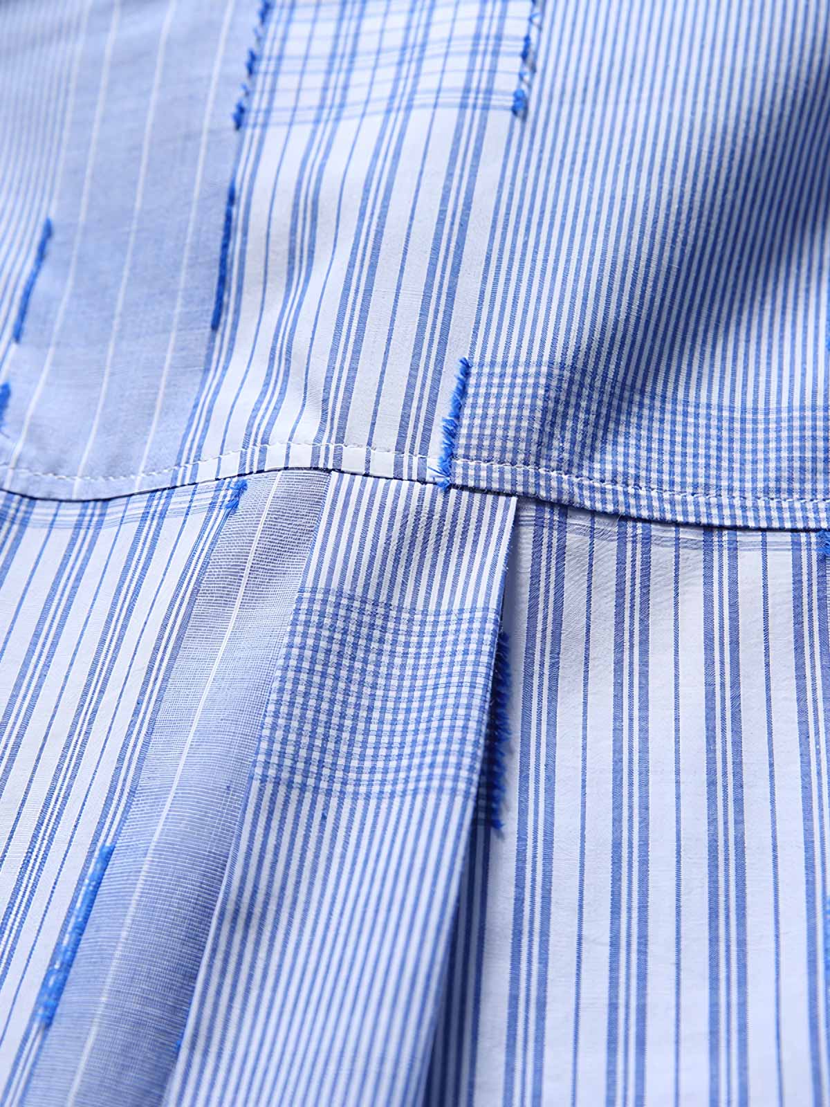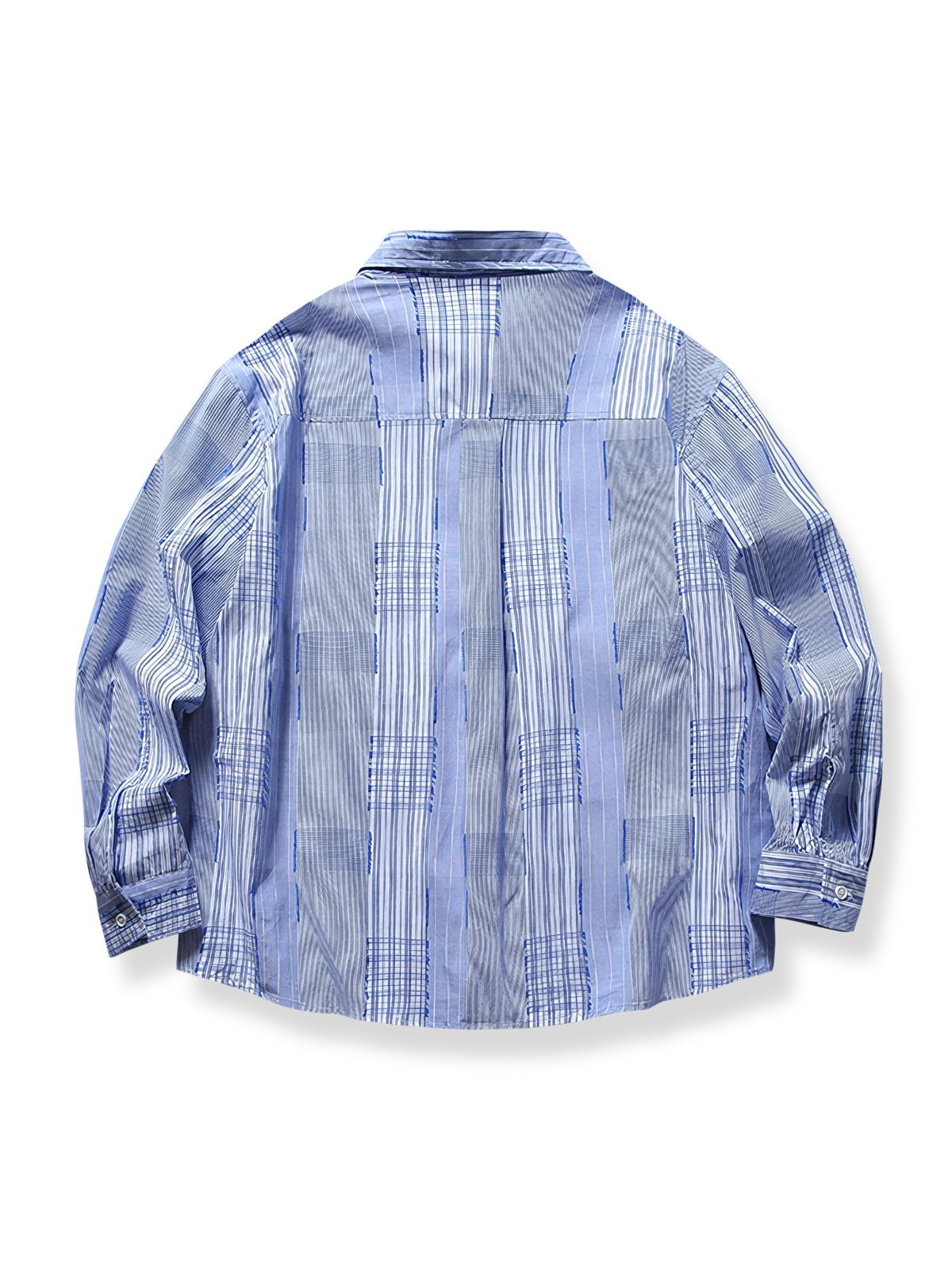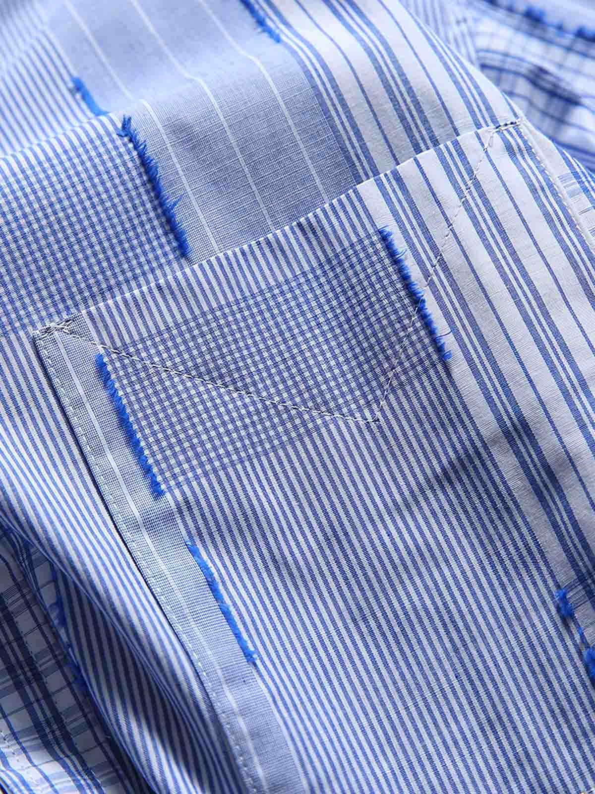 このシャツは、異なるチェックパターンと色合いの青を組み合わせたパッチワークデザインを採用し、現代アートのスタイルを表現しています。青とチェックの組み合わせは、男性のシャツデザインのクラシックな要素であり、その組み合わせは伝統と現代性を兼ね備えています。