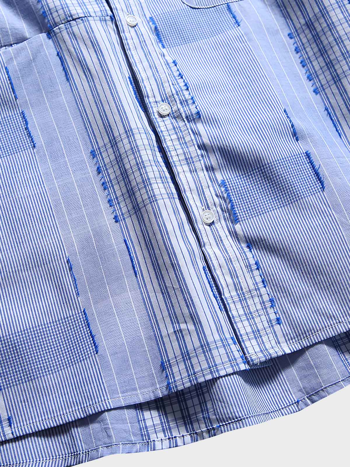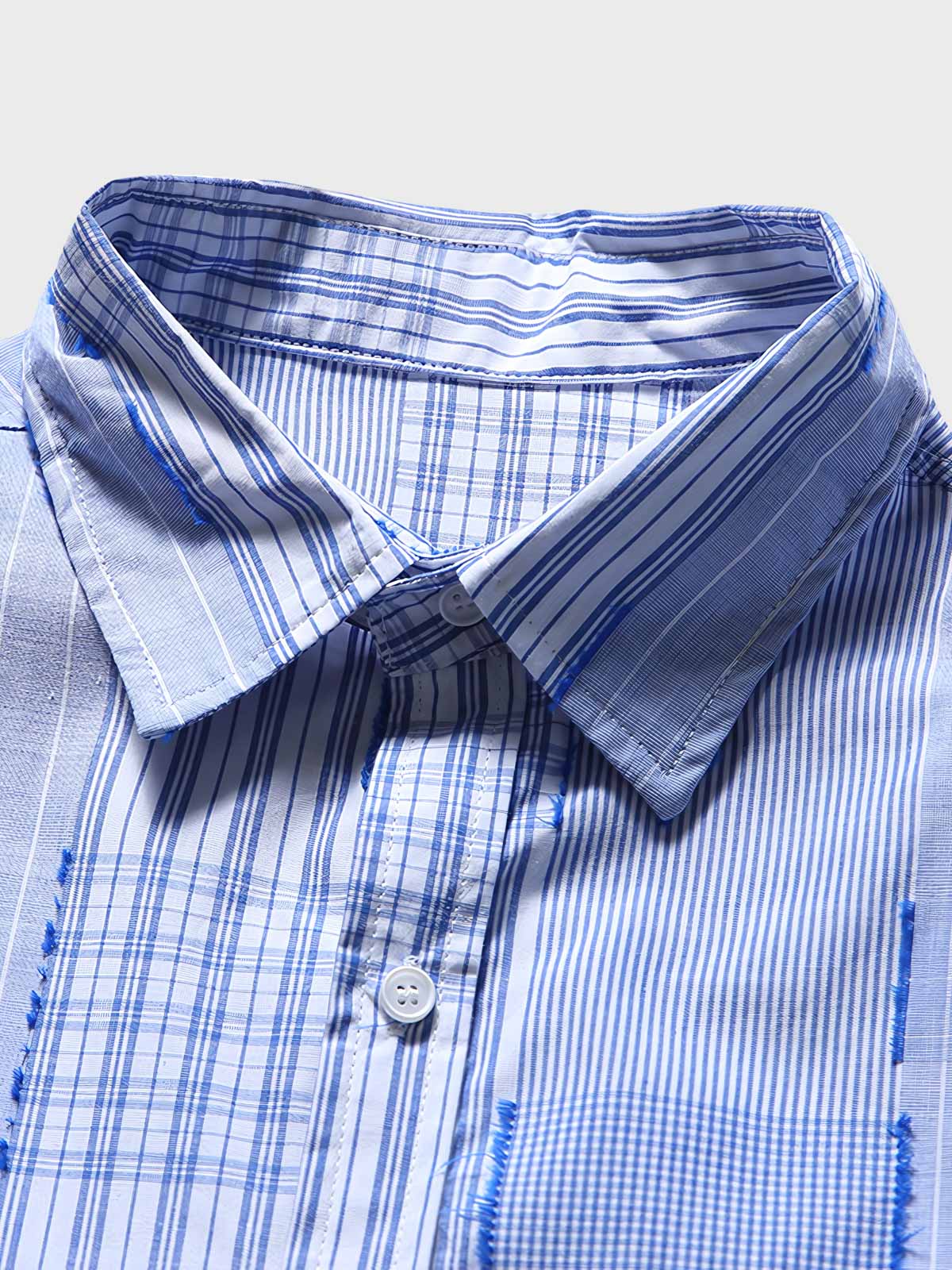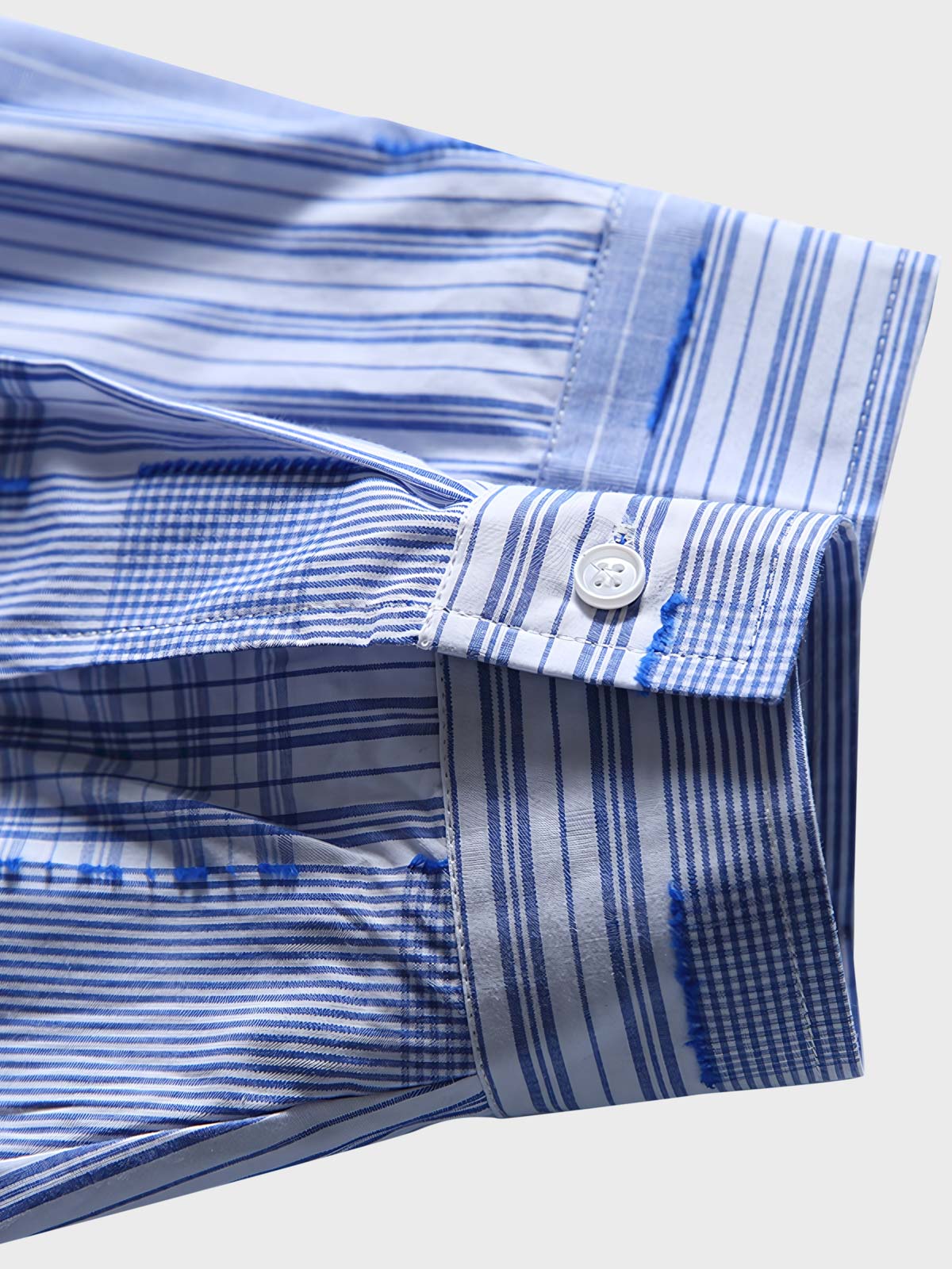 このシャツは、異なるチェックパターンと色合いの青を組み合わせたパッチワークデザインを採用し、現代アートのスタイルを表現しています。青とチェックの組み合わせは、男性のシャツデザインのクラシックな要素であり、その組み合わせは伝統と現代性を兼ね備えています。