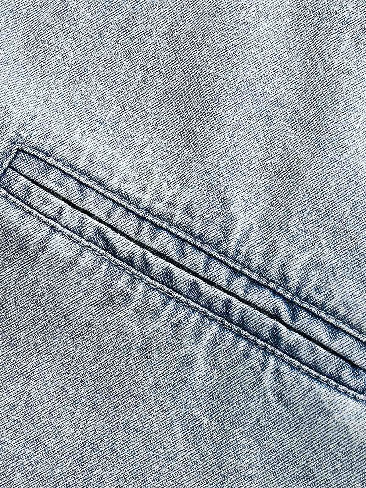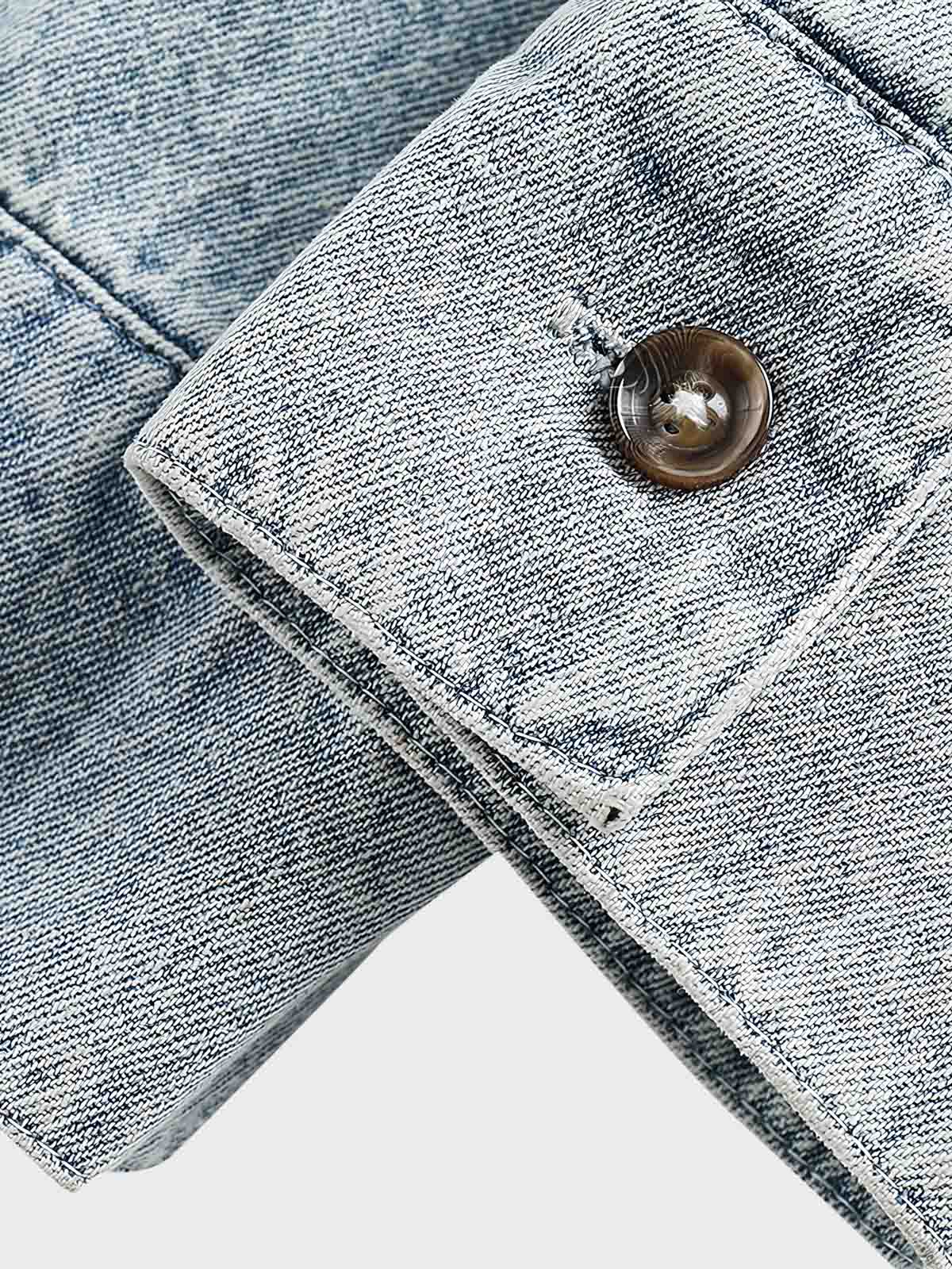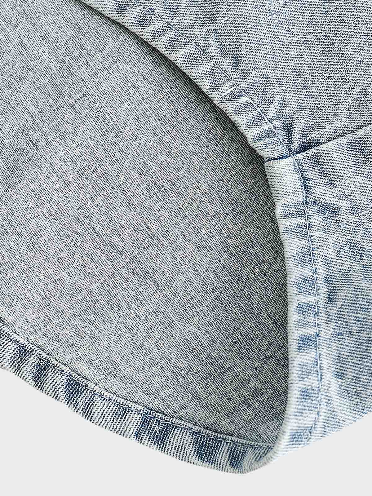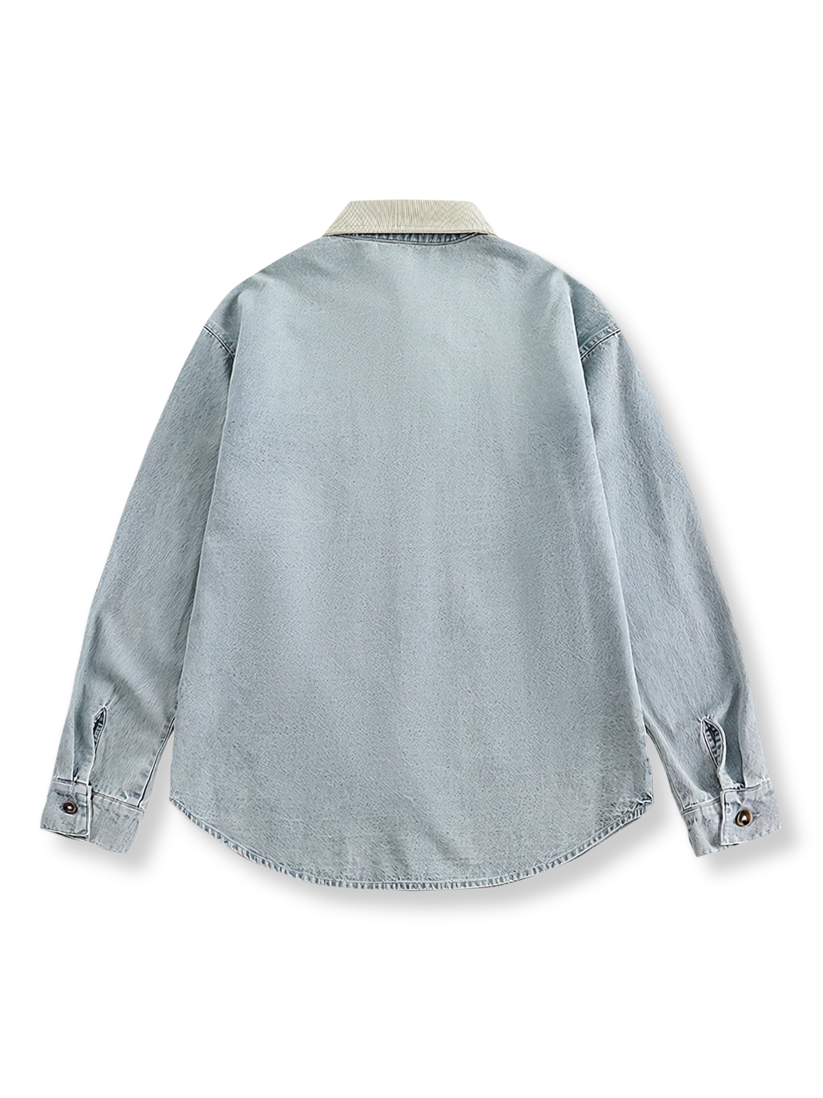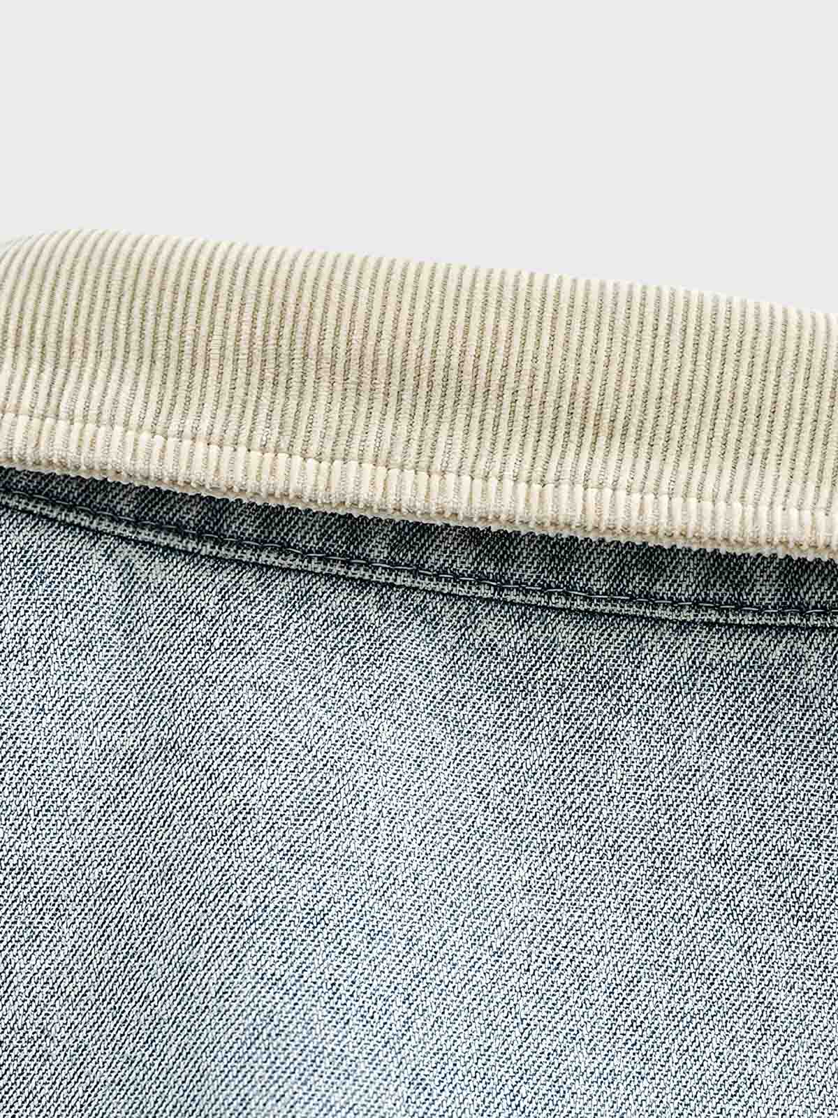 このシャツは、ヴィンテージ風のウォッシュ加工デニム素材を使用し、コントラストカラーの襟元のデザインで、レトロなワークウェアの粗野さとディテールのおしゃれさを両立しています。デニム素材とウォッシュ加工は西部のカウボーイ服の歴史を反映しており、洗練された刺繍パターンは現代的なデザインを取り入れ、ファッション文化の進化を示しています。
