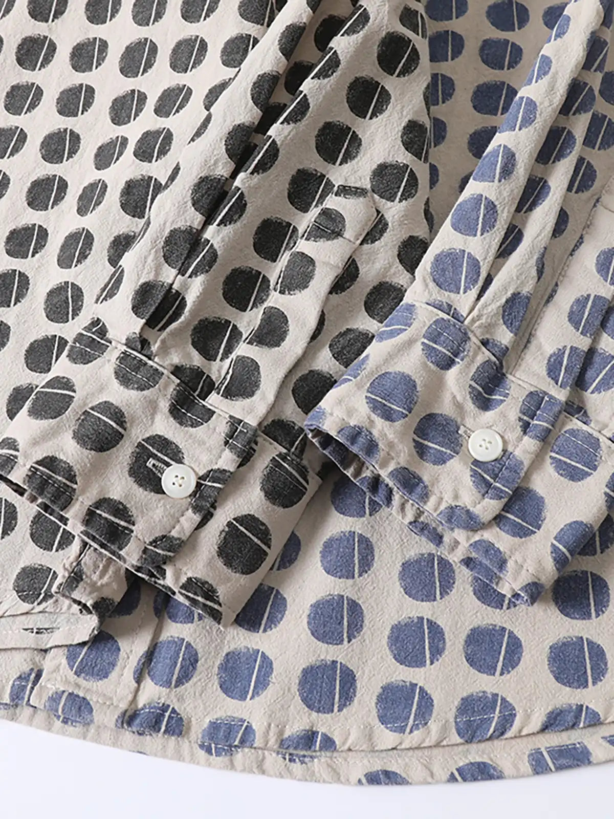 大きめドット柄が目を引く、コットン100%のカジュアル長袖シャツ。