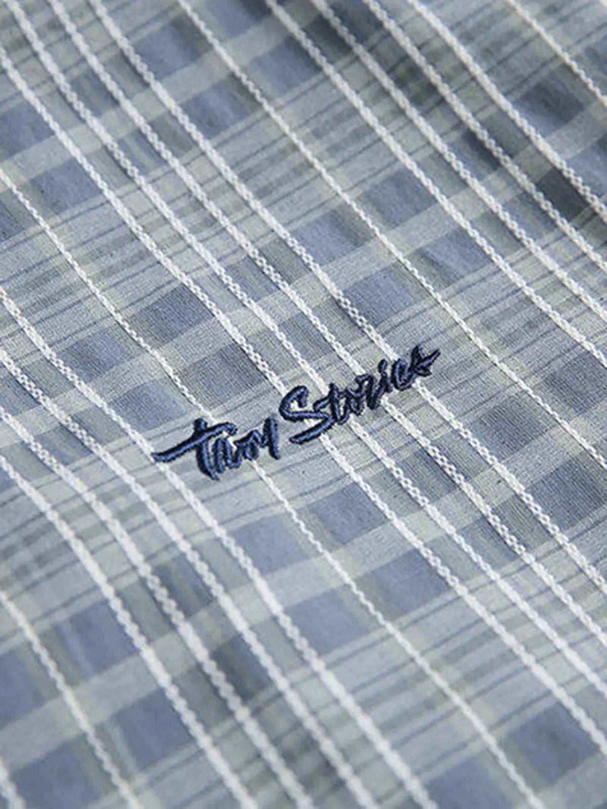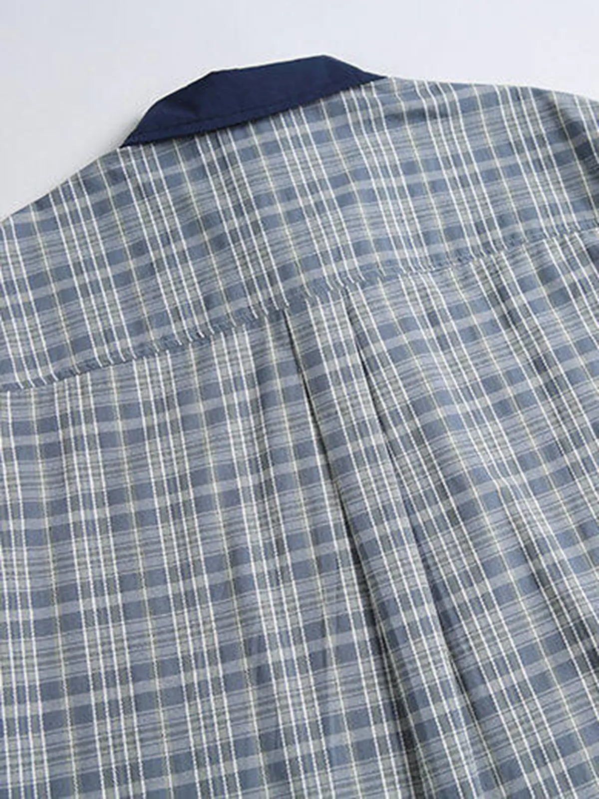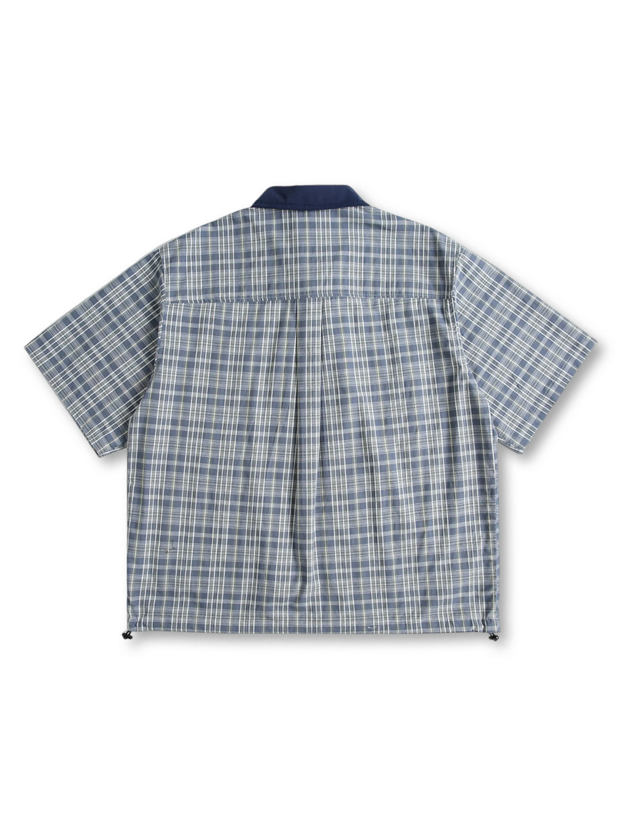 伝統的なワークウェアをモダンに再構築した、コントラストカラーの襟と機能的ディテールが光るショートスリーブシャツです。
