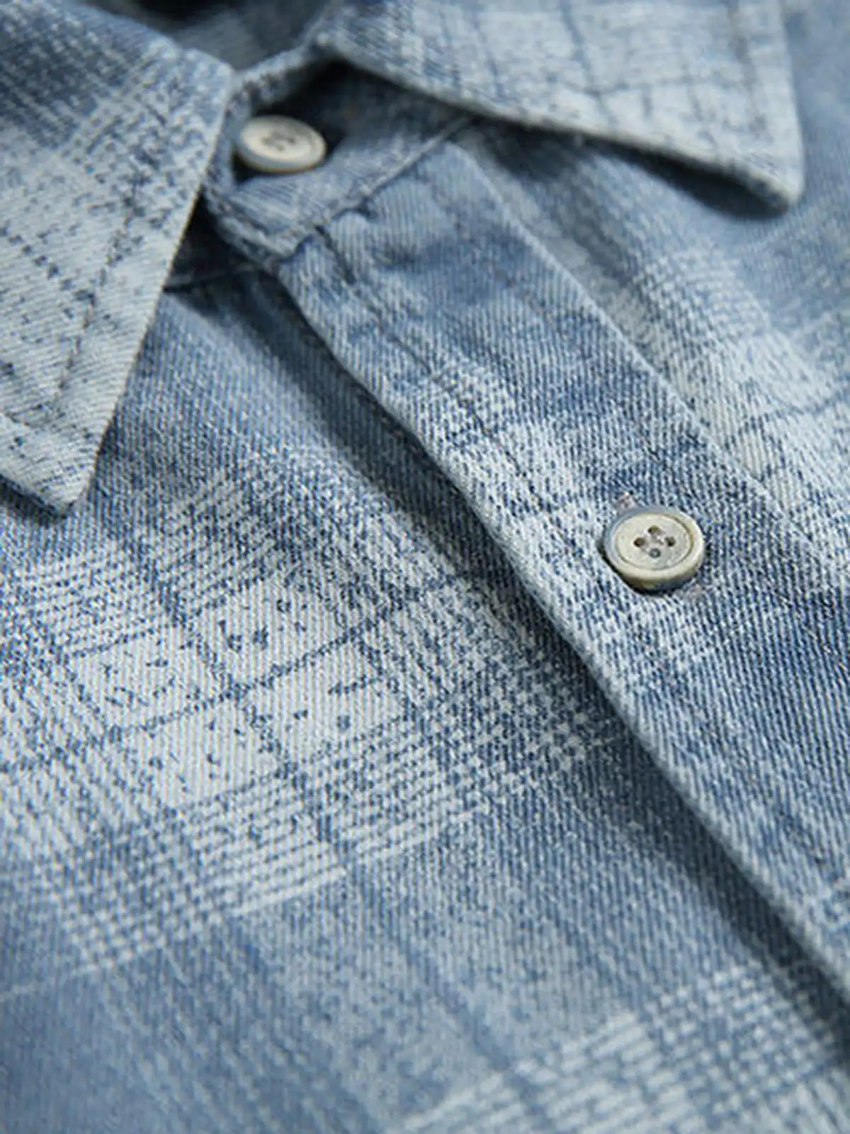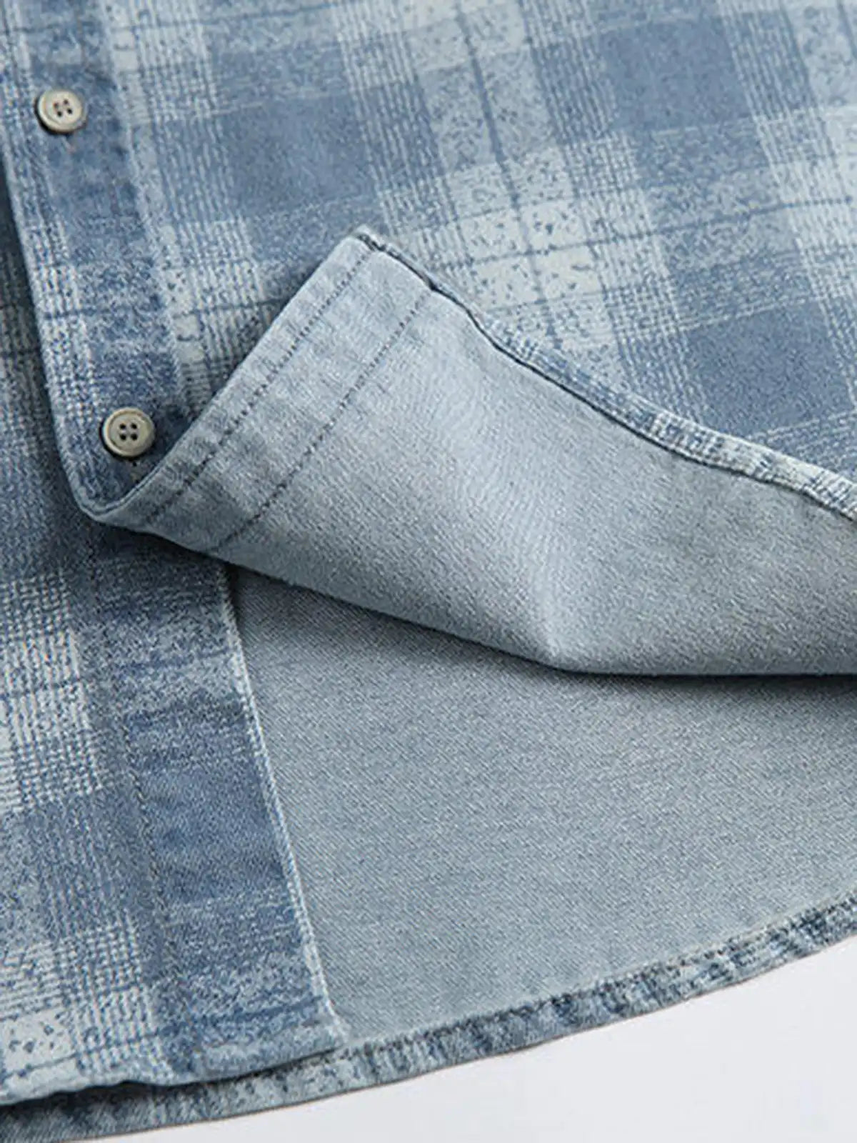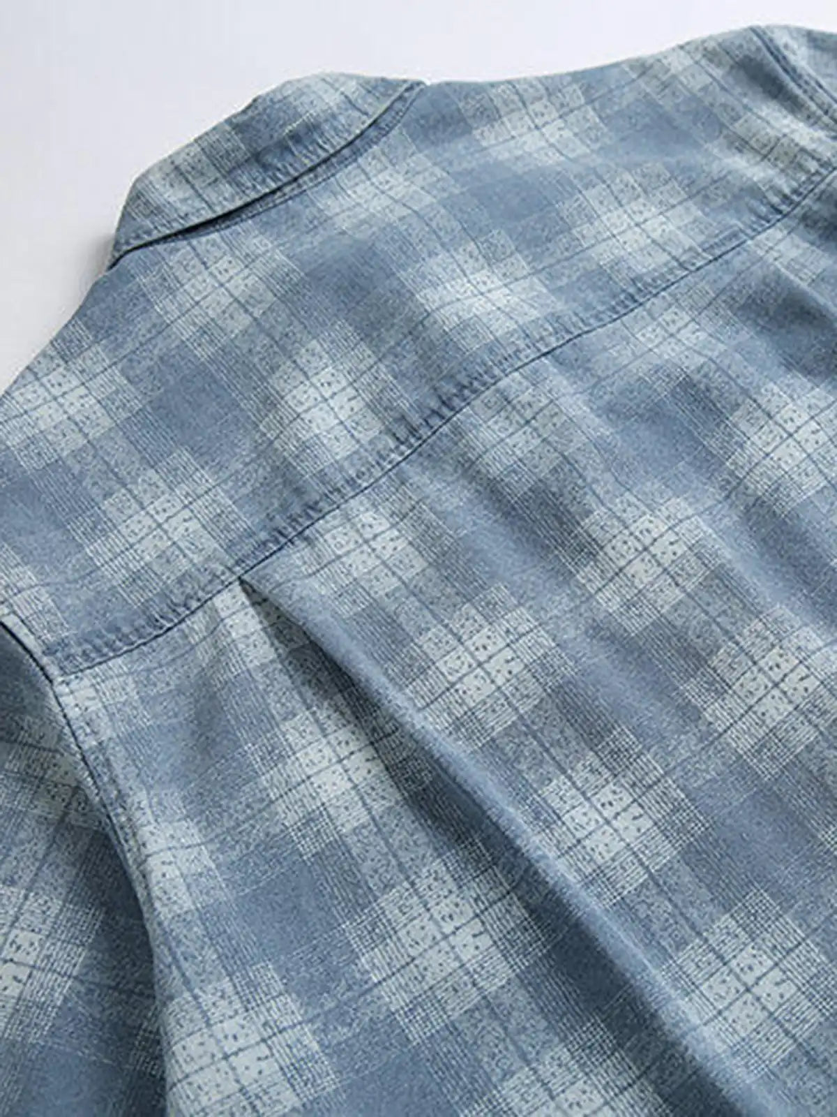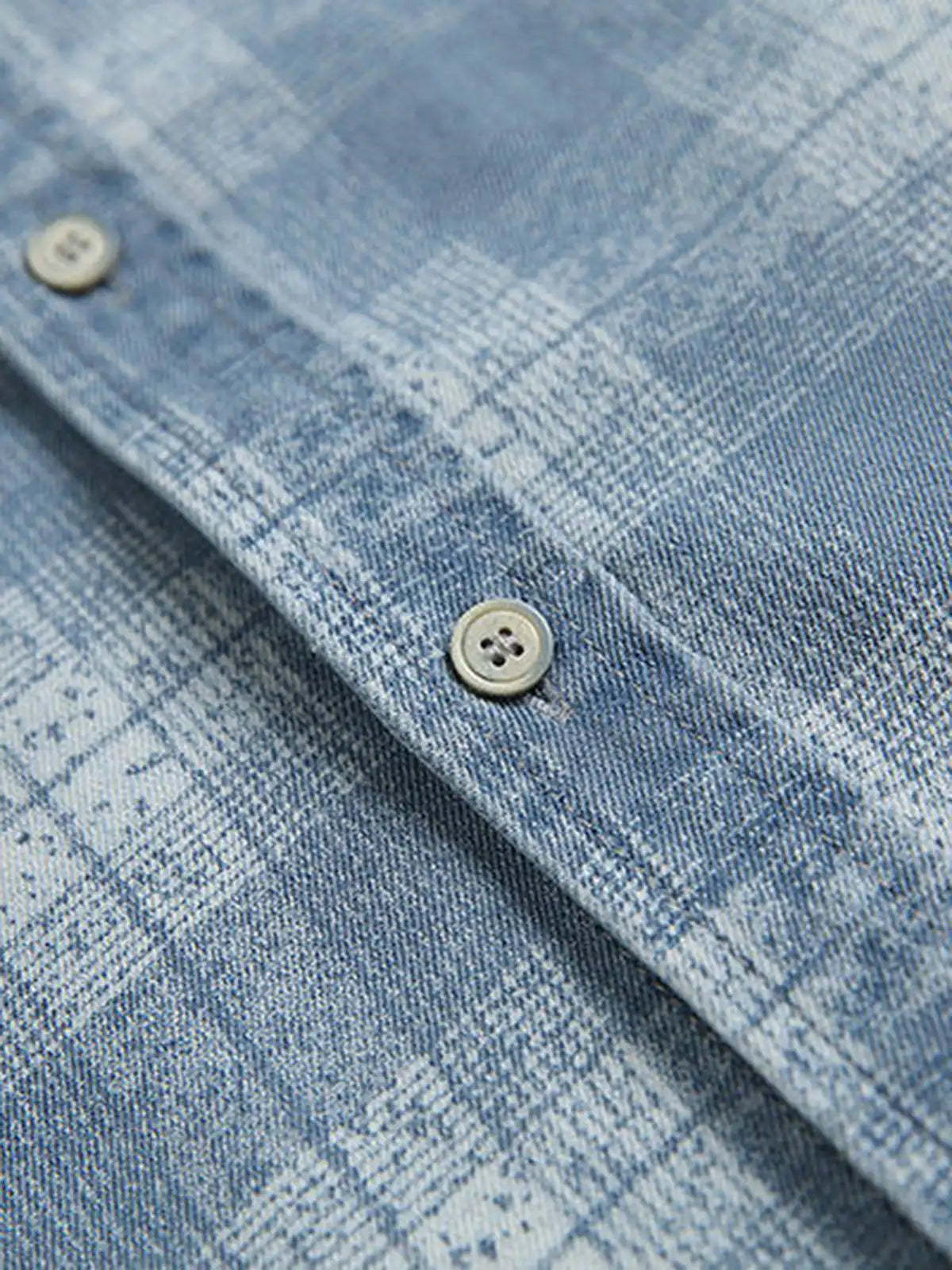 ヴィンテージライクなウォッシュド加工とチェック柄が映える100%コットンデニムの半袖シャツ。