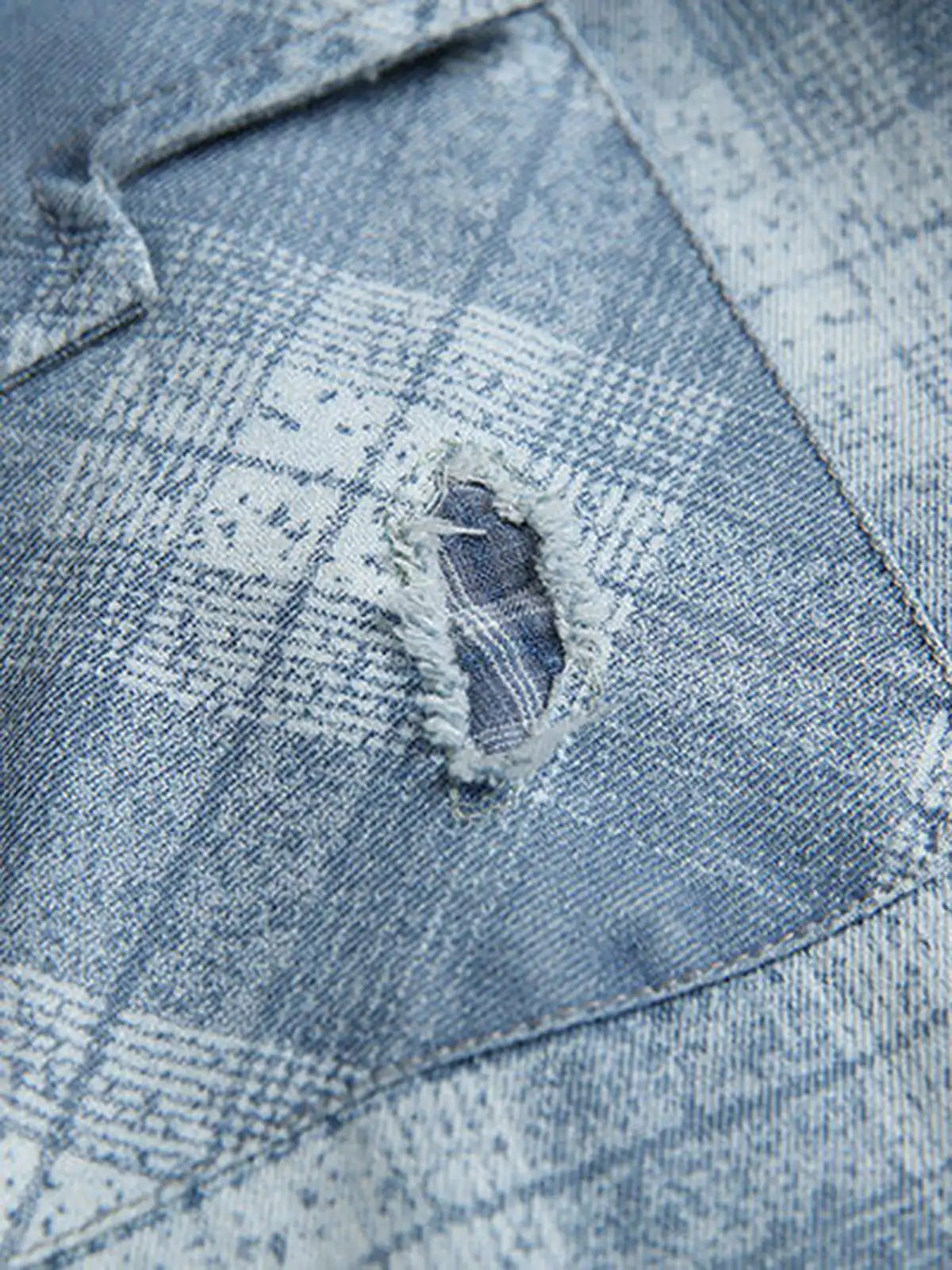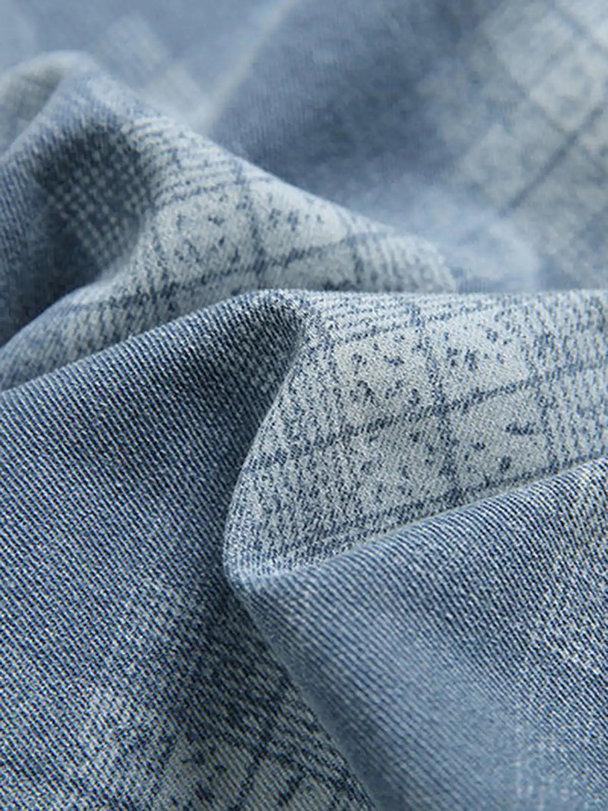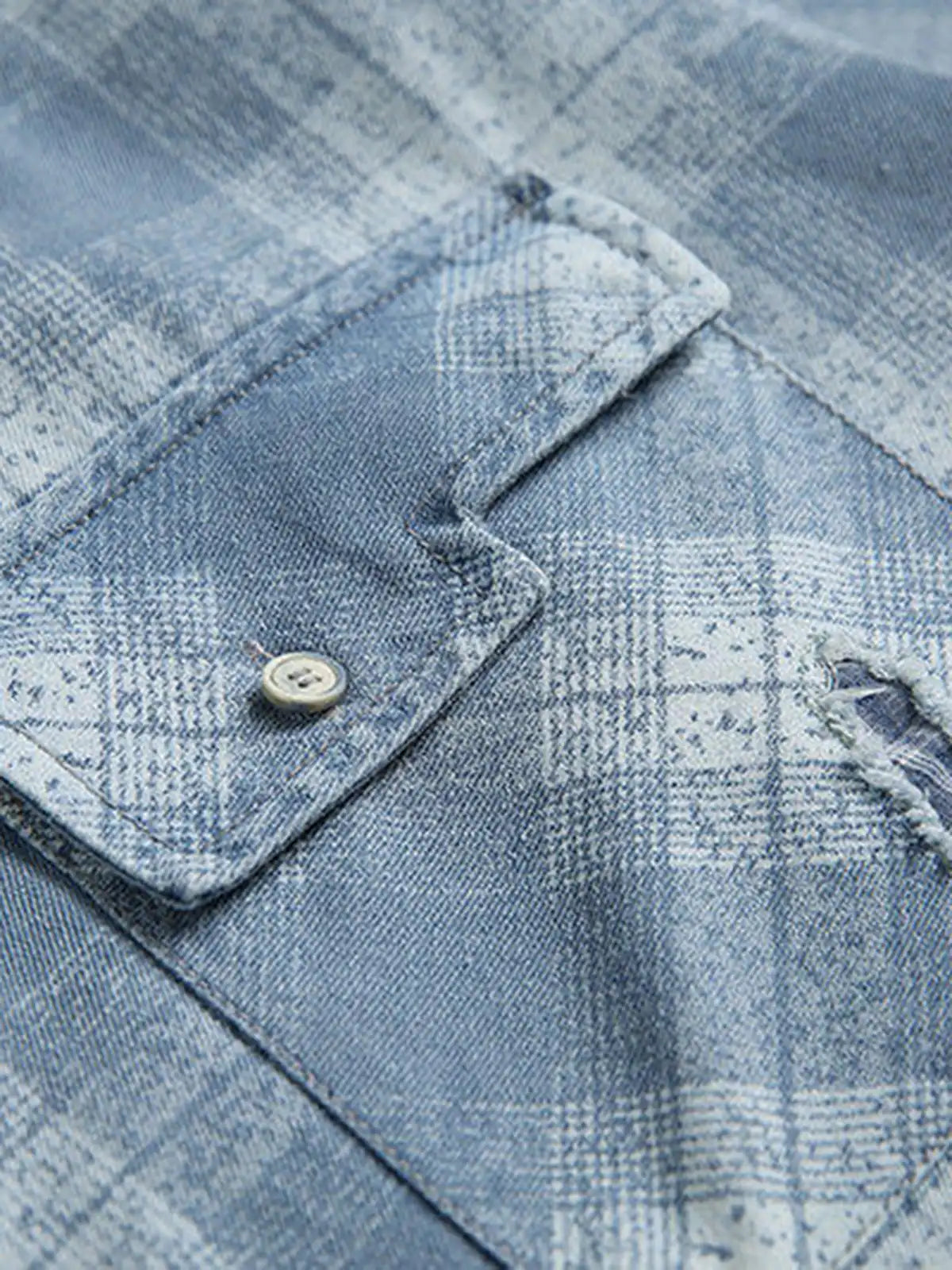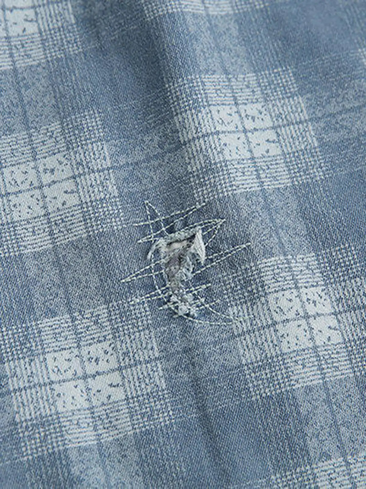 ヴィンテージライクなウォッシュド加工とチェック柄が映える100%コットンデニムの半袖シャツ。