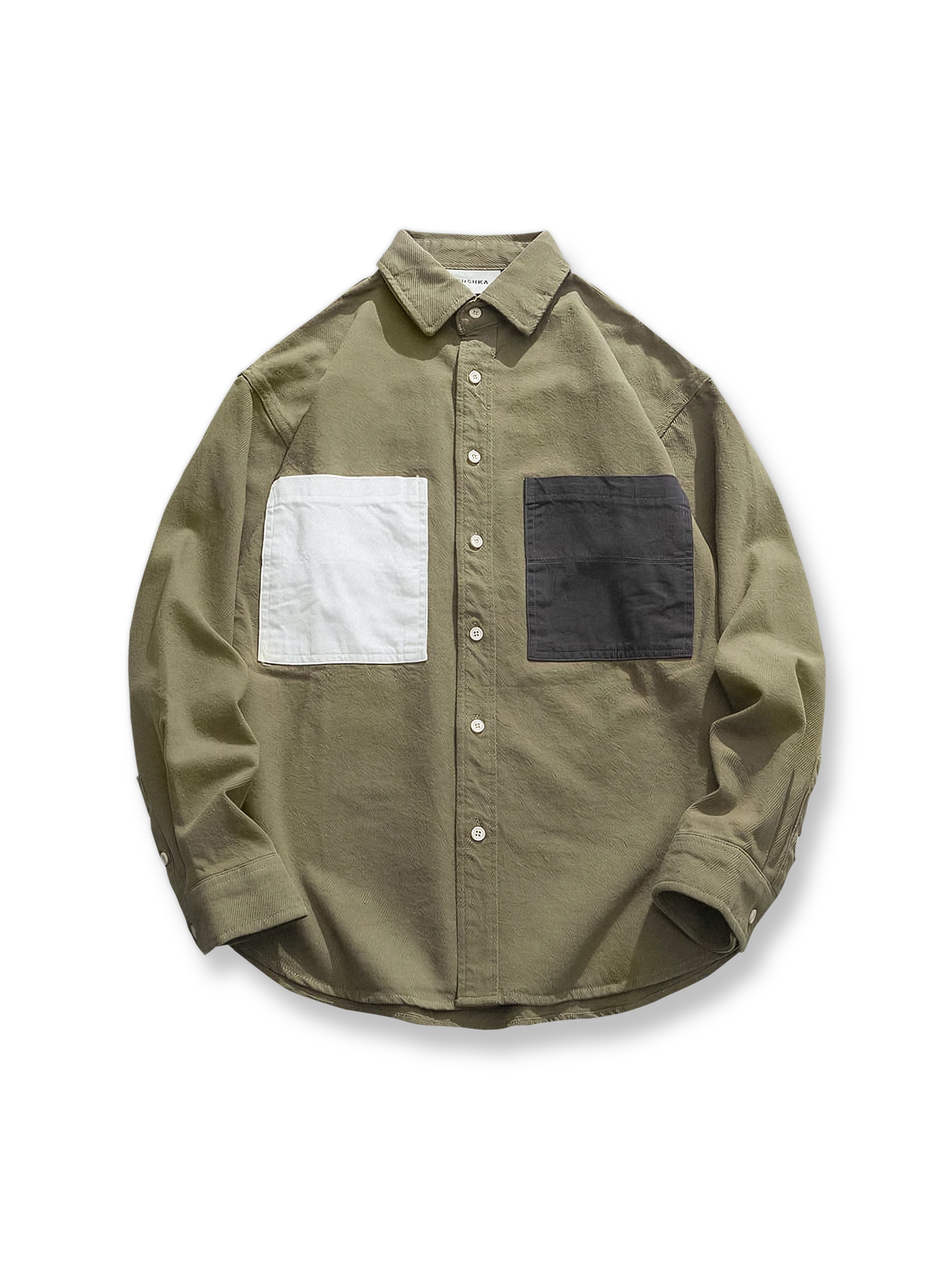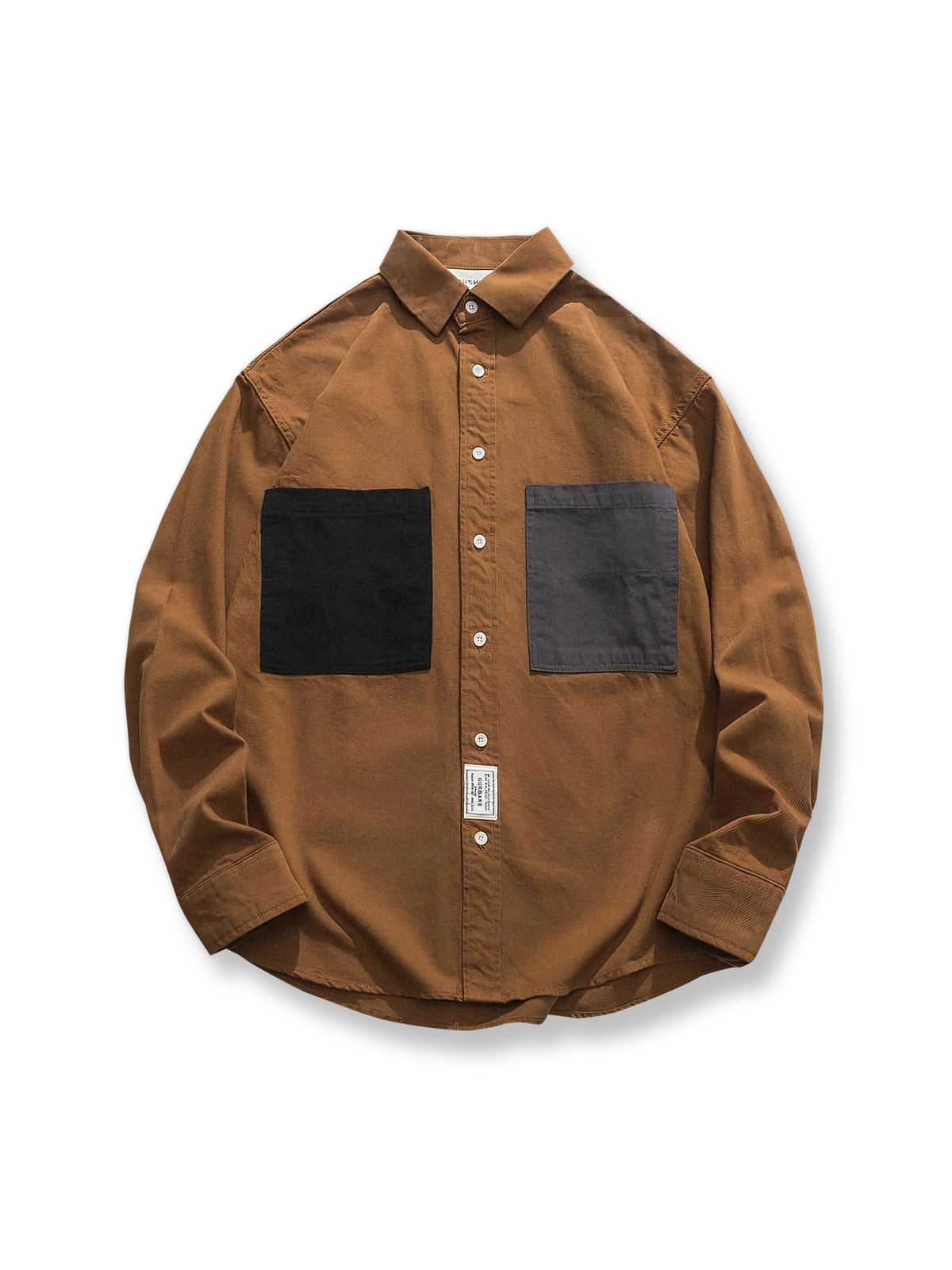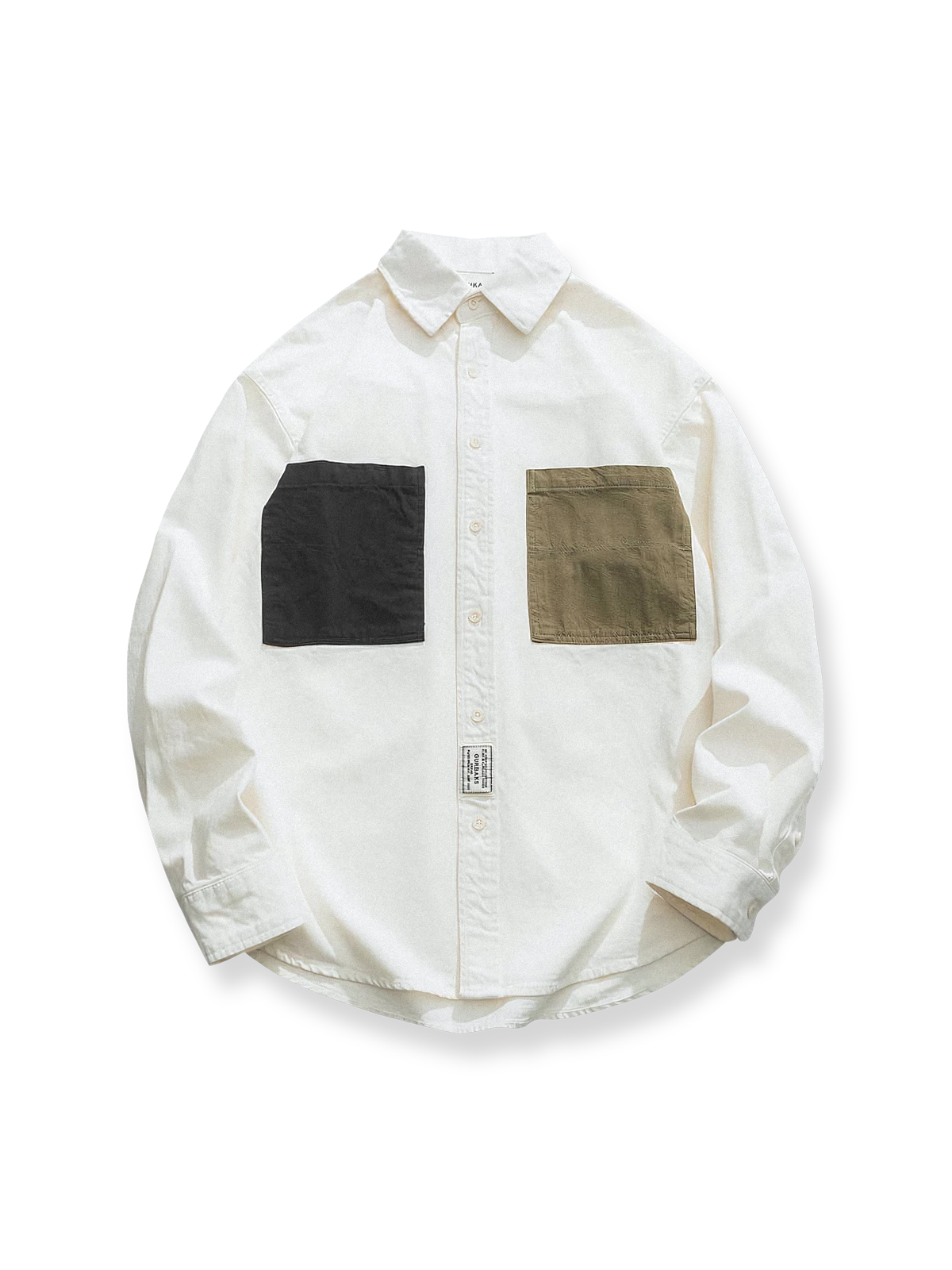 このワークシャツは、フロントの異なる色の大きなポケットが特徴で、シンプルなデザインに遊び心を加えています。