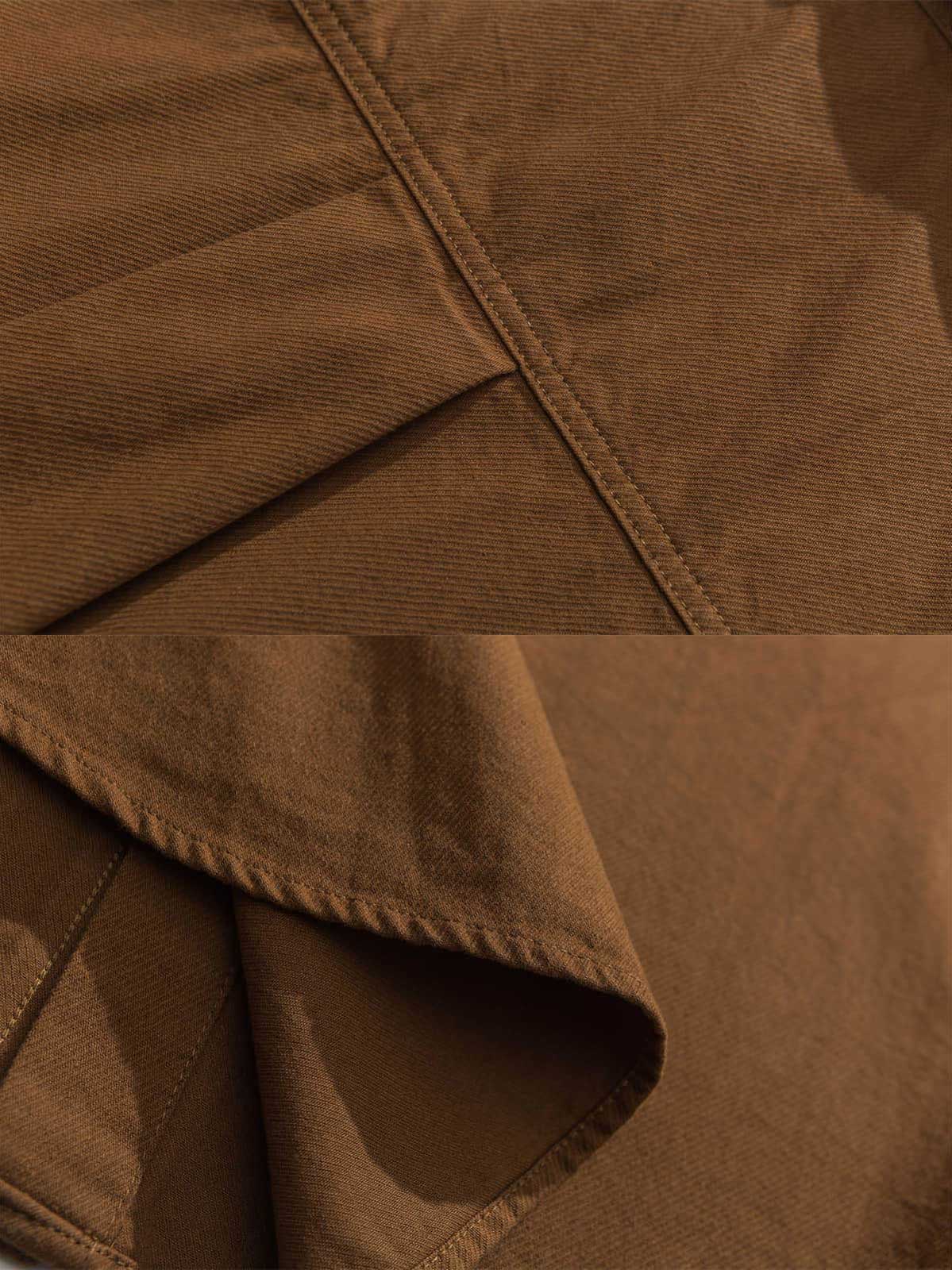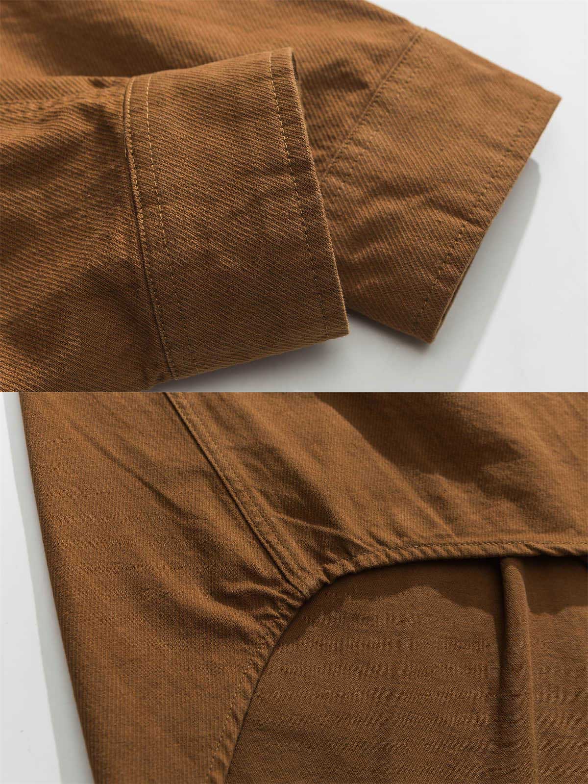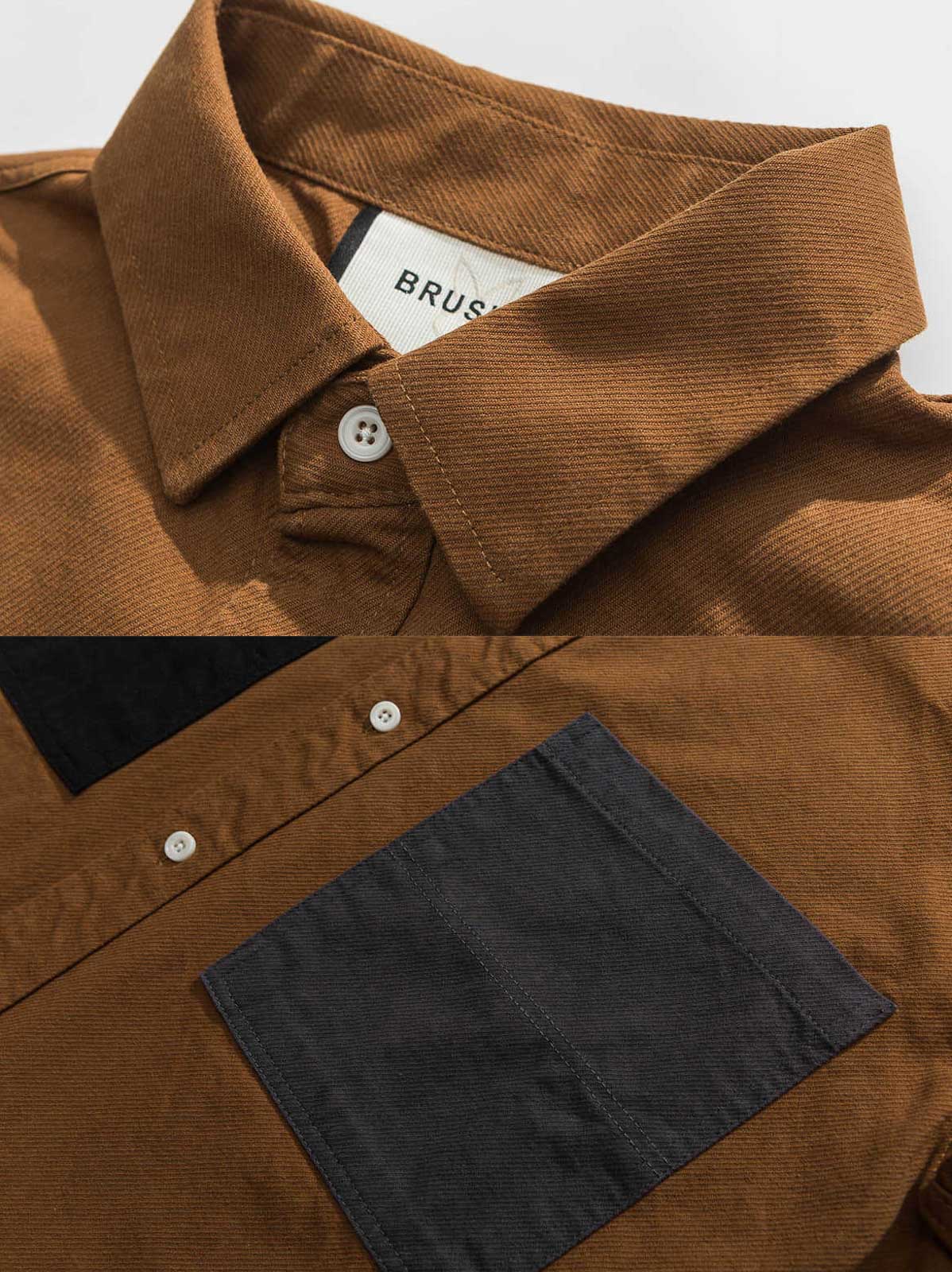 このワークシャツは、フロントの異なる色の大きなポケットが特徴で、シンプルなデザインに遊び心を加えています。