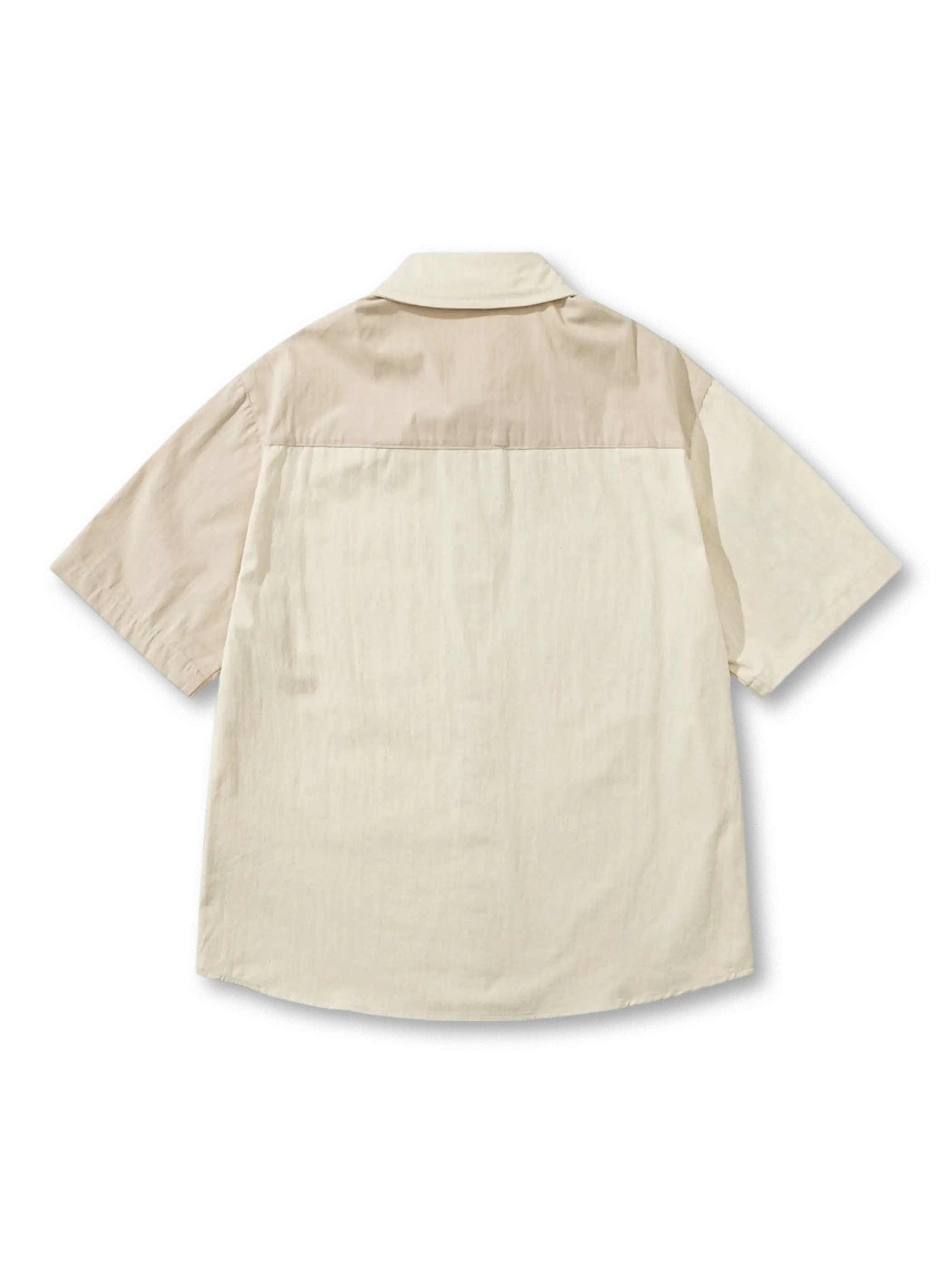異なるベージュトーンを組み合わせた日系ヴィンテージ感あふれるパネル切り替えシャツ。