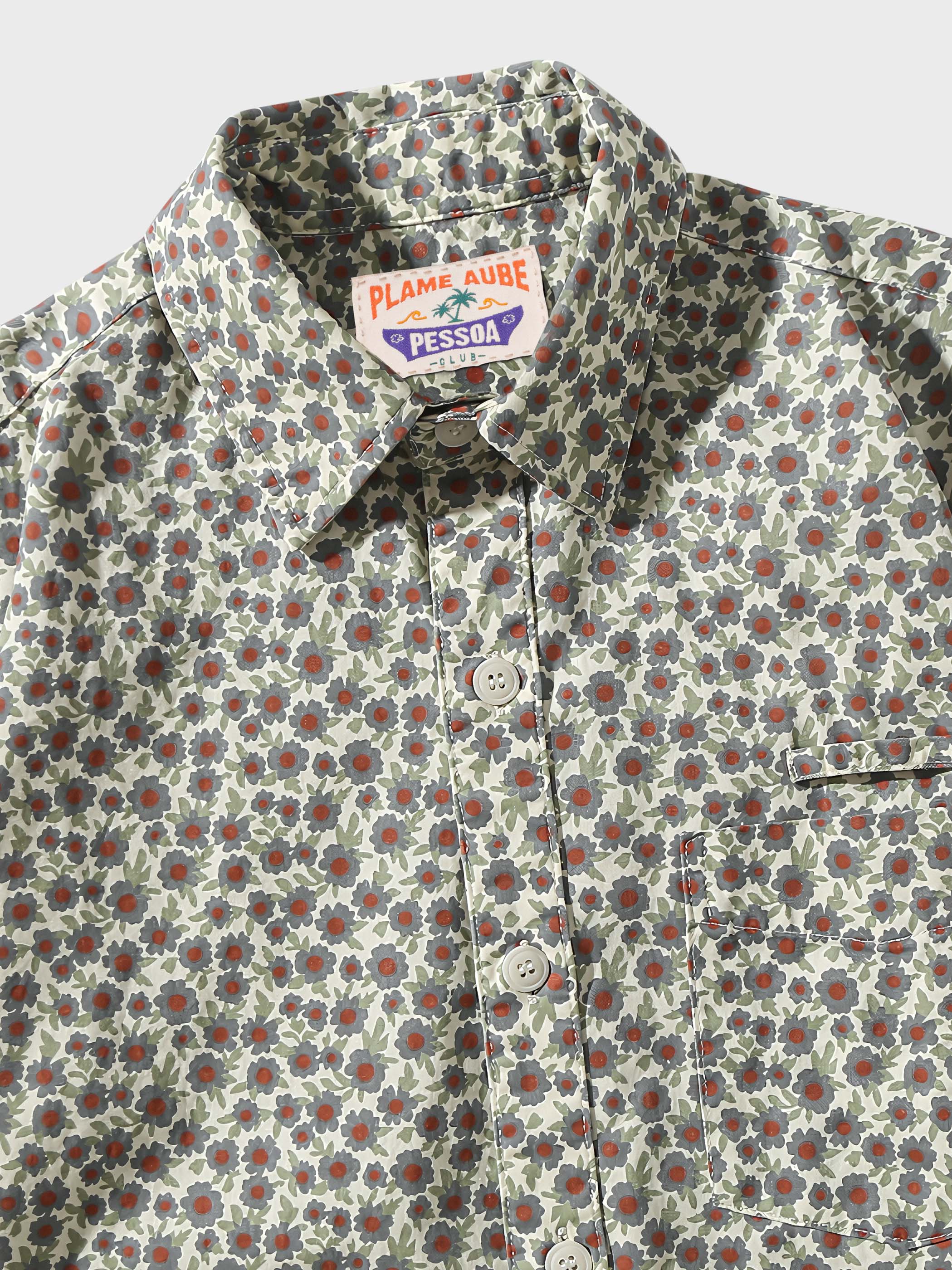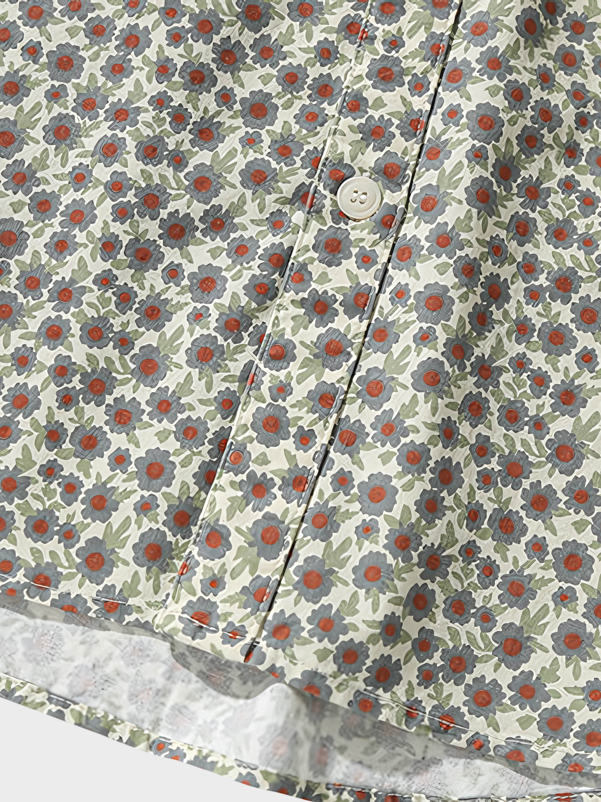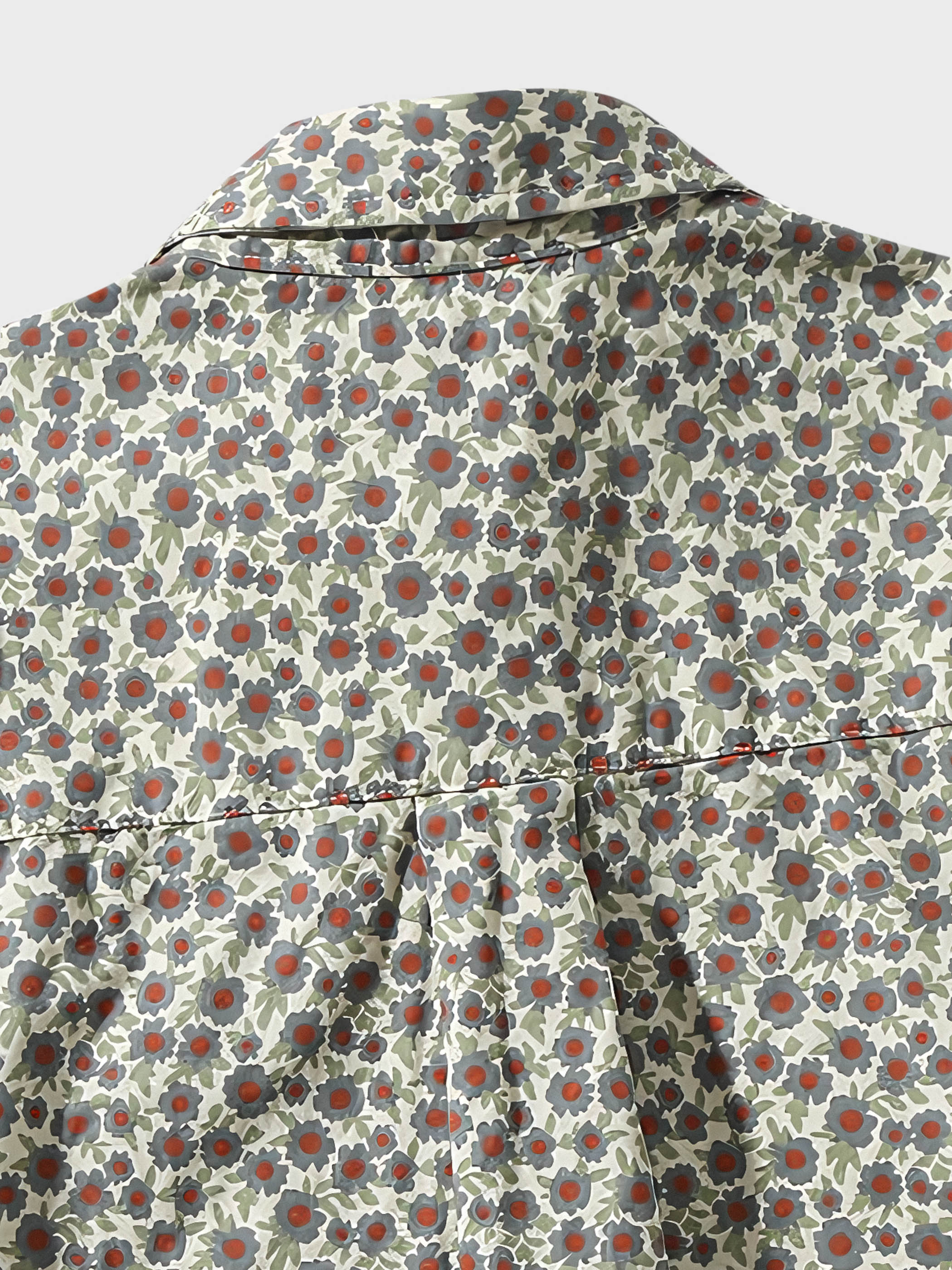 この花柄シャツは、清新なデザインで活力と若々しい雰囲気を表現しています。細かな花柄は過度に派手ではなく、リラックスした愉快な感覚を与えます。淡い緑色が主調で、清涼感と柔らかさを演出しています。