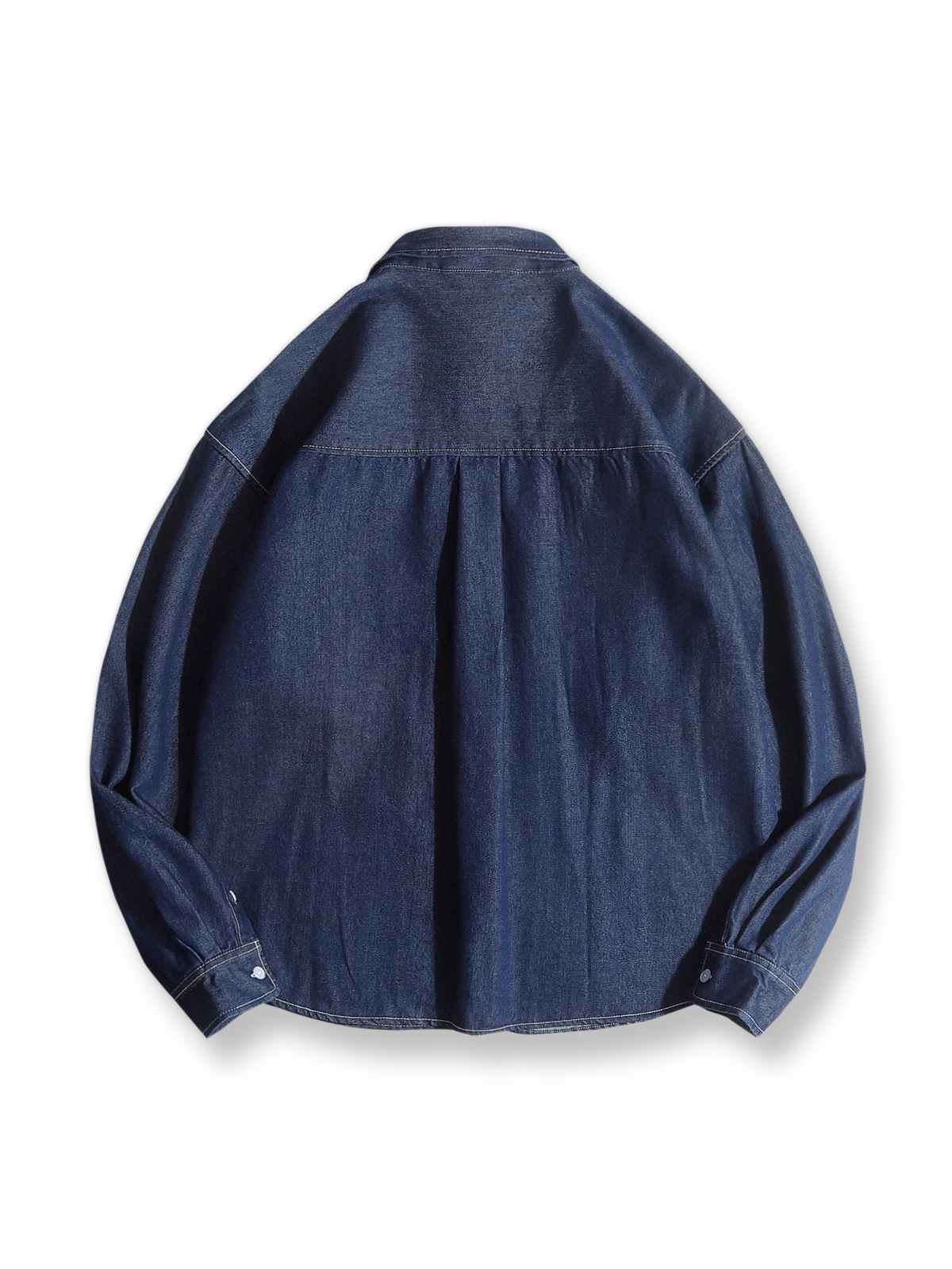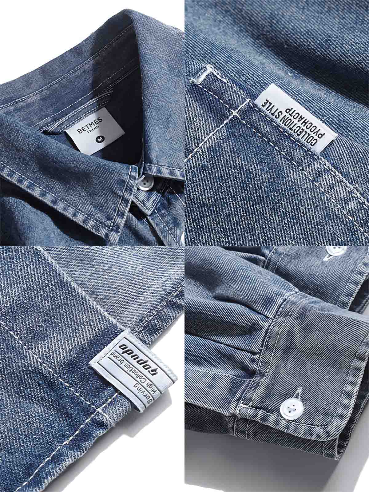 シャツの素材は高品質のデニムを使用し、ウォッシュ加工を施しており、生地表面は独特の色合いと質感を呈しています。白いボタンと濃色デニムの対比は視覚的効果を強化し、シンプルだが凝ったデザインコンセプトを際立たせています。
