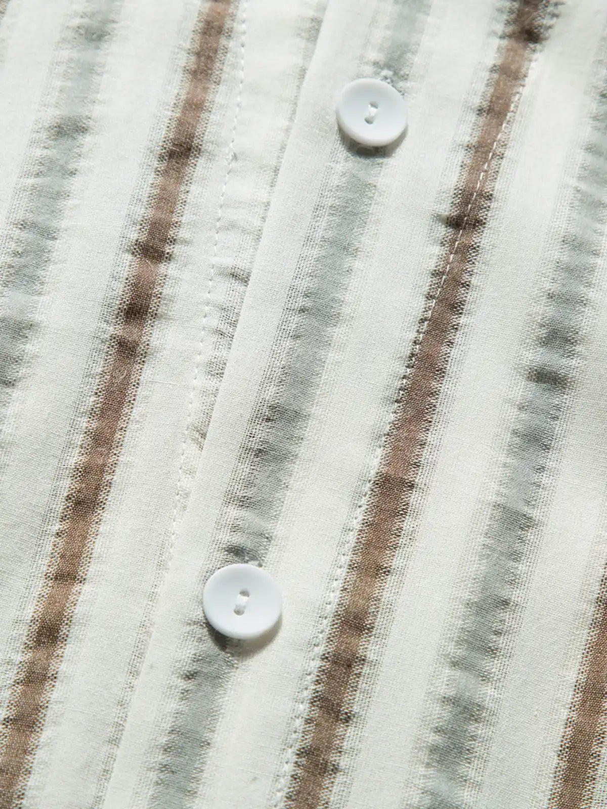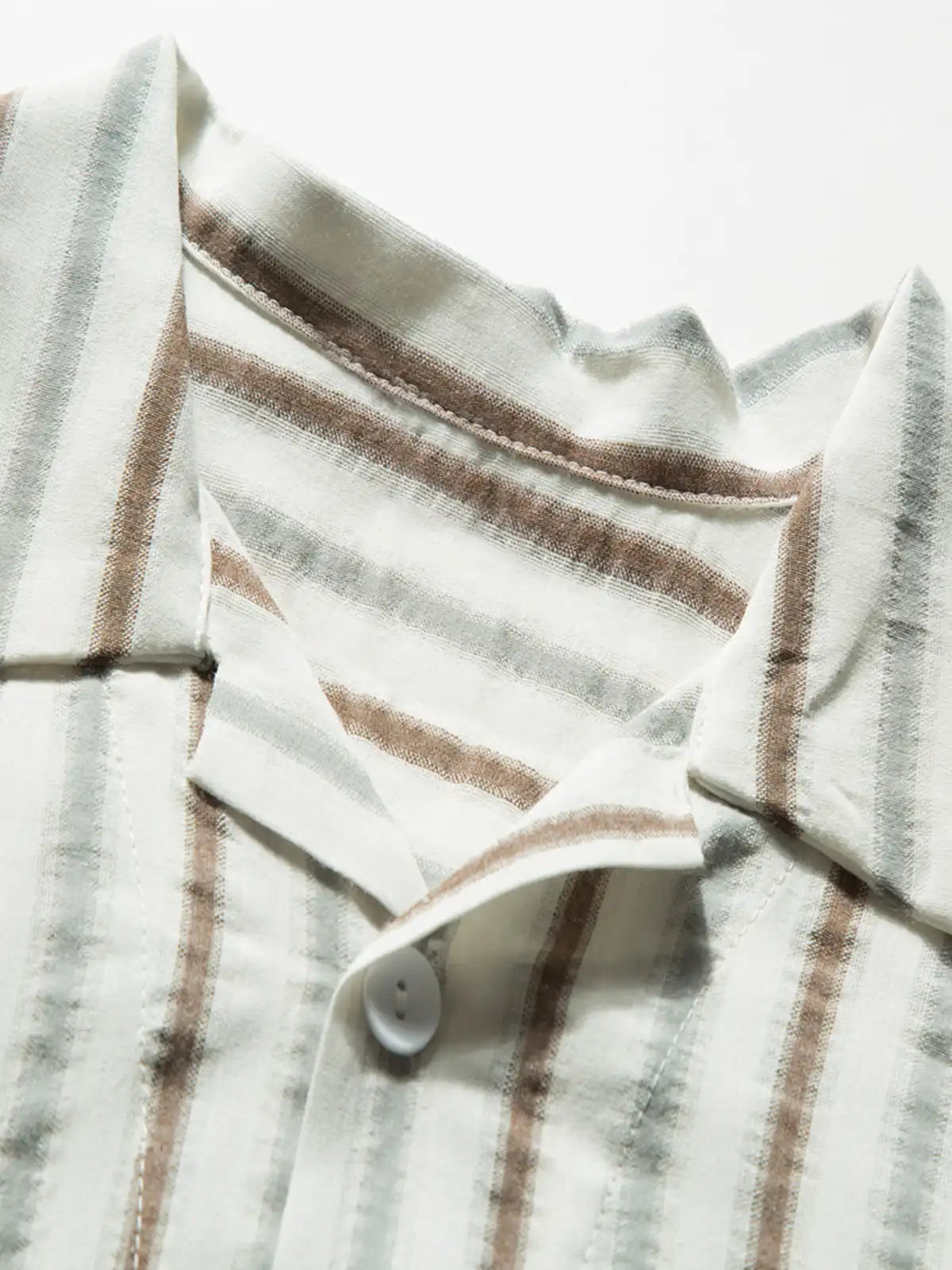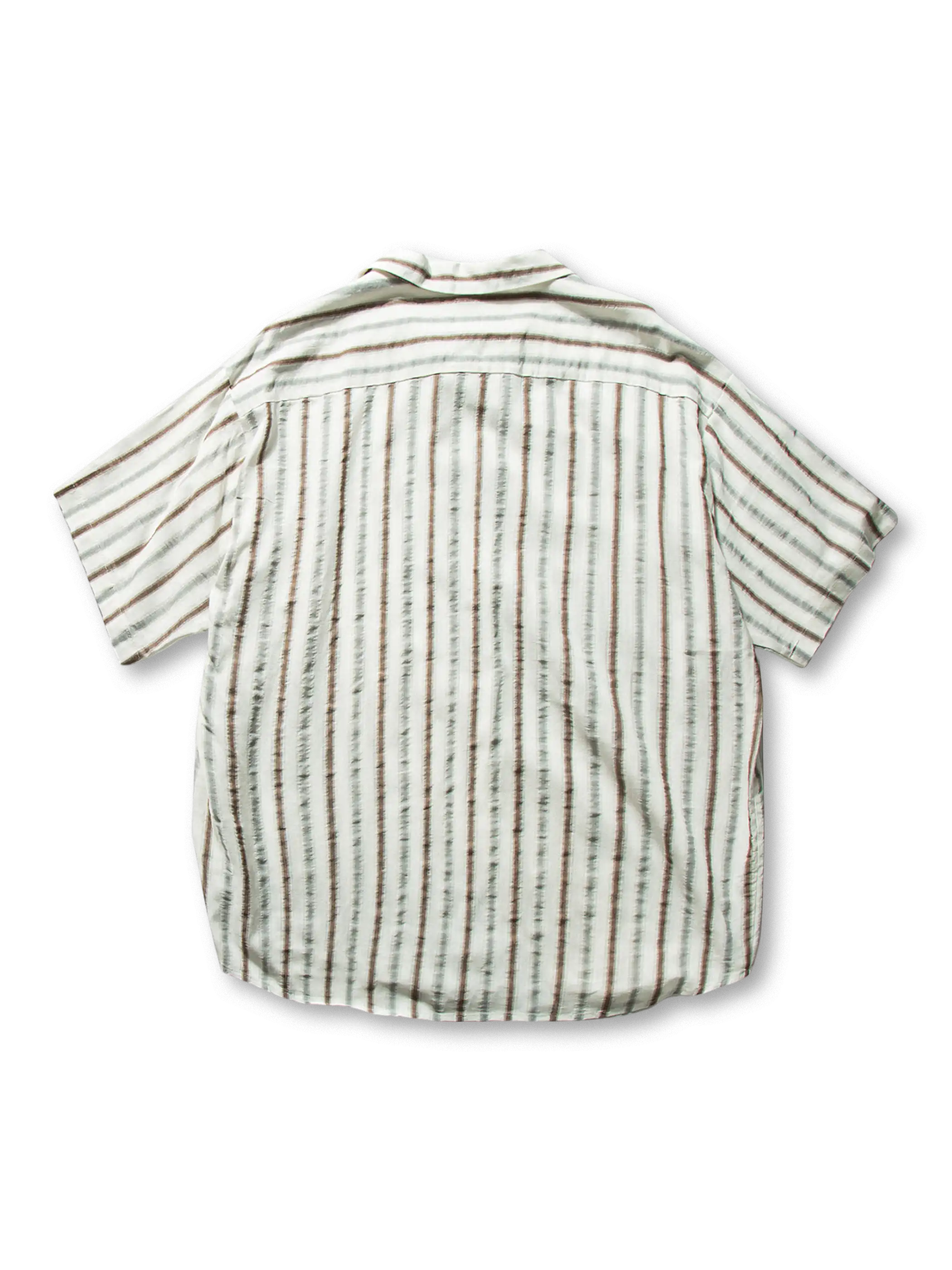 1920–30年代に海辺の開放的なリゾートウェアとして誕生したキューバカラーをベースに、淡いブラウンとグリーンのストライプを織り交ぜ、左胸には異素材パッチポケットをあしらうことでモダンなアクセントを加えました。ナイロン100% の軽やかな生地は汗をかいても肌離れがよく、一枚でさらりと着られるため真夏の街歩きやリゾートスタイルに最適です。ゆるいボックスシルエットと肘にかかる五分袖がボディラインを包み込み、細身のパンツやワイドカーゴと合わせるだけでバランス良く決まります。