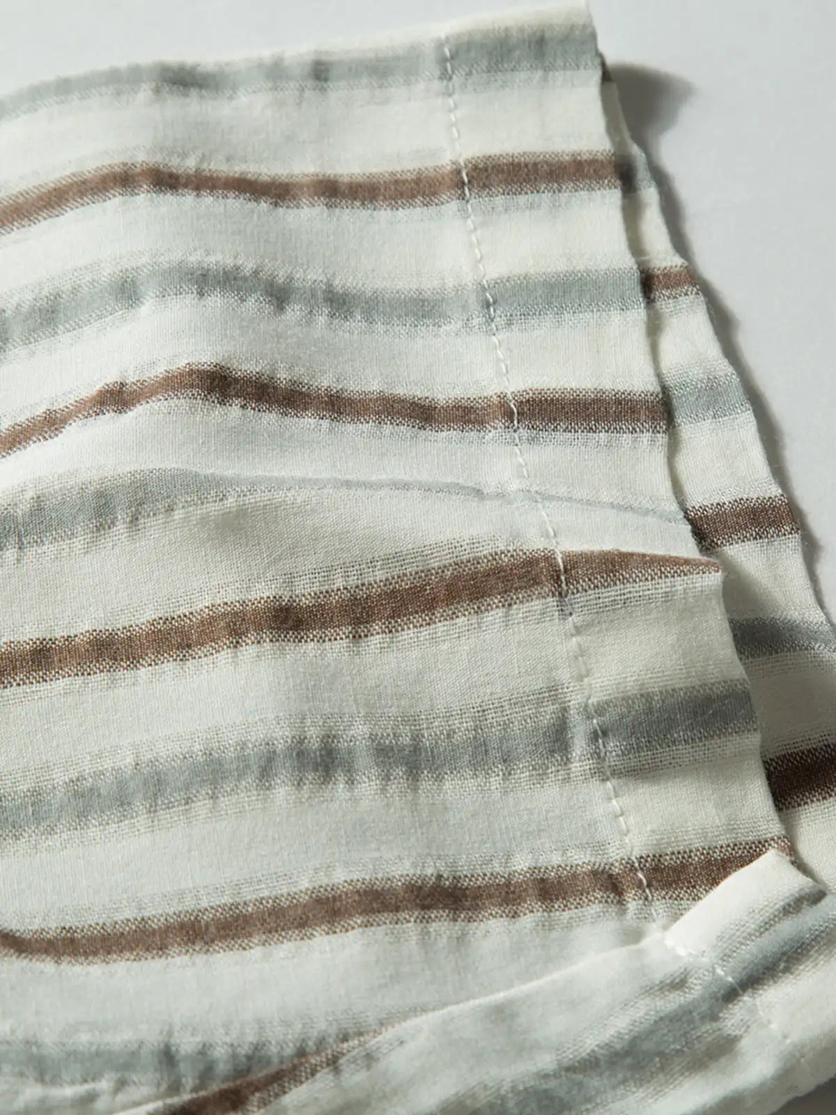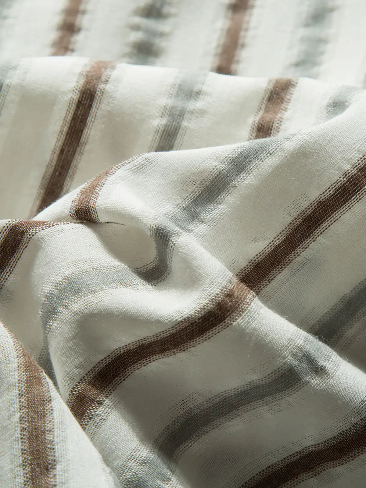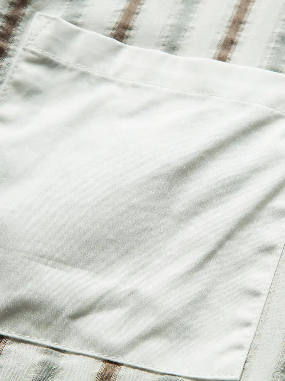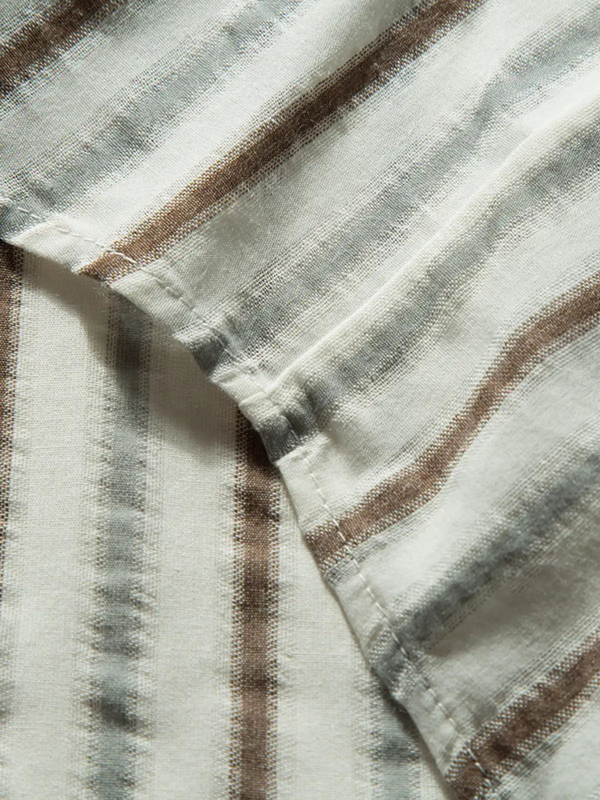 1920–30年代に海辺の開放的なリゾートウェアとして誕生したキューバカラーをベースに、淡いブラウンとグリーンのストライプを織り交ぜ、左胸には異素材パッチポケットをあしらうことでモダンなアクセントを加えました。ナイロン100% の軽やかな生地は汗をかいても肌離れがよく、一枚でさらりと着られるため真夏の街歩きやリゾートスタイルに最適です。ゆるいボックスシルエットと肘にかかる五分袖がボディラインを包み込み、細身のパンツやワイドカーゴと合わせるだけでバランス良く決まります。