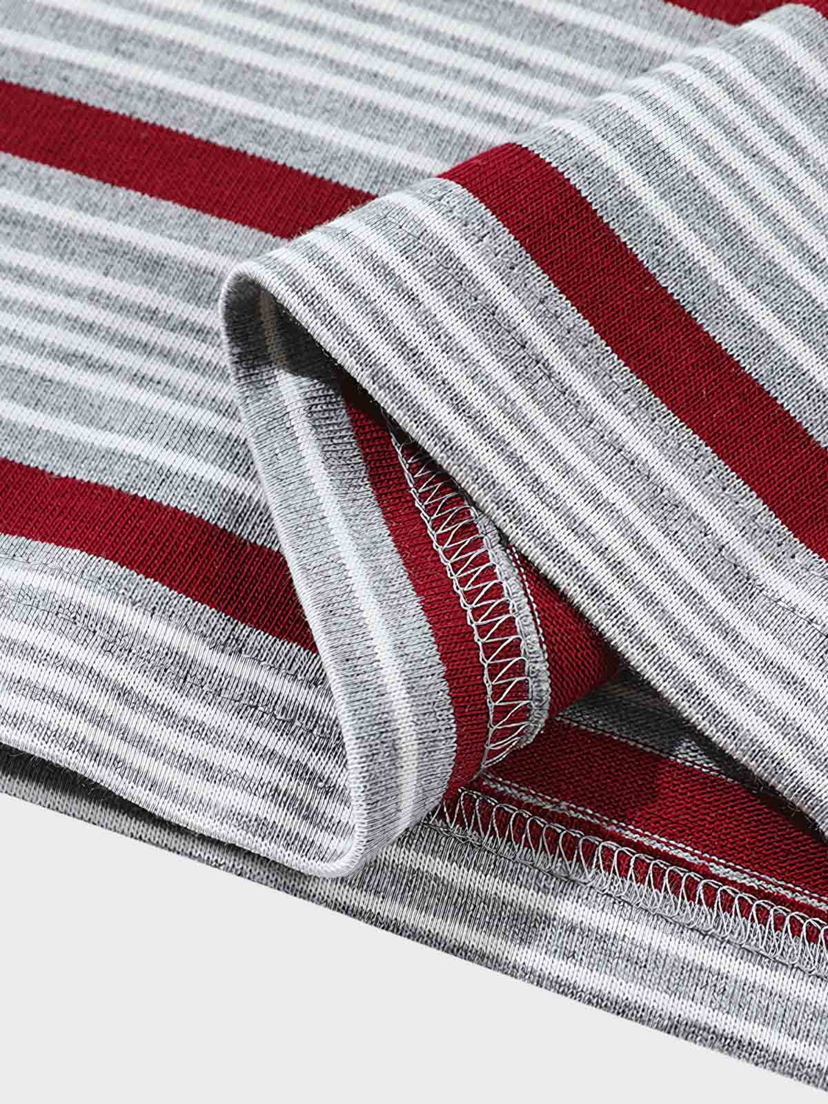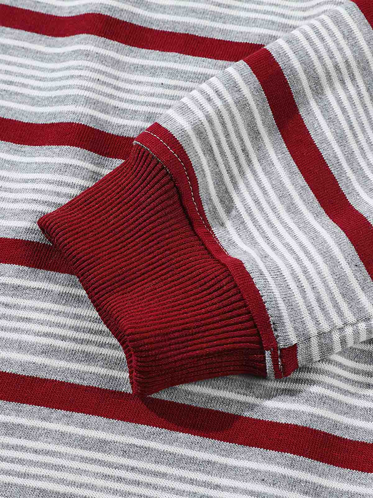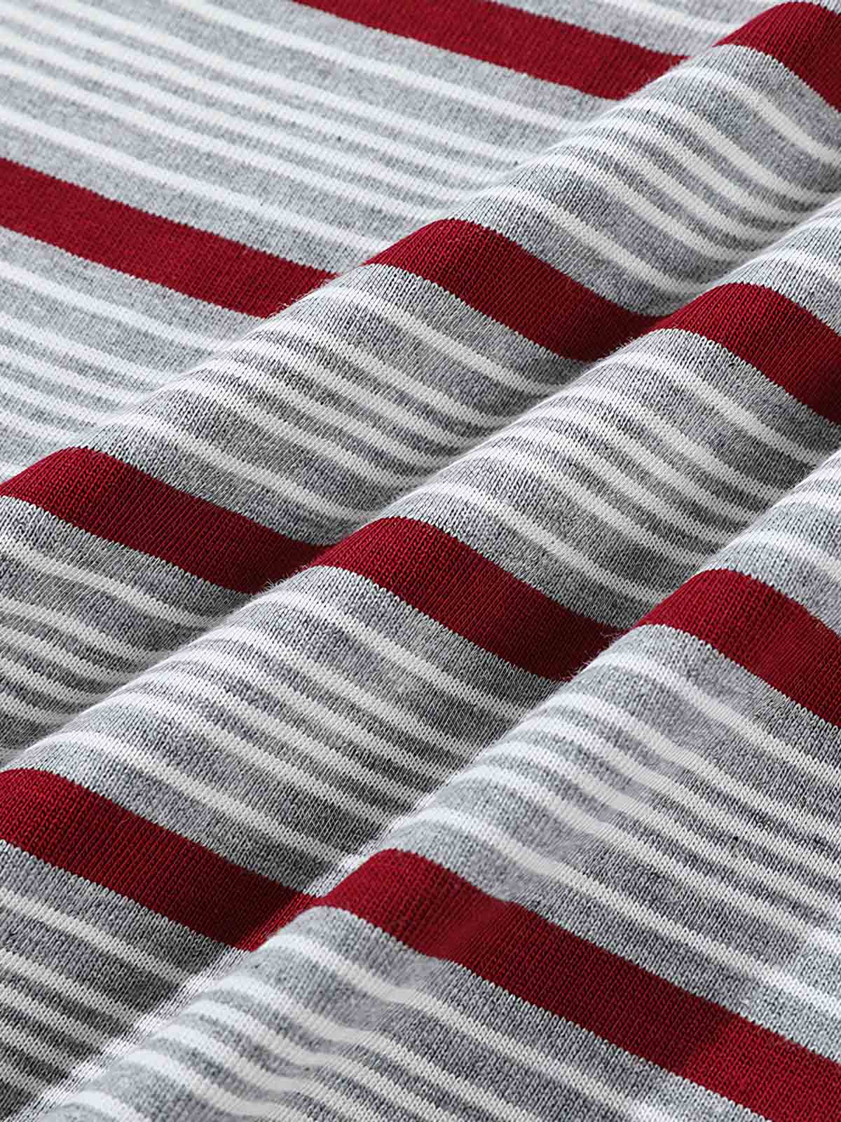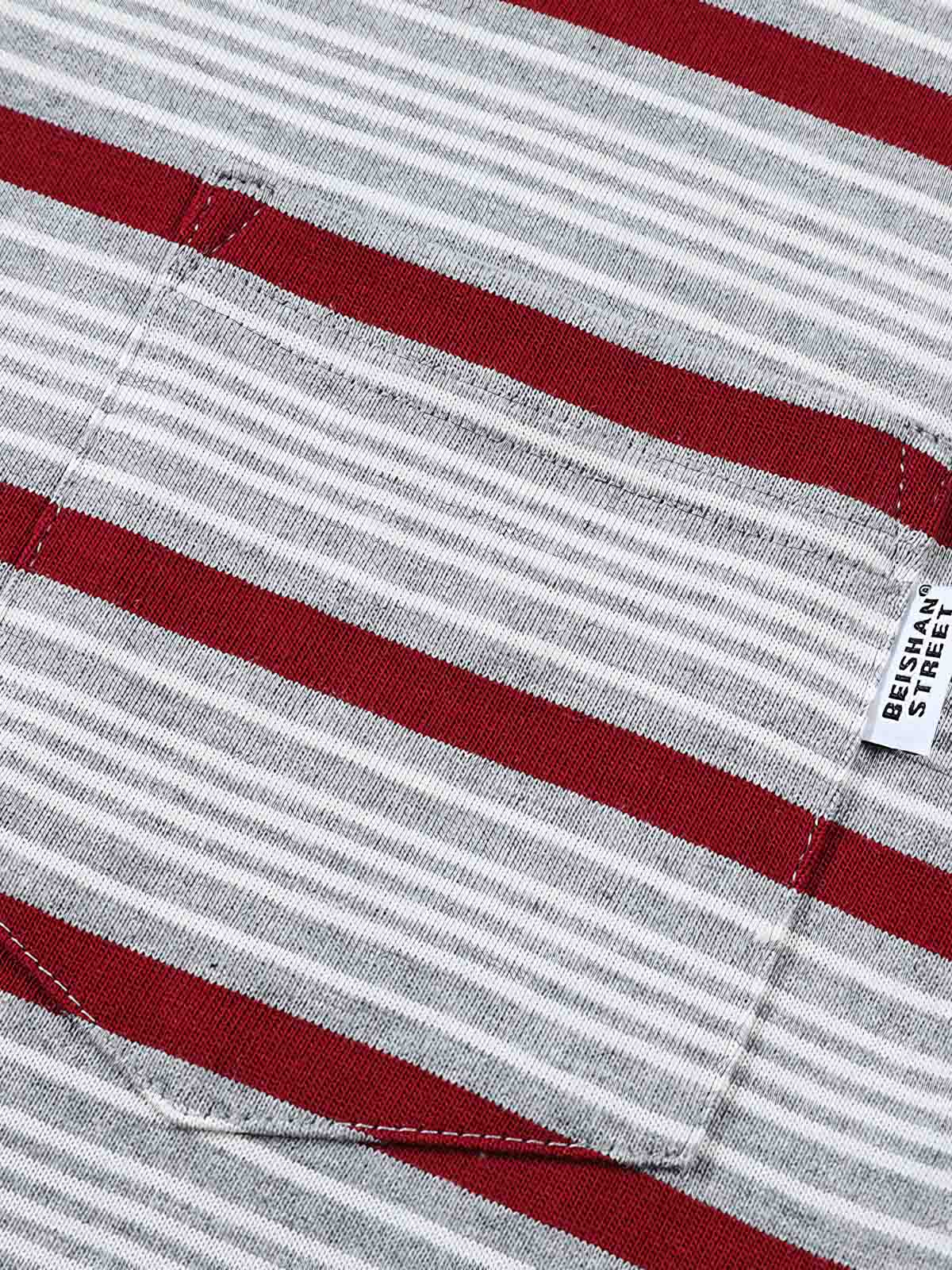 100%コットンの柔らかな生地は優れた通気性と肌触りを実現し、長時間の着用でも快適です。ボルドーとホワイトのストライプはスタイリッシュな対比を生み出し、多様なファッションアイテムとの組み合わせが容易です。