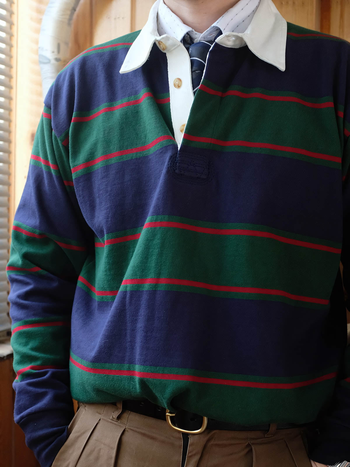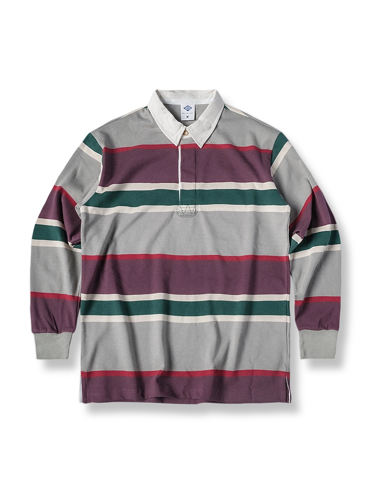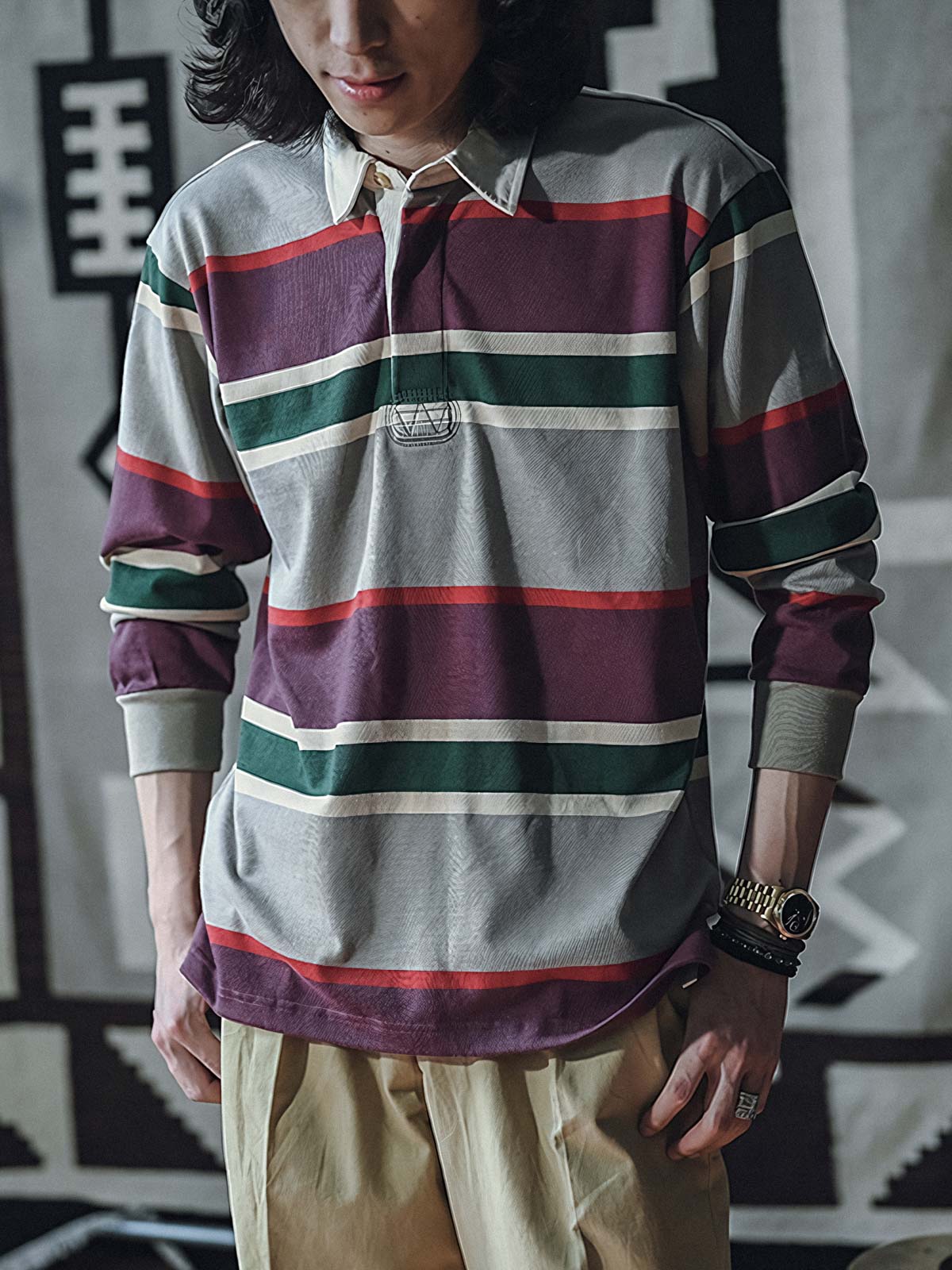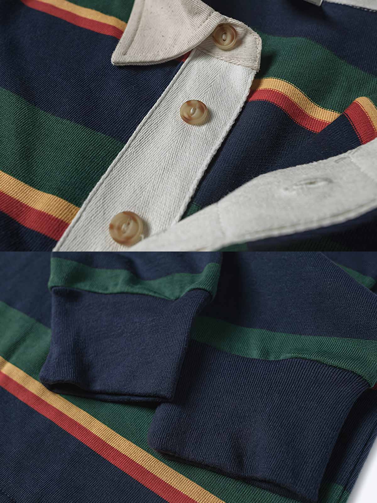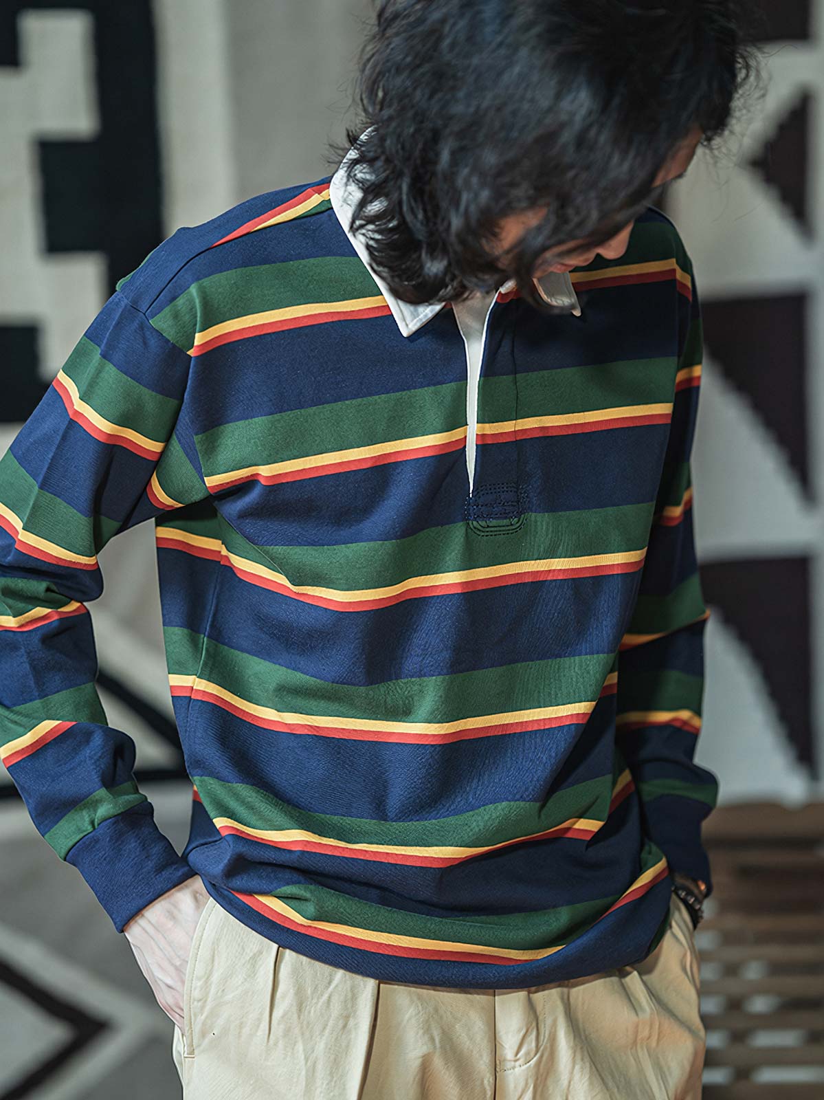 この長袖ポロシャツは、ヴィンテージラグビーウェアに着想を得たデザインです。重厚なストライプパターンは、スポーツの歴史と貴族の遊びの伝統を彷彿とさせます。
