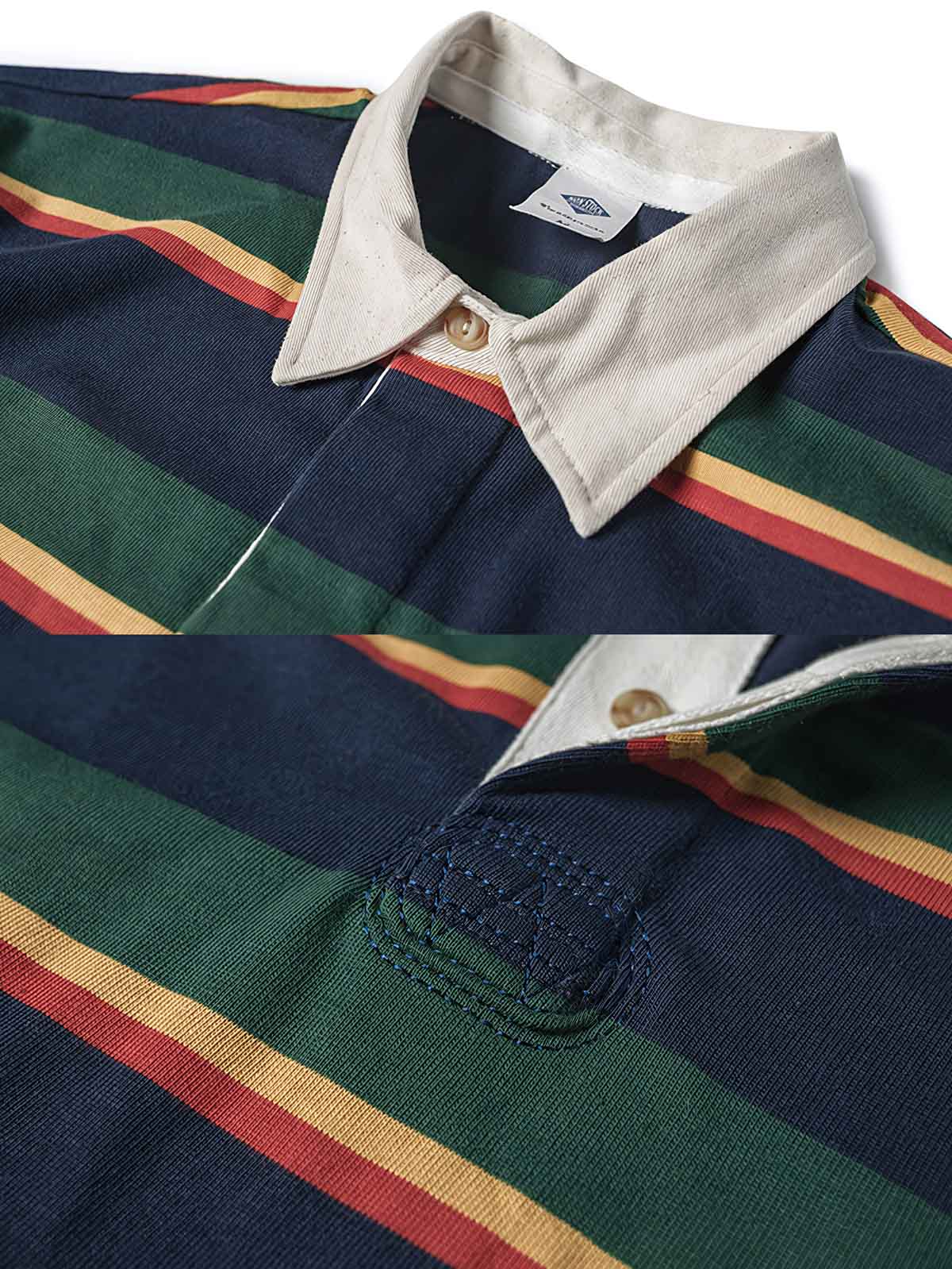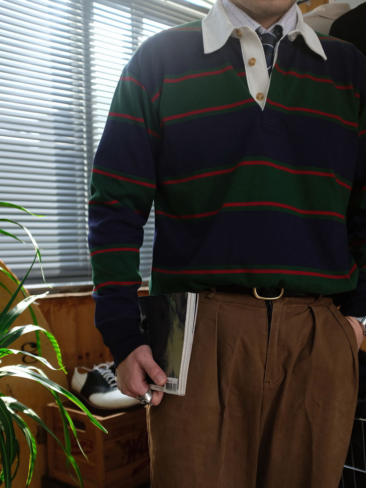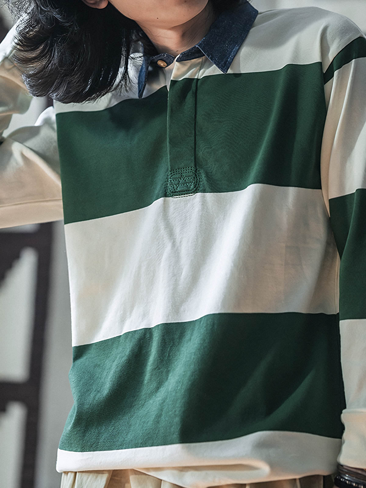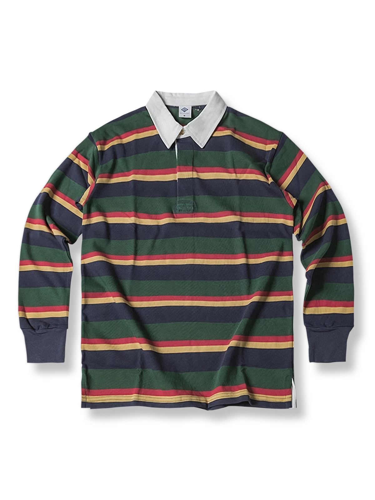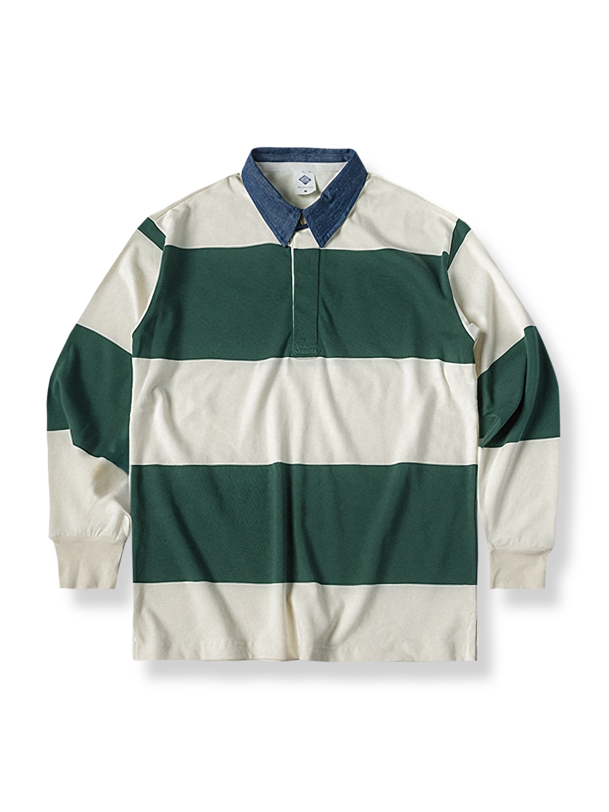 この長袖ポロシャツは、ヴィンテージラグビーウェアに着想を得たデザインです。重厚なストライプパターンは、スポーツの歴史と貴族の遊びの伝統を彷彿とさせます。