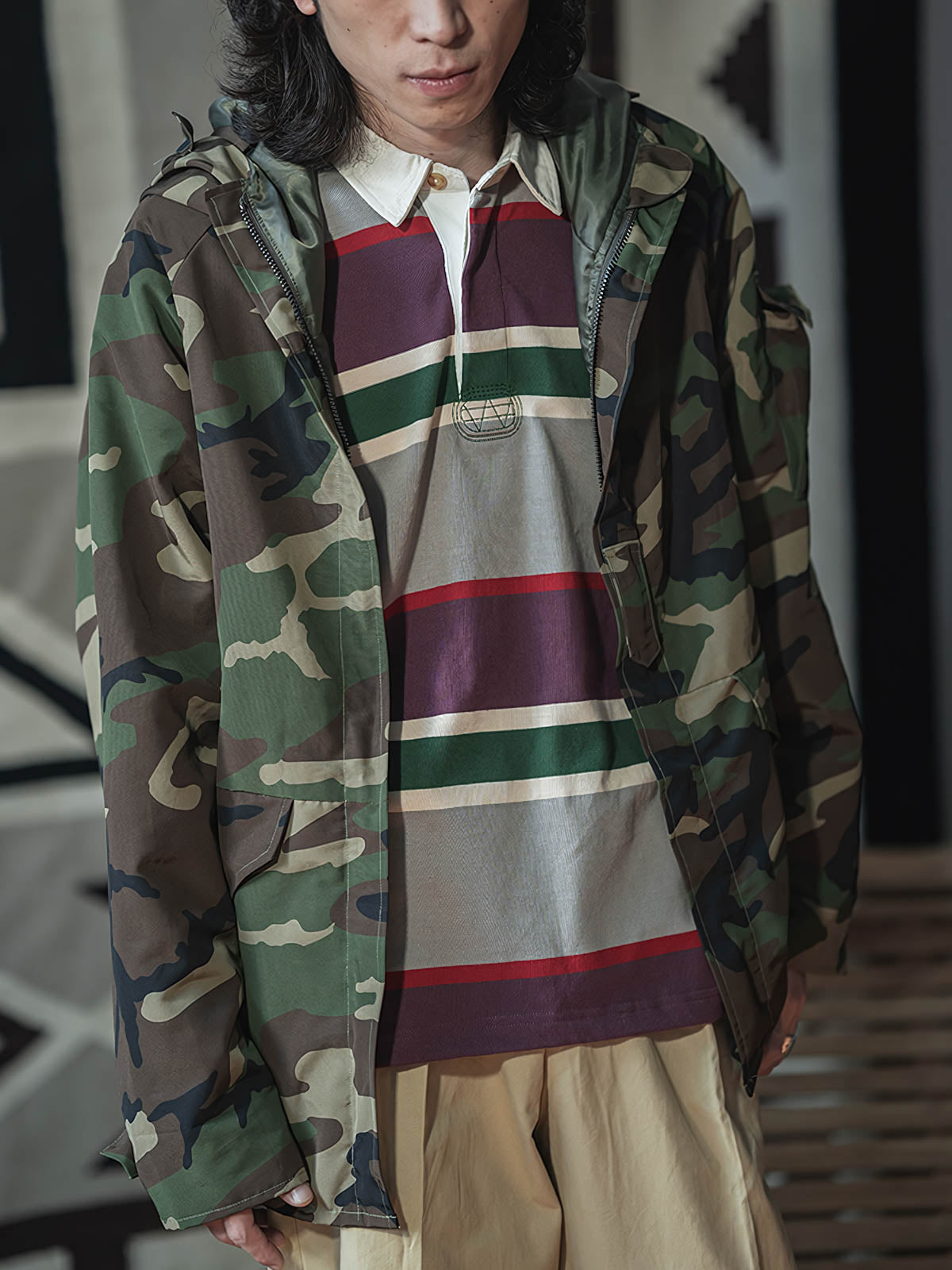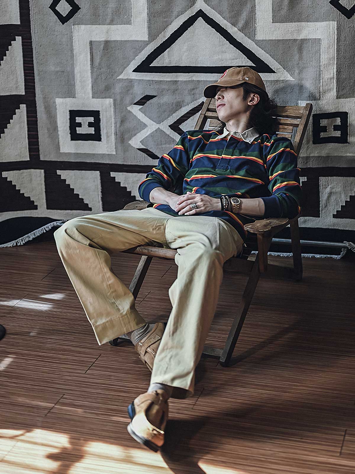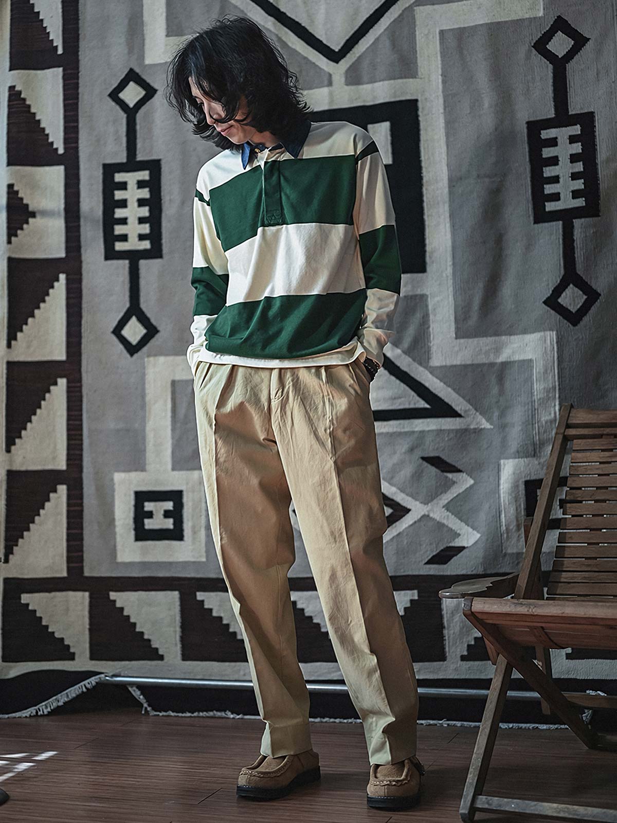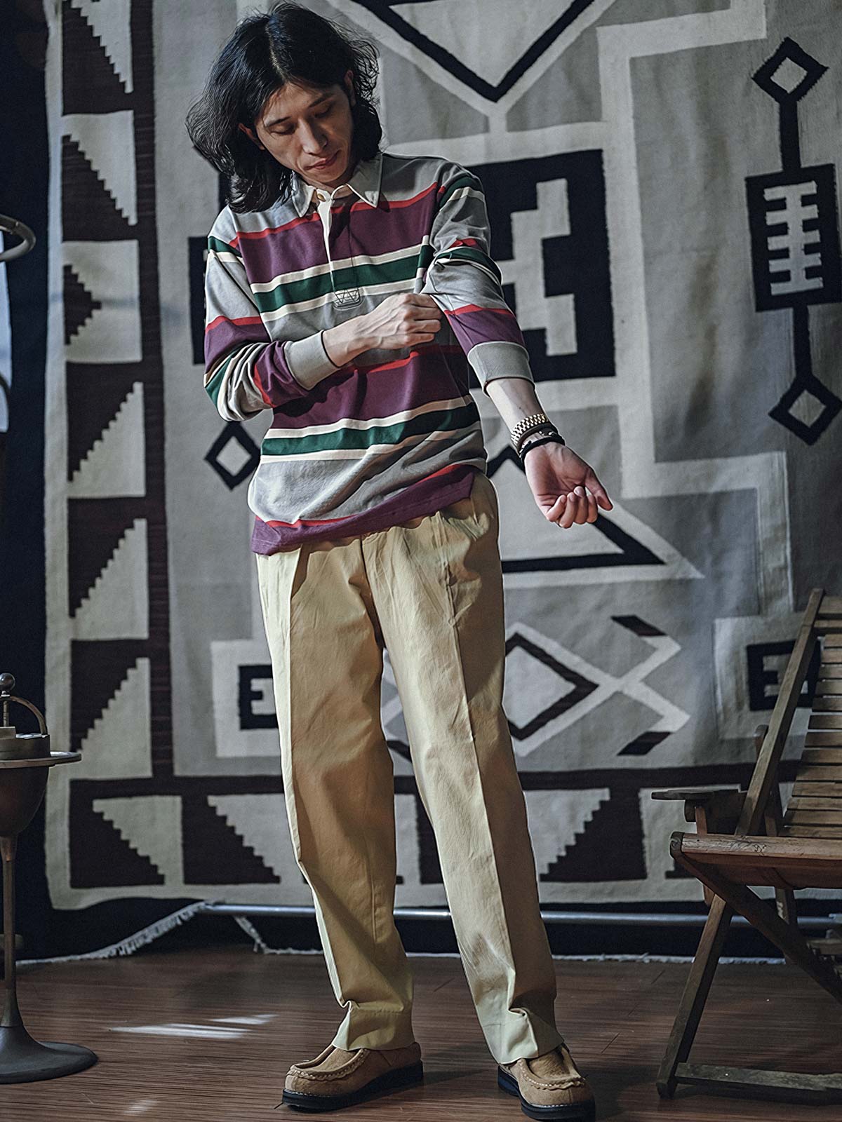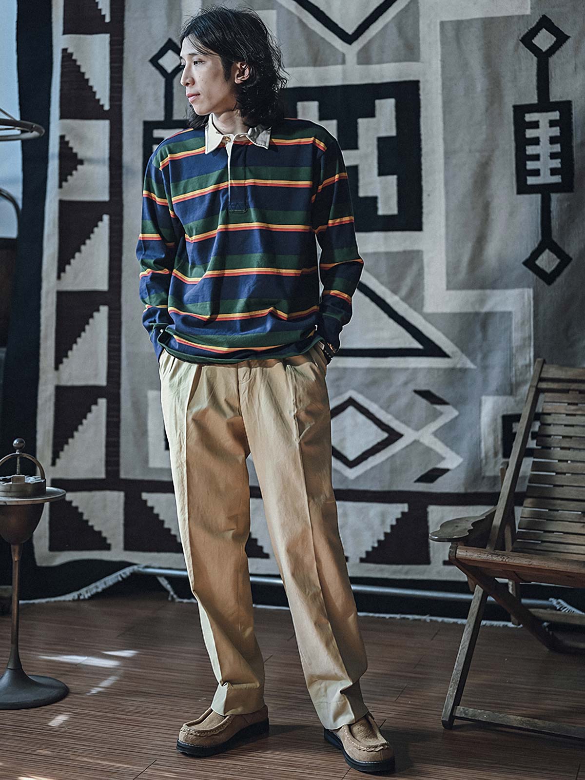 この長袖ポロシャツは、ヴィンテージラグビーウェアに着想を得たデザインです。重厚なストライプパターンは、スポーツの歴史と貴族の遊びの伝統を彷彿とさせます。