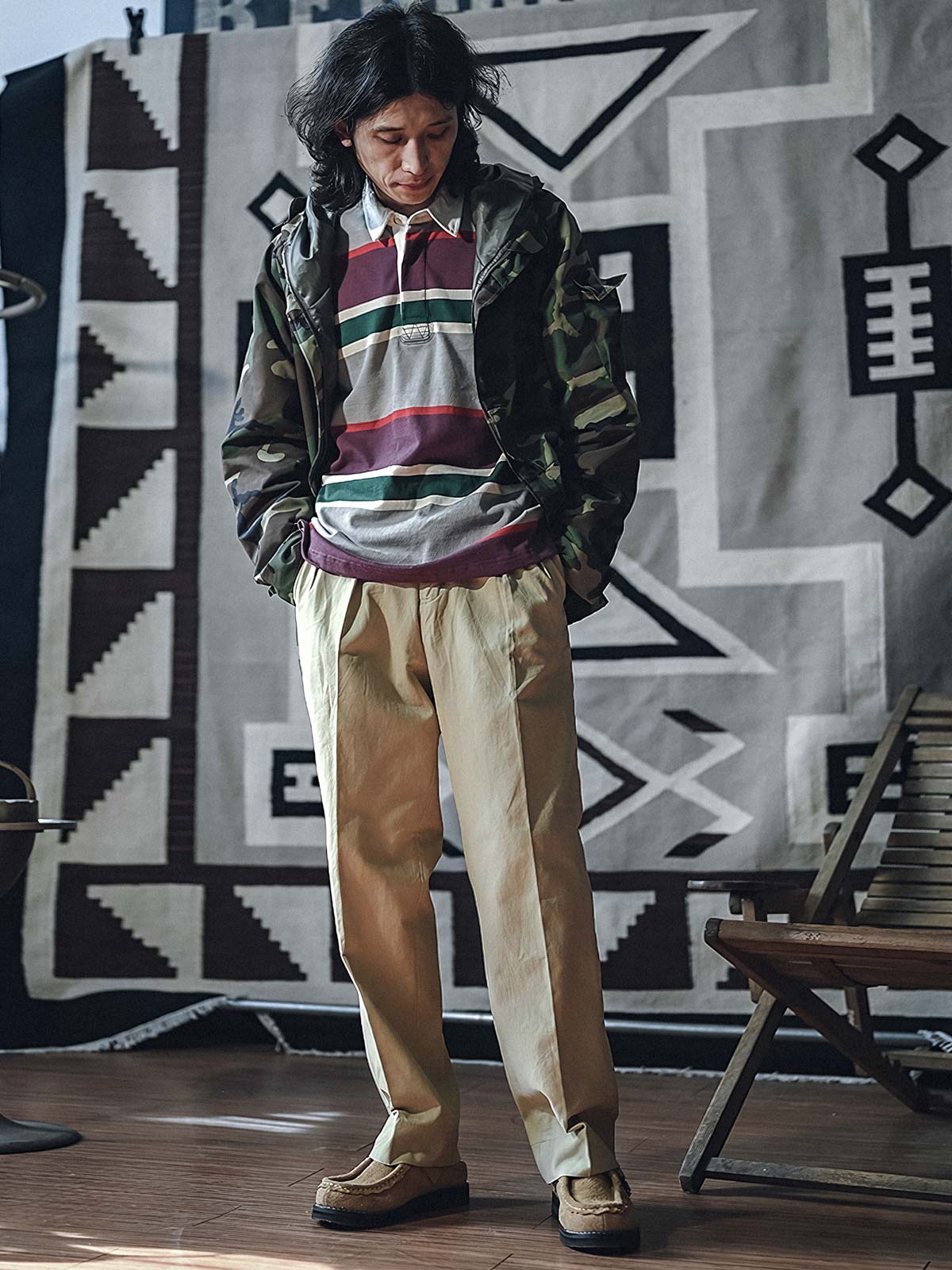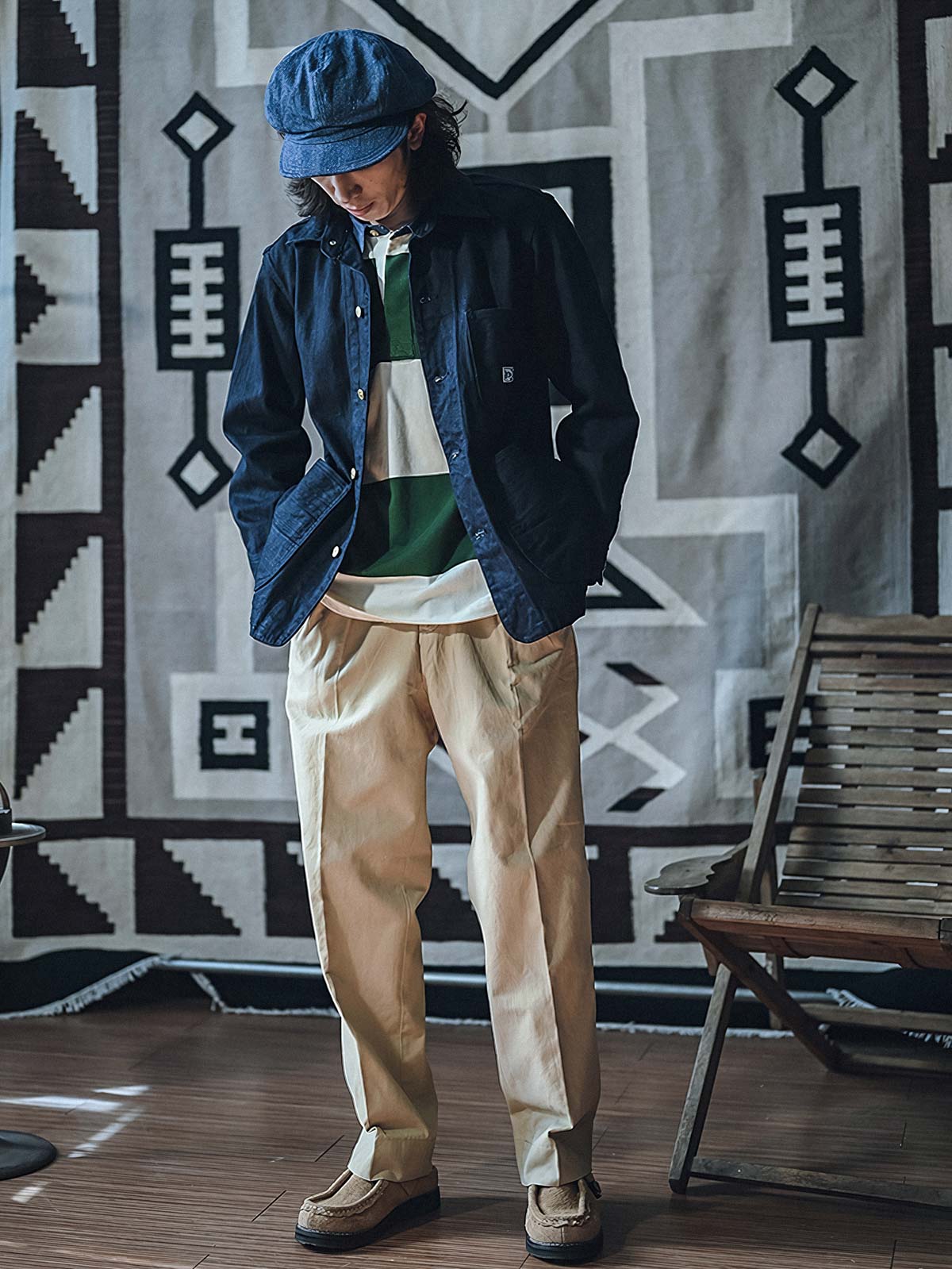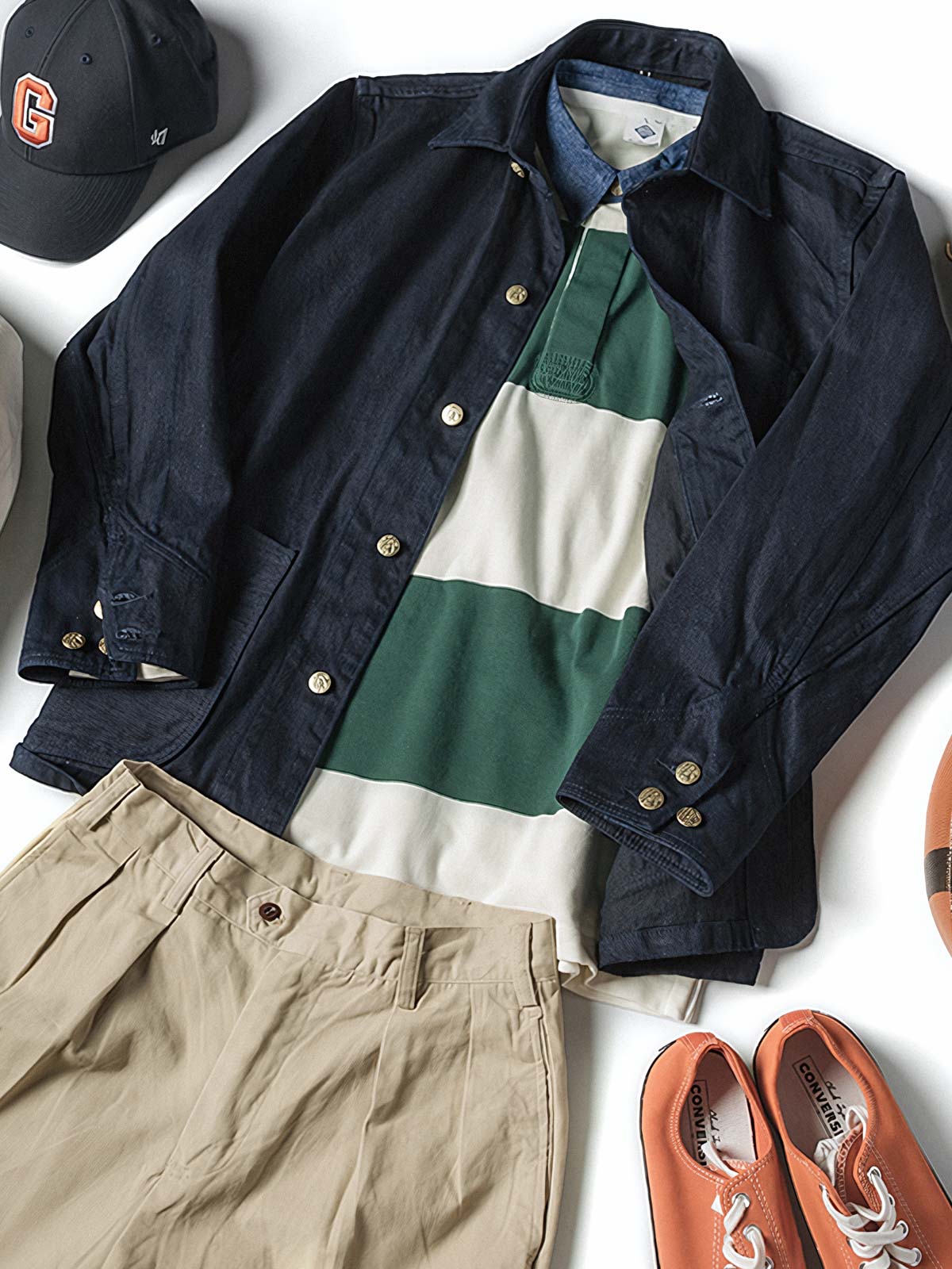 シンプルなスラックスやデニムとの組み合わせがオススメです。アウターとしても活用可能で、季節の変わり目には特に便利。シューズは、ドレスシューズできちんと感を出すか、スニーカーでカジュアルダウンするかを選べます。