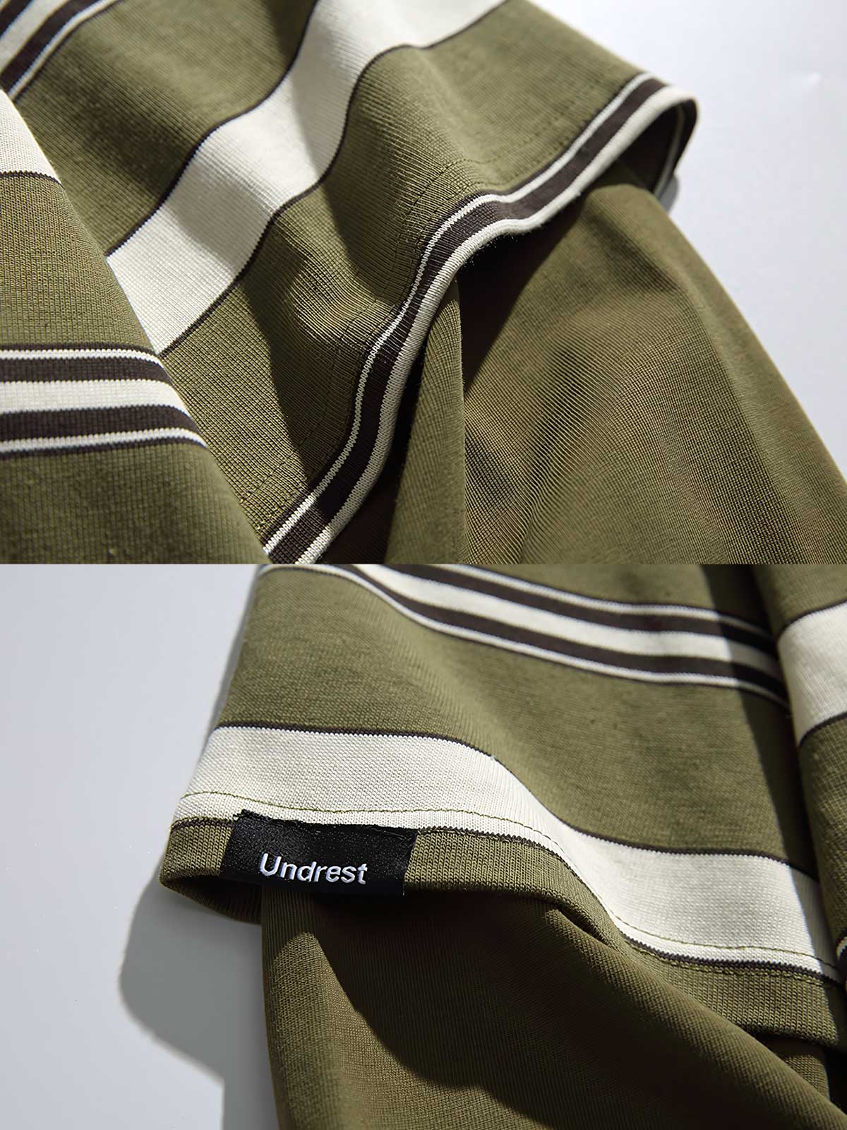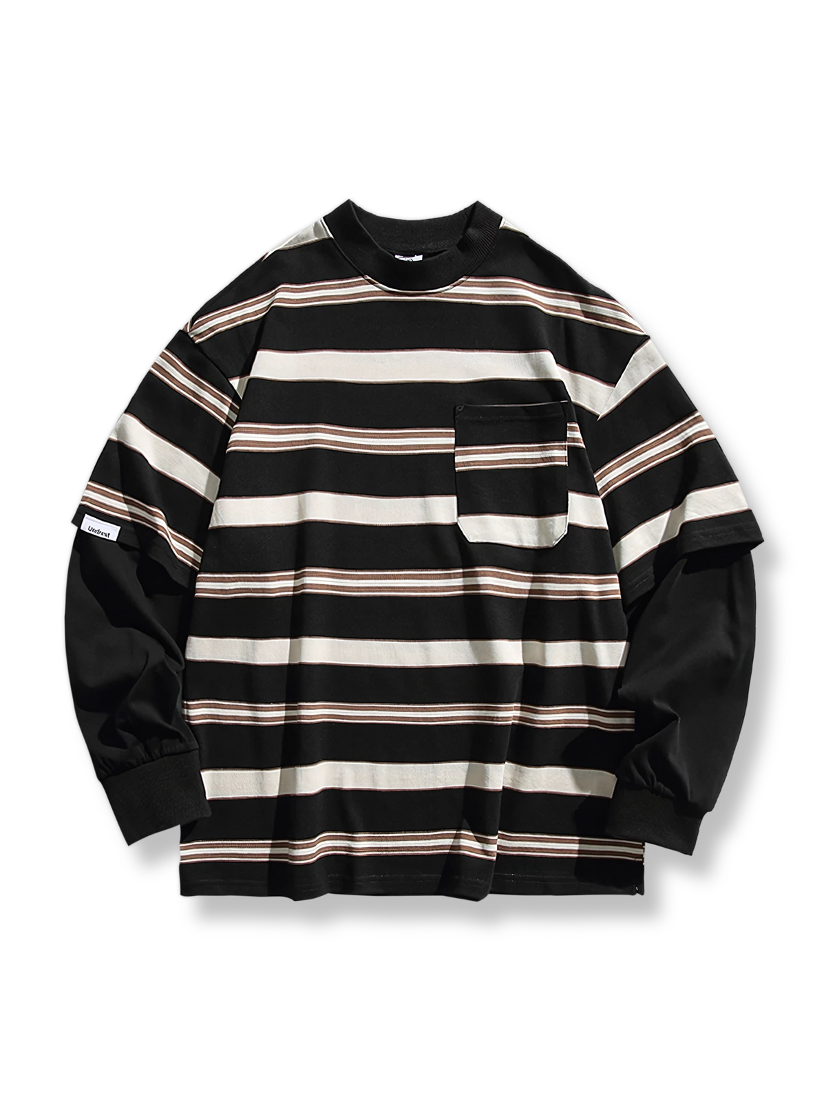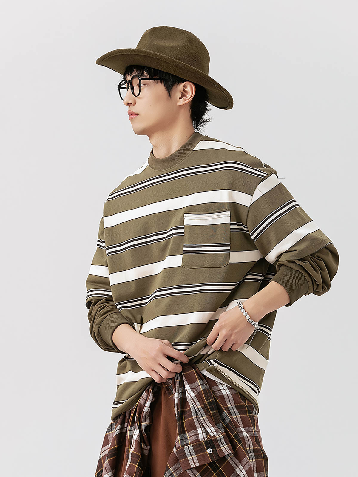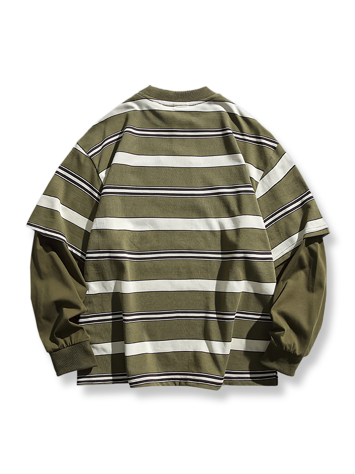 クラシックなストライプデザインのレイヤード風長袖Tシャツ、アウトドアや日常着に最適。