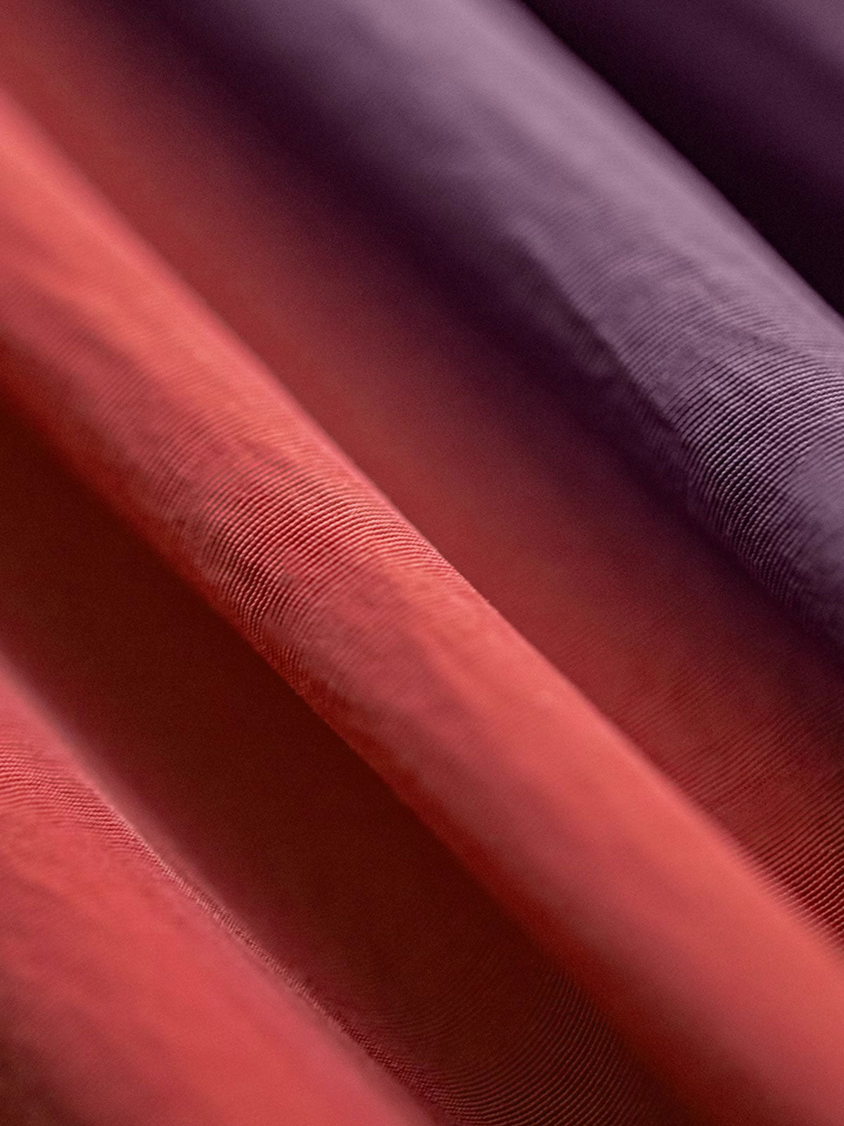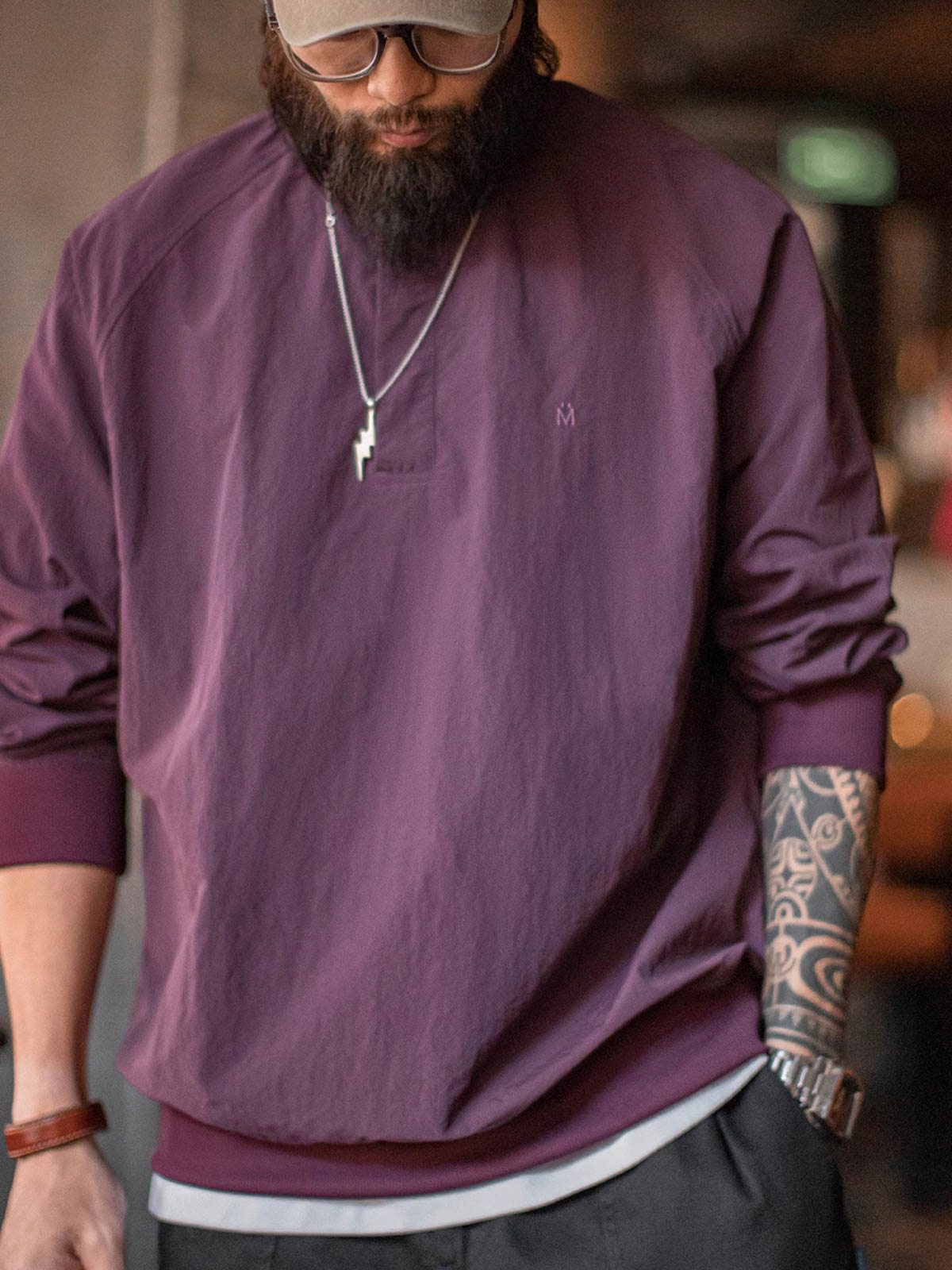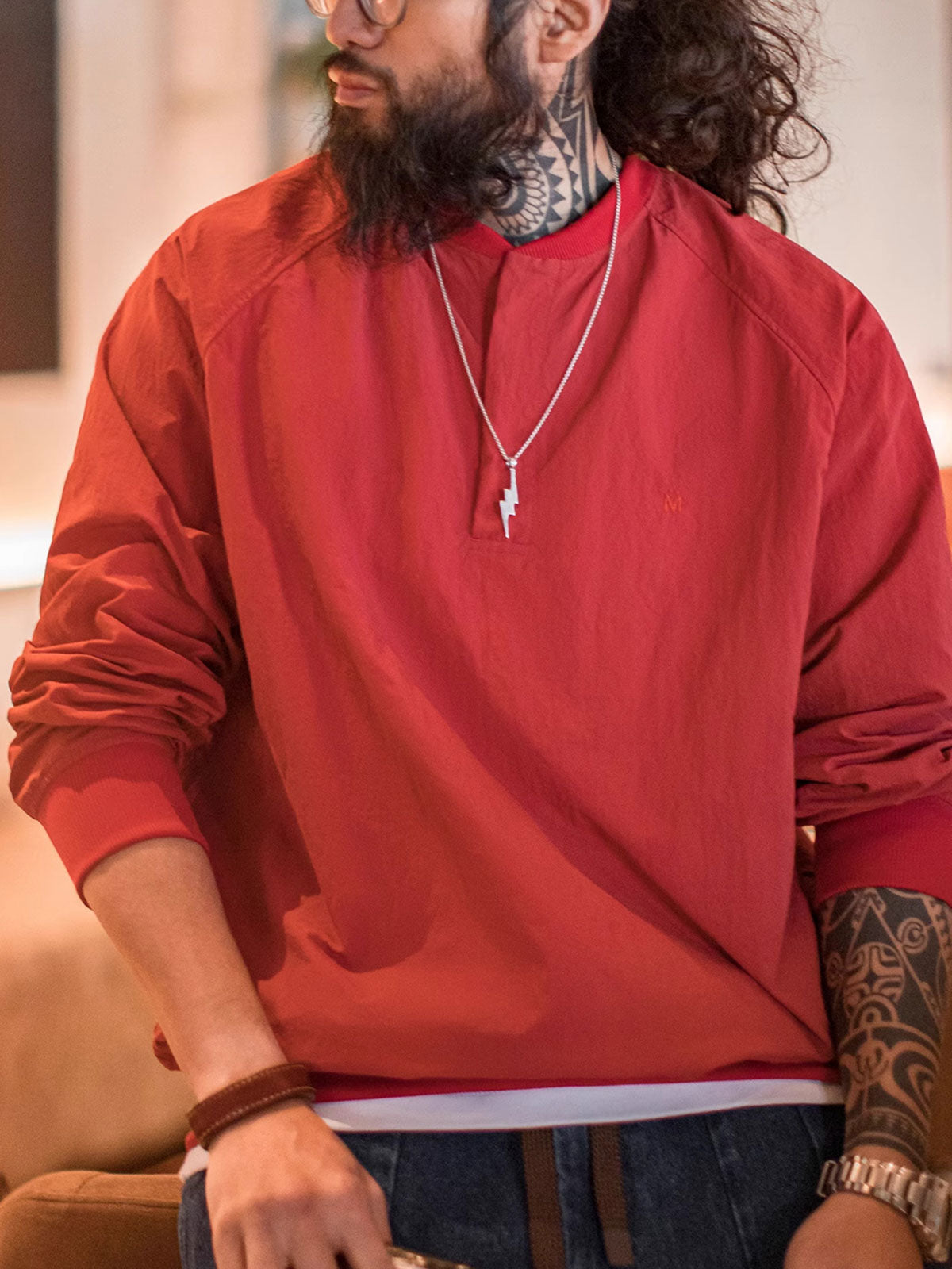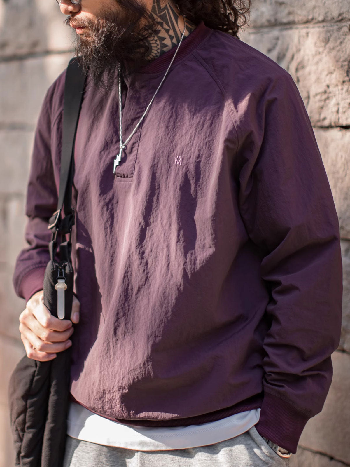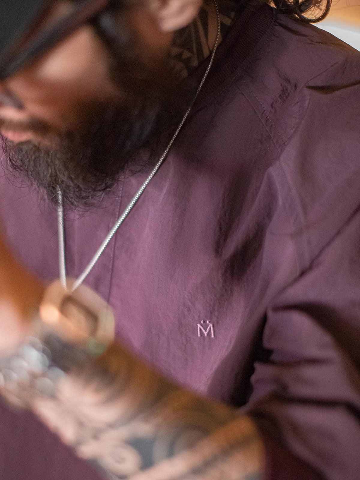 1930年代の野球ジャケットからインスピレーションを得て、軽量なTaslon素材で仕立てました。特殊染色による深みのあるパープルと風合い豊かなオレンジの2色展開。胸元のMロゴ刺繍とネームタグがさりげないアクセントに。