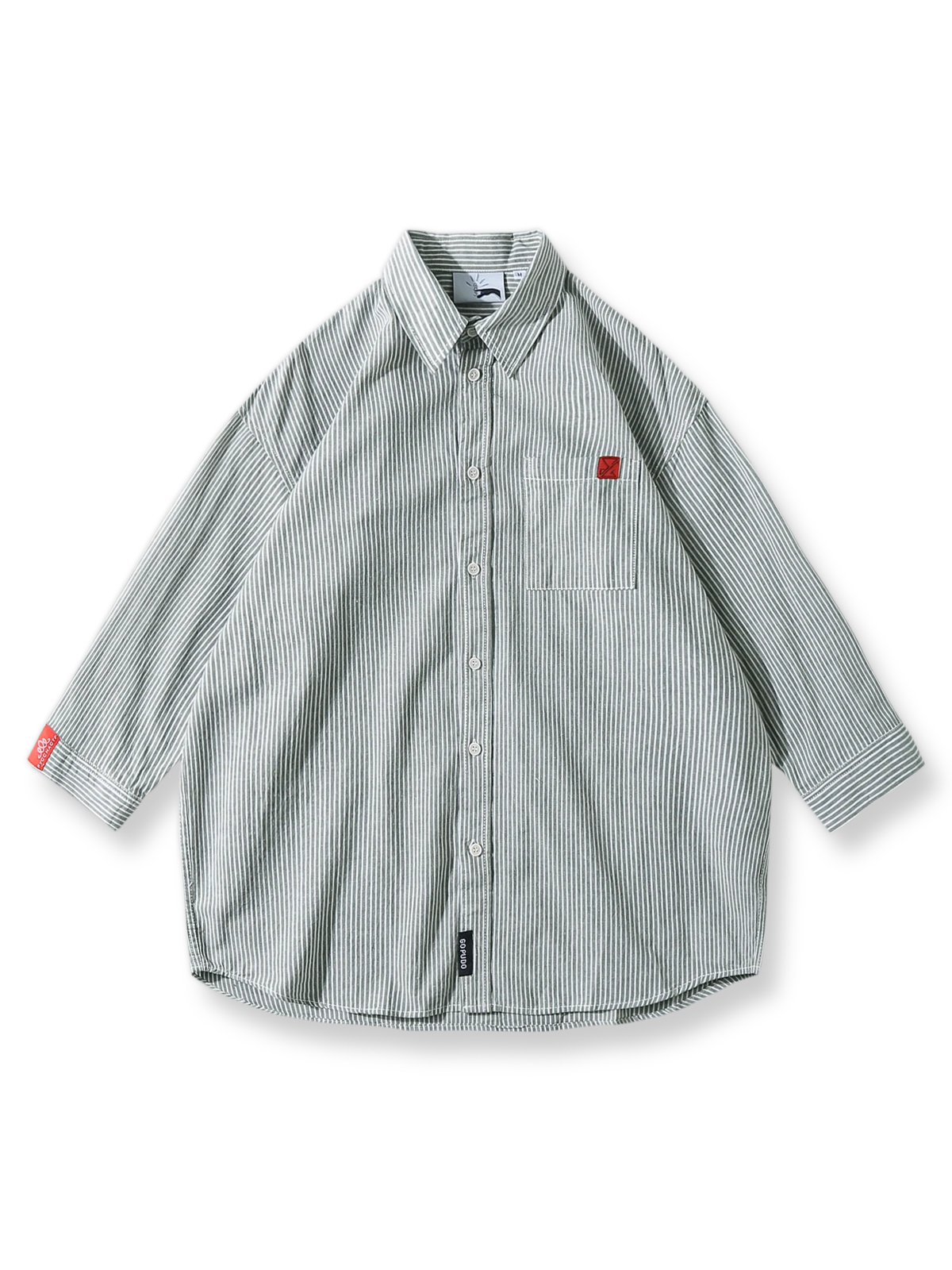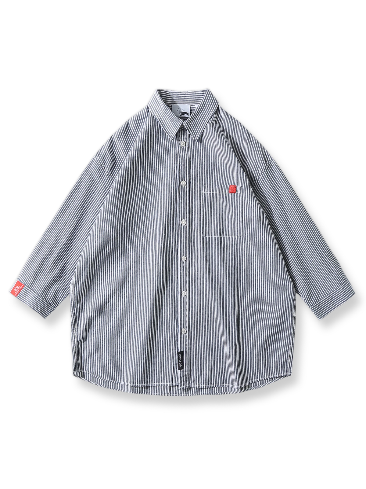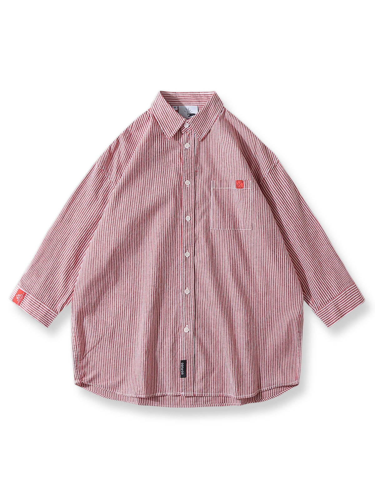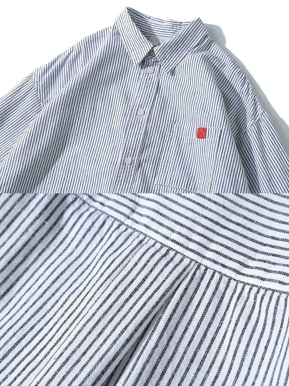 繊細なコットン素材と精確なストライプパターンが、カジュアルながらも洗練された印象を与えます。シンプルなシャツカラーに赤いアクセントが加えられ、スタイリッシュでありながら快適性も兼ね備えています。