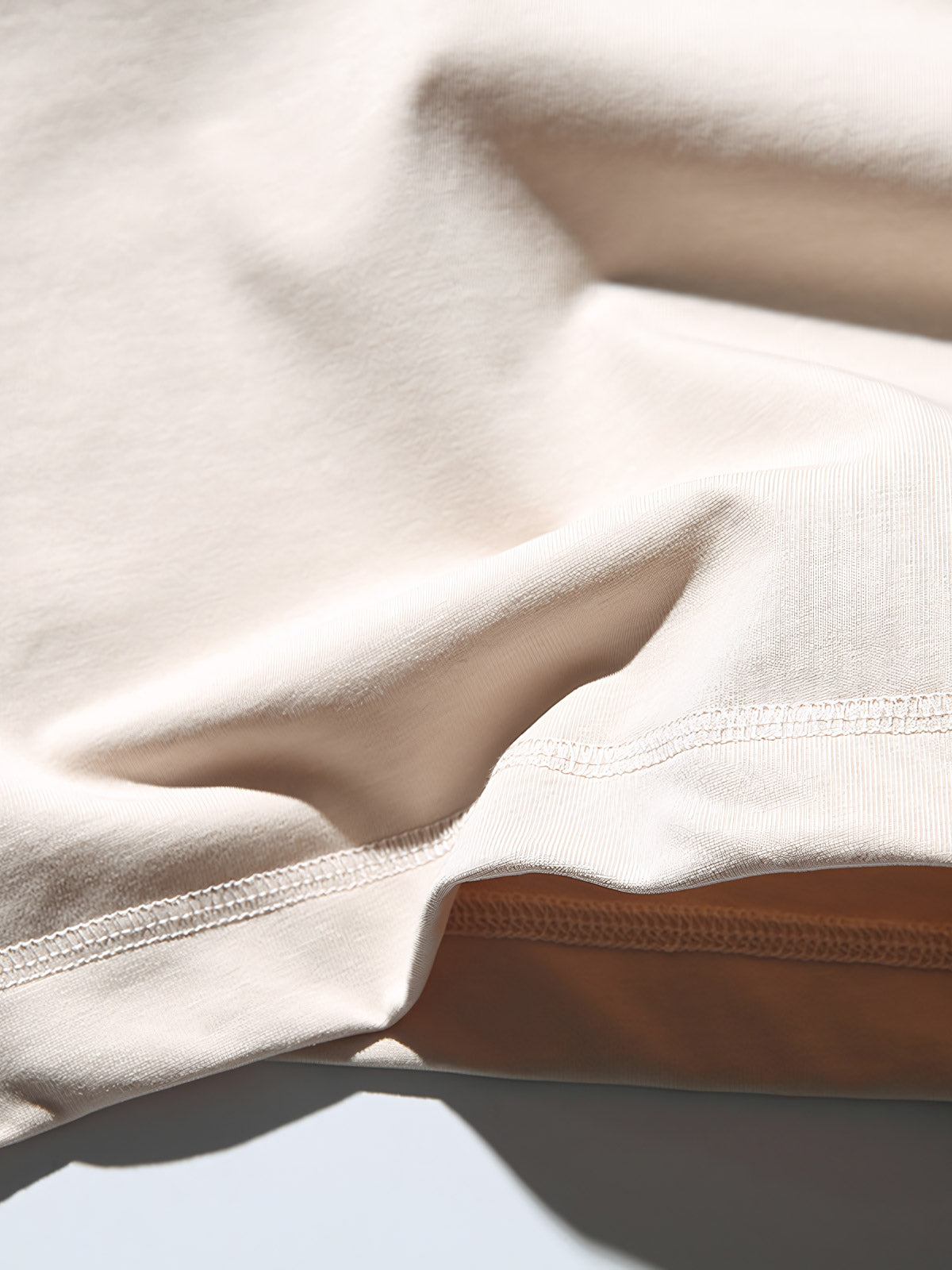 リラックスフィットとドロップテールデザインを採用し、300gの30番手精紡コットン生地を使用。この厚みと柔らかさは快適さを提供し、様々な体型にフィットし、着用者に自由な動きを確保します。