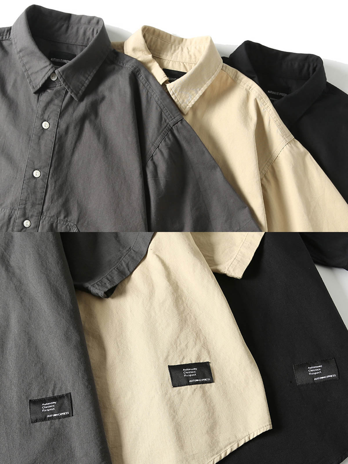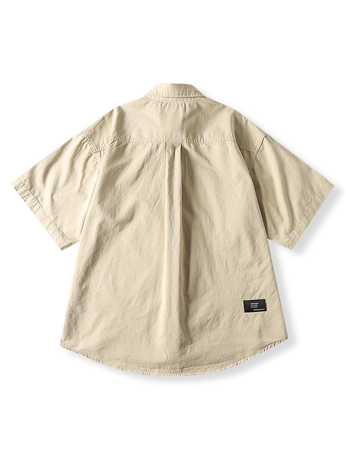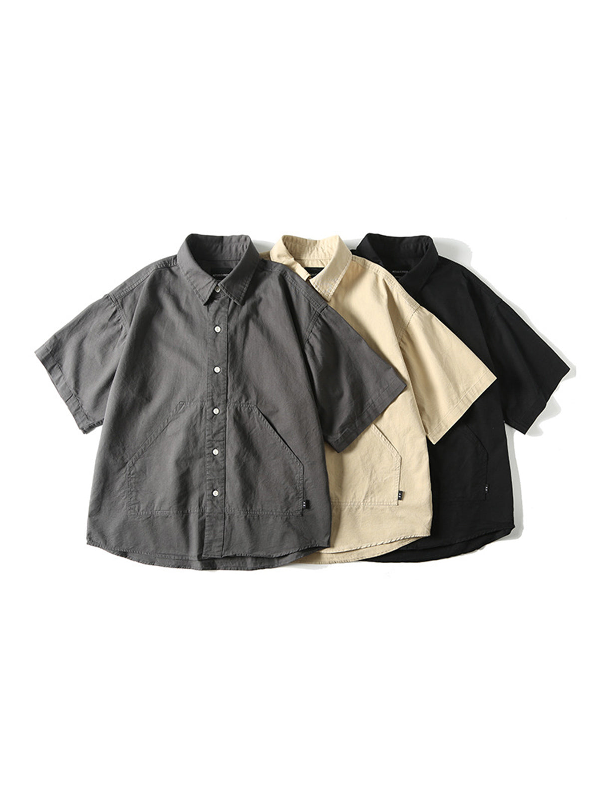 シンプルなデザイン、実用的な斜めポケットが特徴のレトロな半袖シャツ。