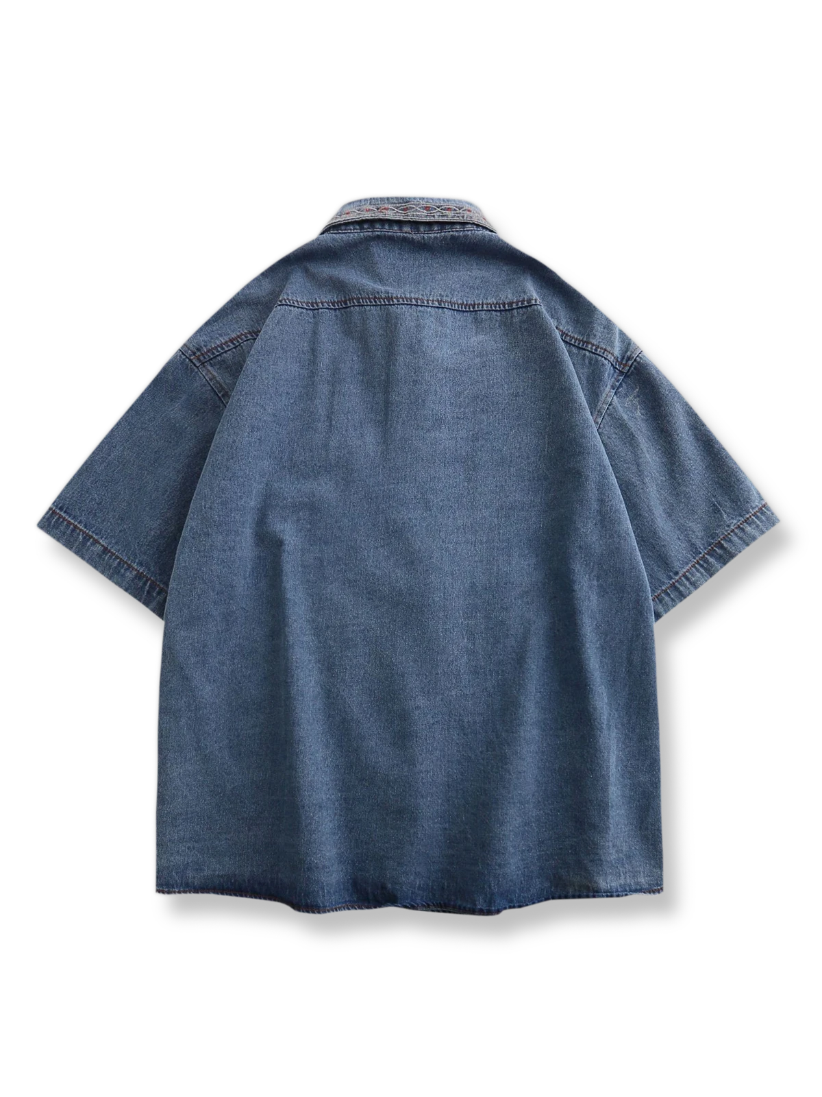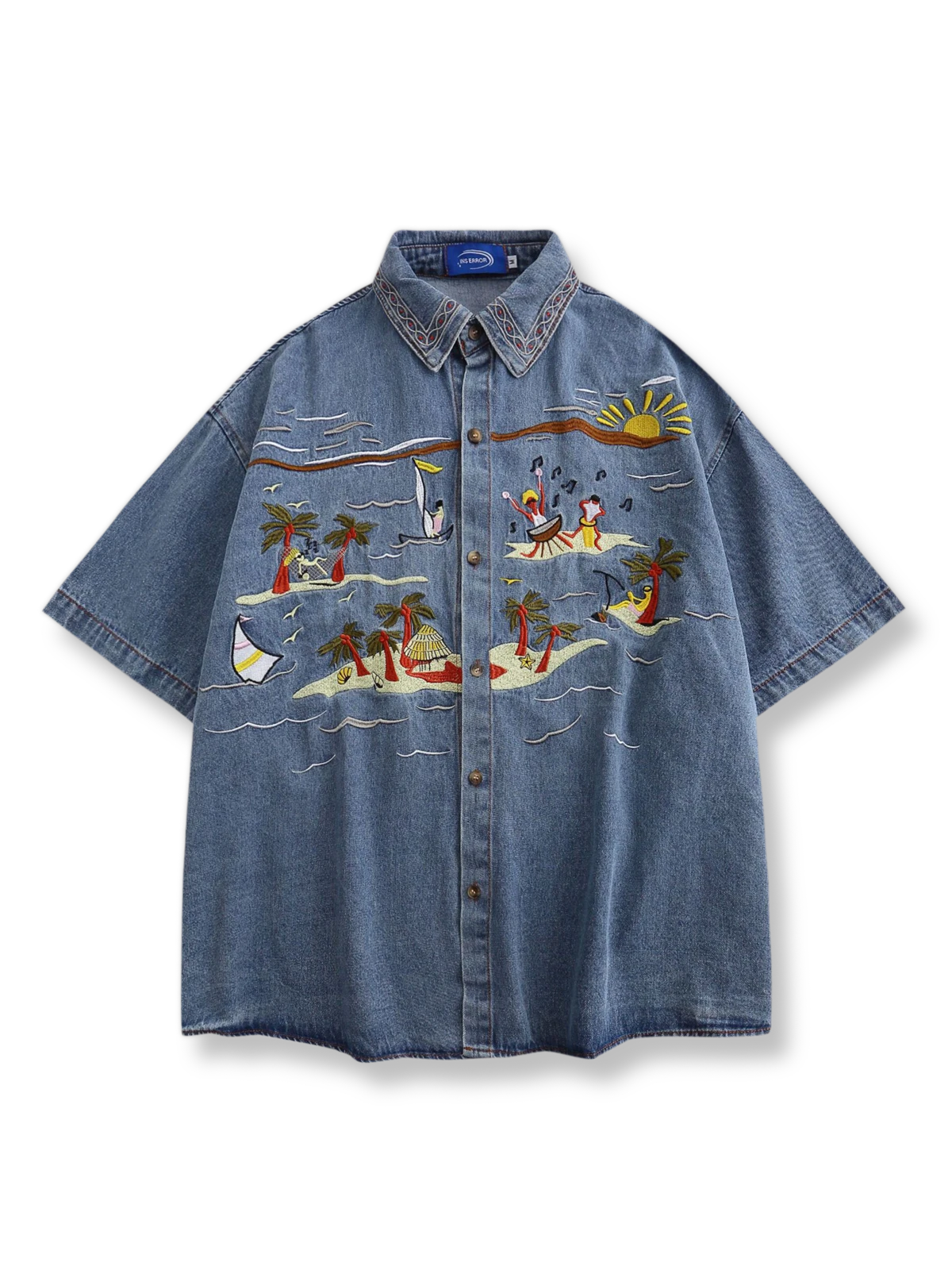 高品質のデニム生地を使用し、精巧な刺繍技術で熱帯の海景色が美しく描かれています。クラシックなデニムシャツの特徴である襟やボタンダウンフロントも保持され、レトロな雰囲気を加えています。