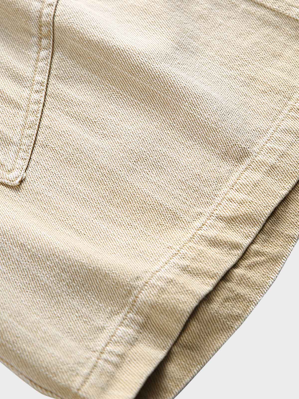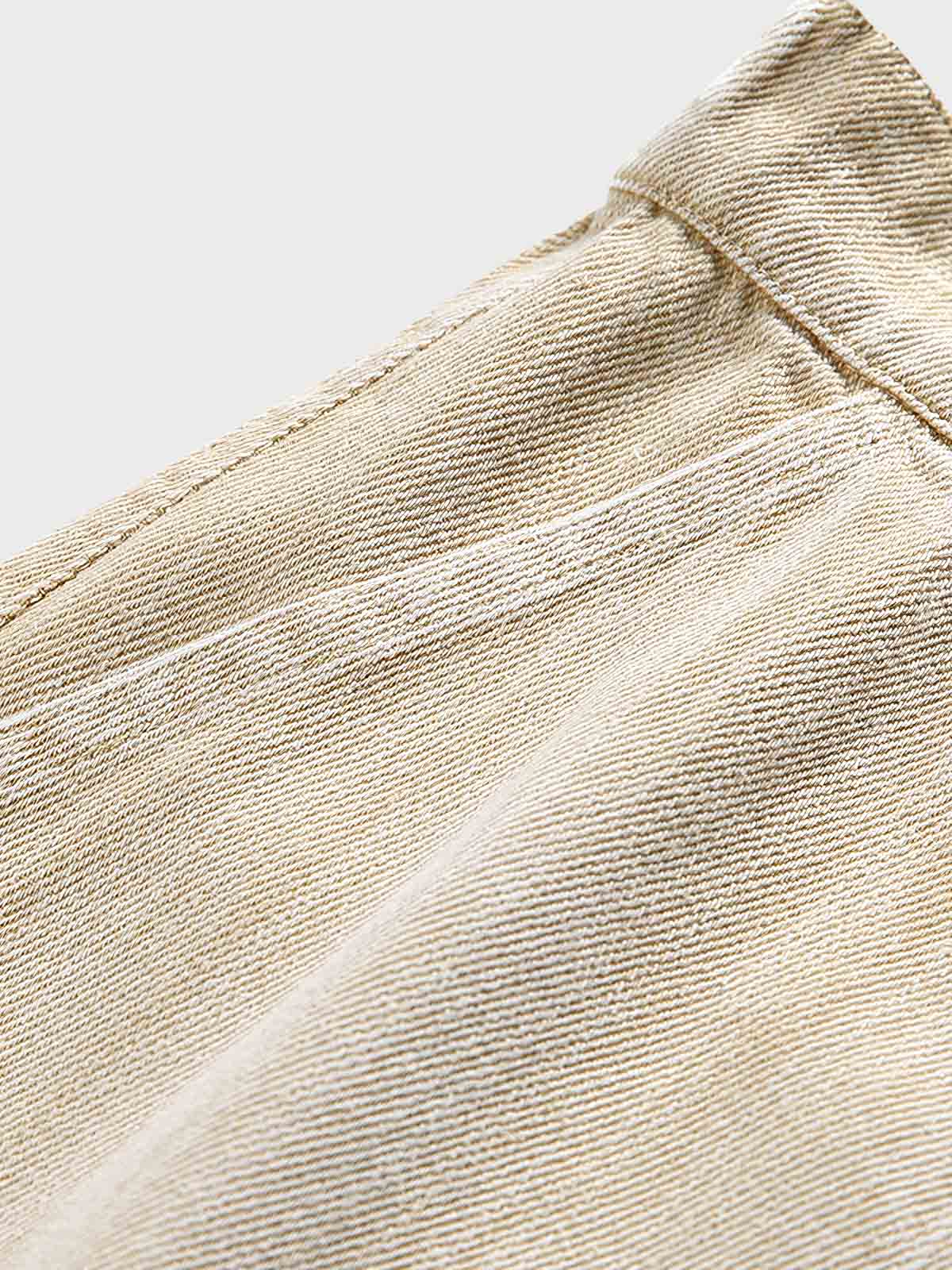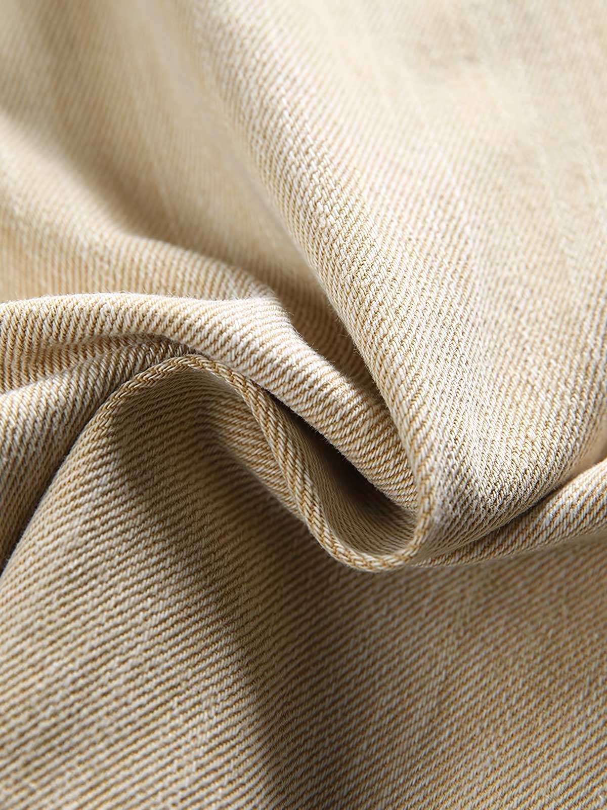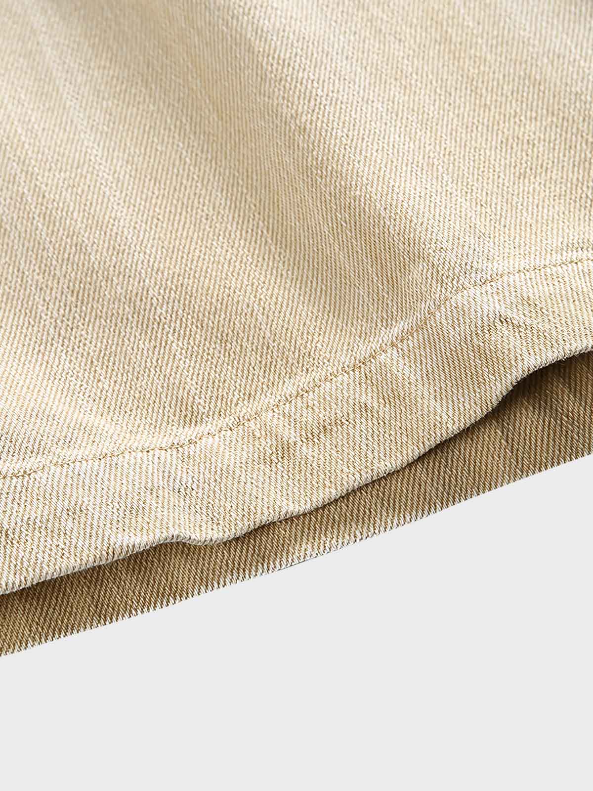 サンドウォッシュ加工が施された生地は非常に柔らかく、優れた通気性を持っています。竹節パターンは細部まで精巧に表現されており、カジュアルながらも洗練された見た目を実現しています。各パーツの縫製も丁寧に行われ、耐久性も考慮されています。