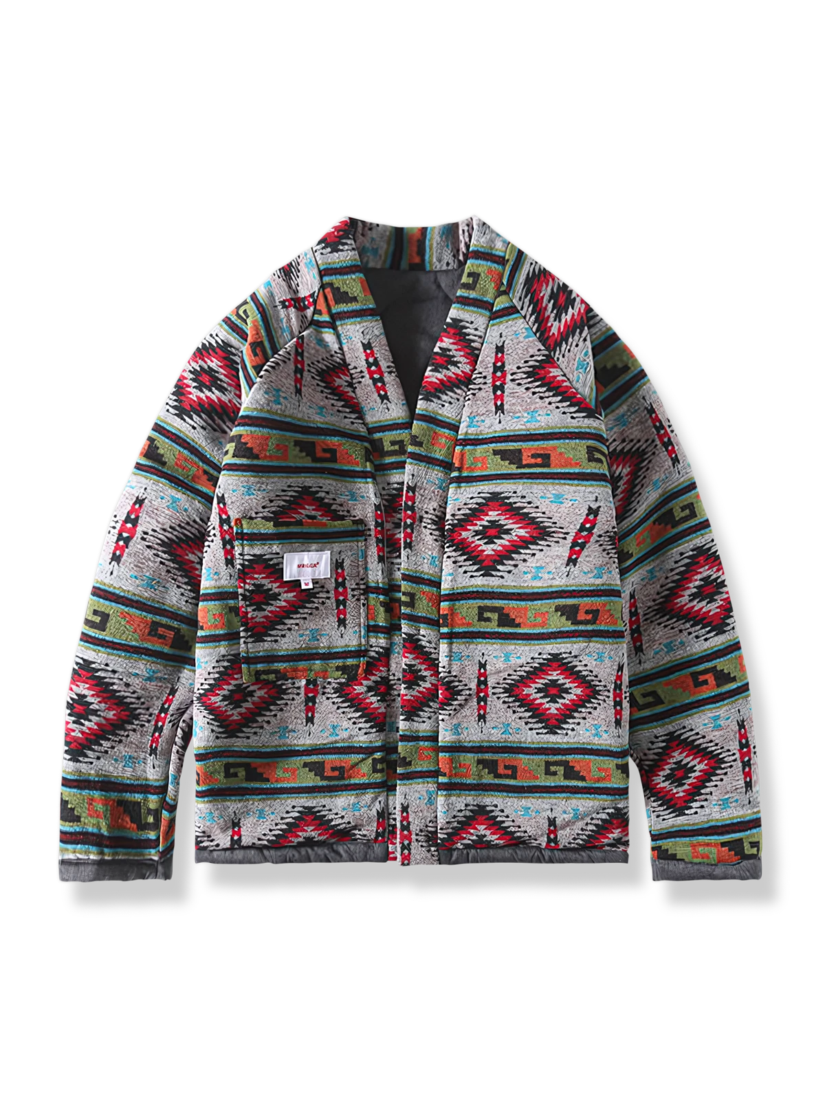 このはんてんは、伝統的な道服の要素と現代の中綿ジャケットを融合しています。民族風の服装は通常、特徴的なパターンや色使いで文化的特徴を示します。表裏ともに使える両面生地は、様々なスタイルを演出することができます。