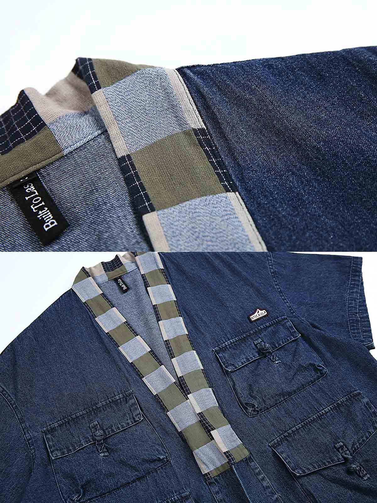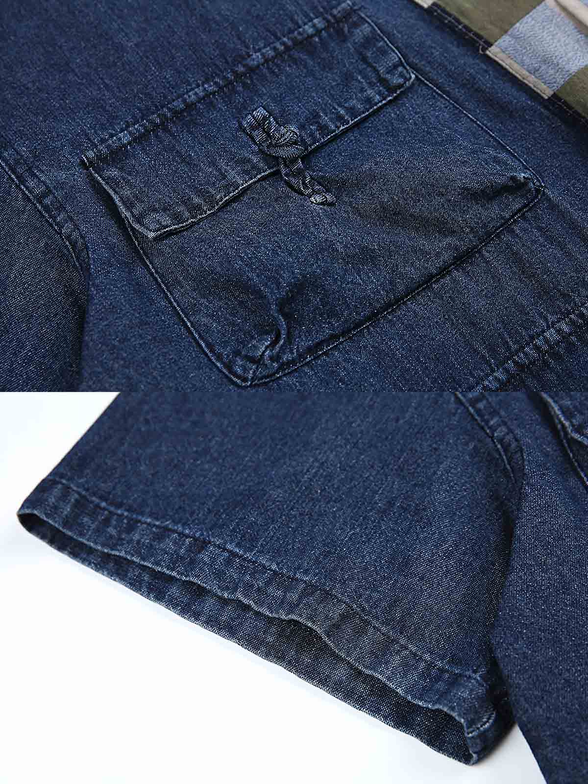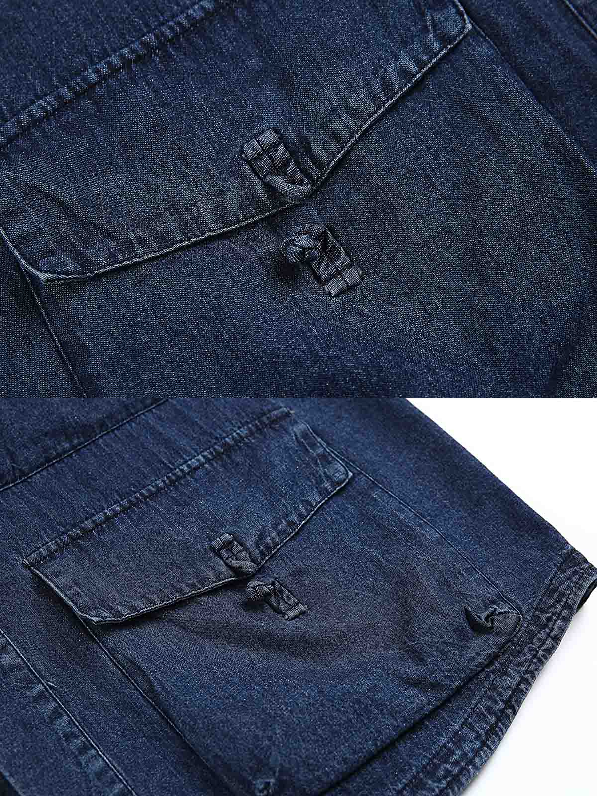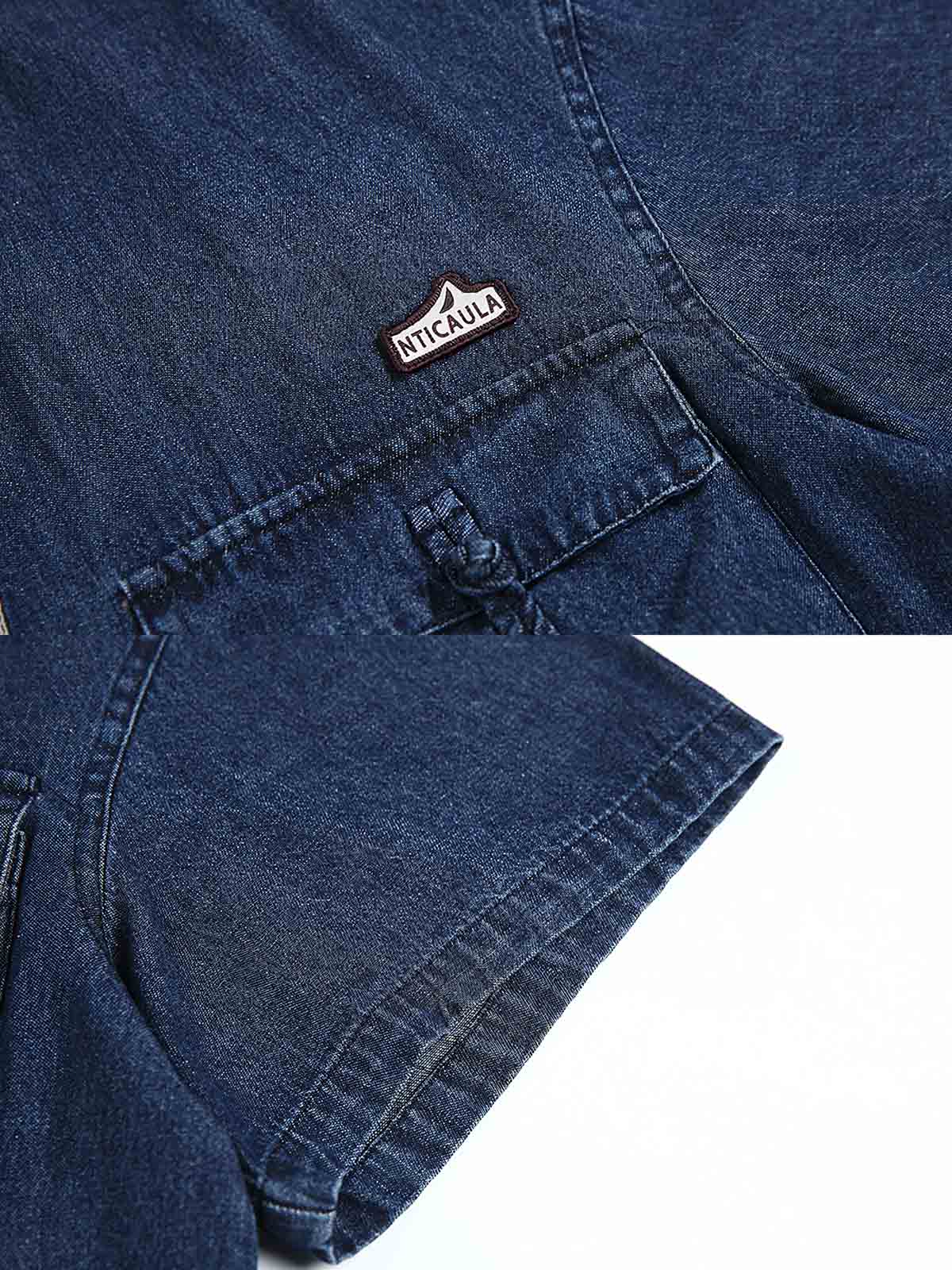 ウォッシュドデニム、多ポケットデザイン、レトロスタイル。