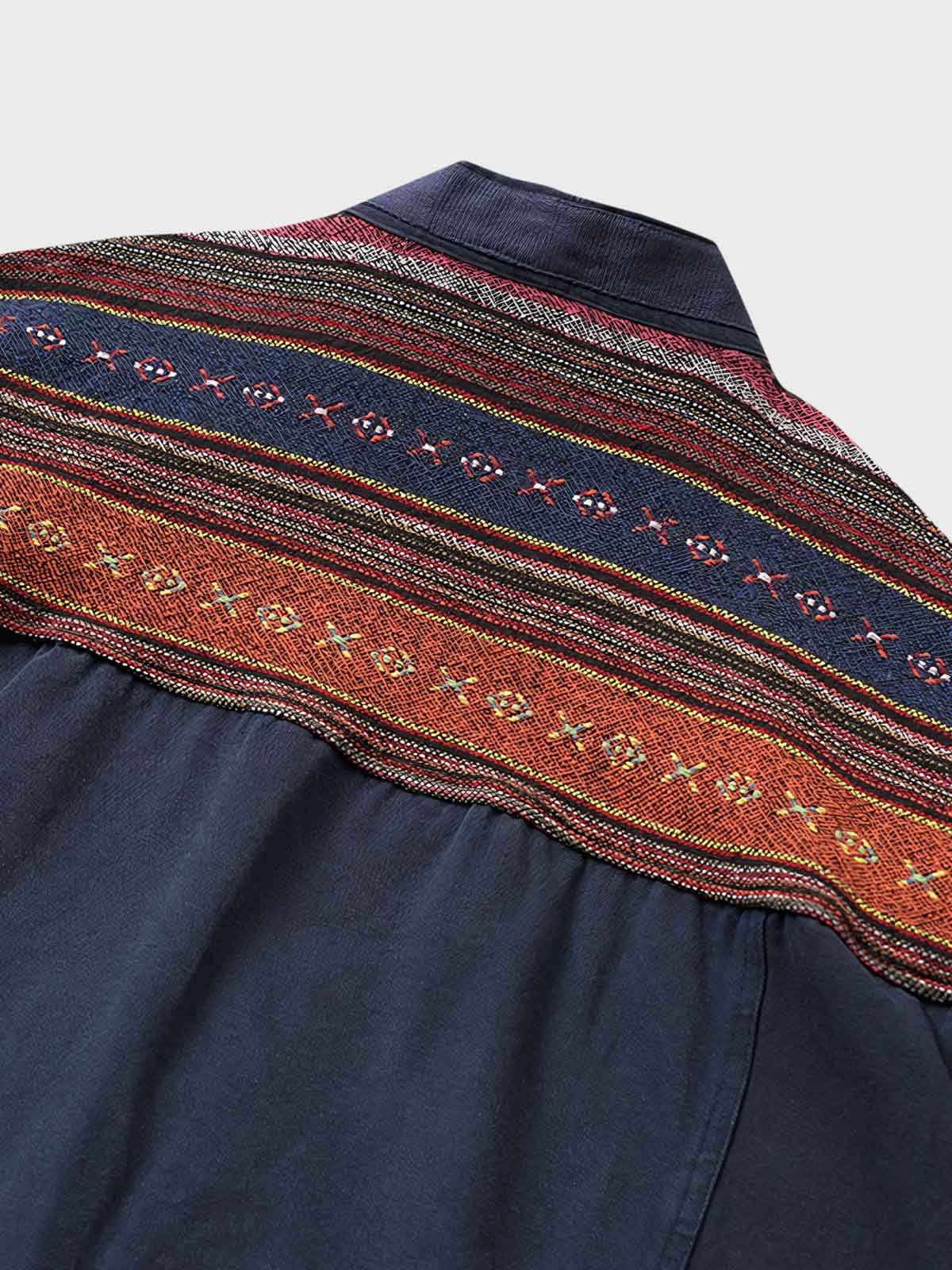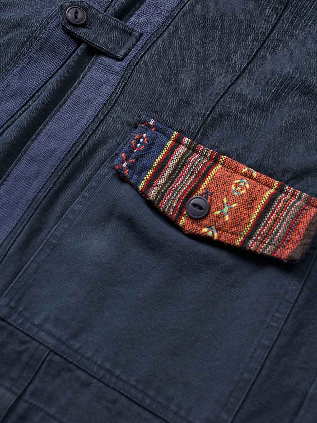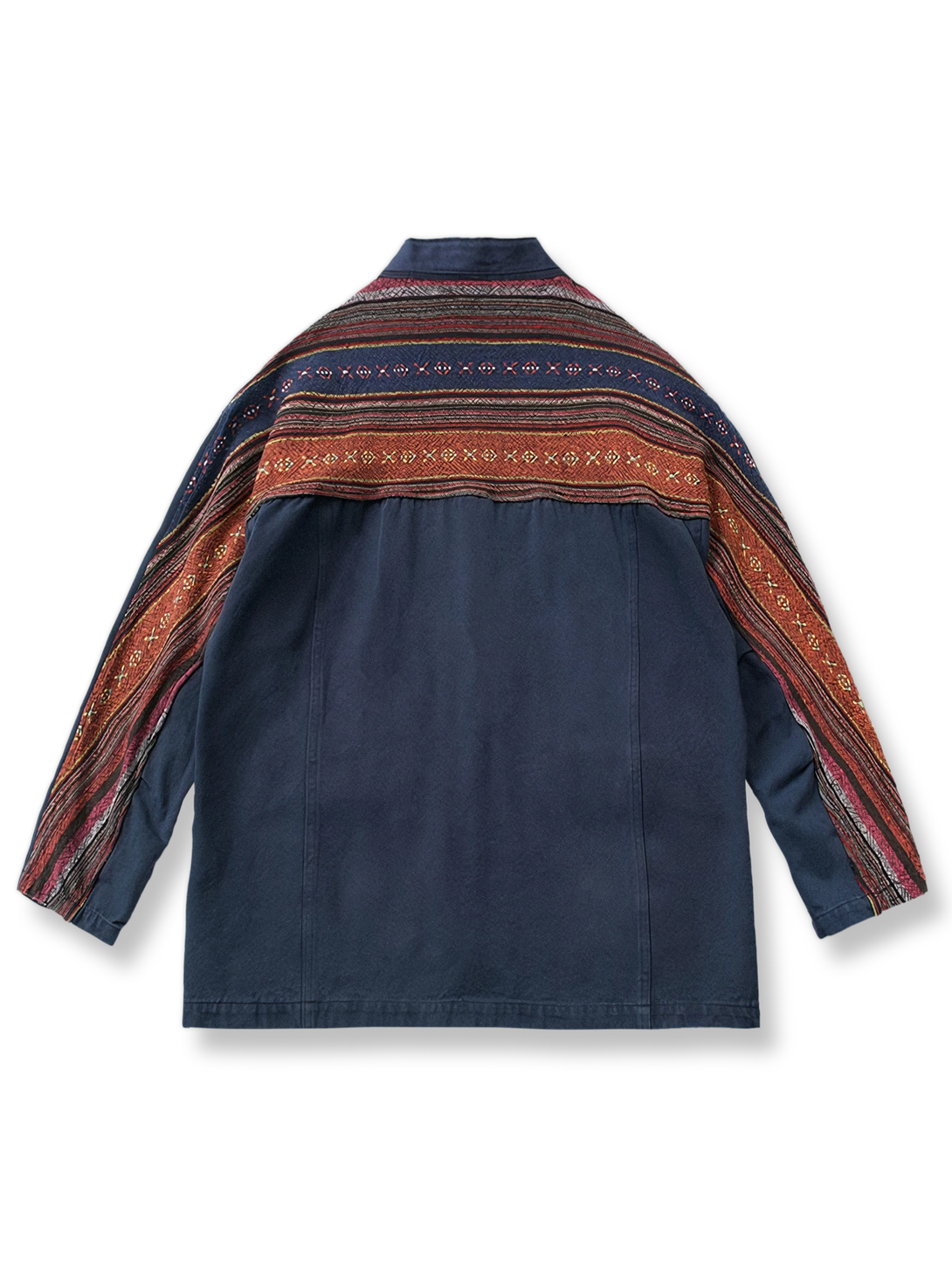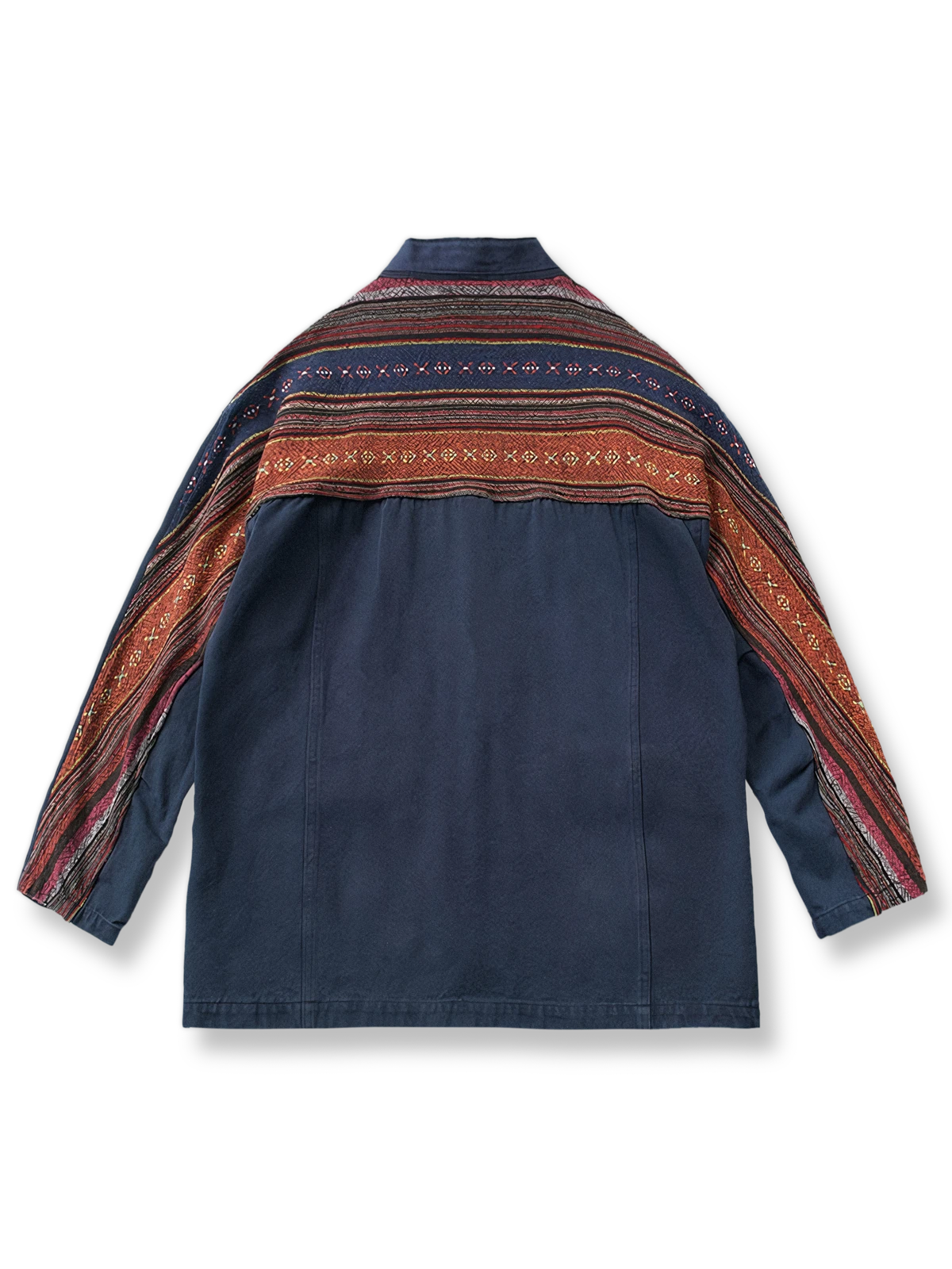 このはんてんは、ナバホ族の伝統的な織物を使用したパッチワークが特徴です。ナバホ織りはアメリカ先住民族の文化的遺産であり、独自の色彩と模様が特徴です。このはんてんは、そのような伝統技術を現代のファッションに取り入れたアイテムで、文化的な背景と現代的なデザインが融合しています。