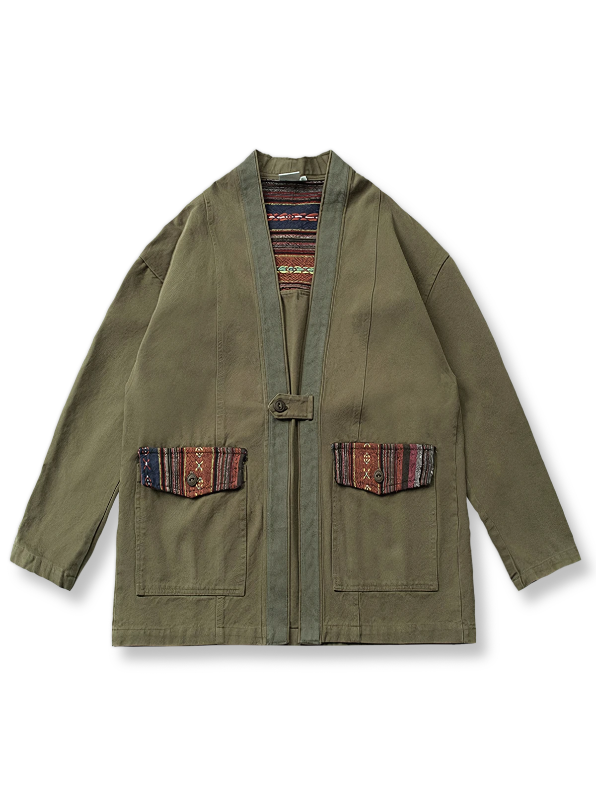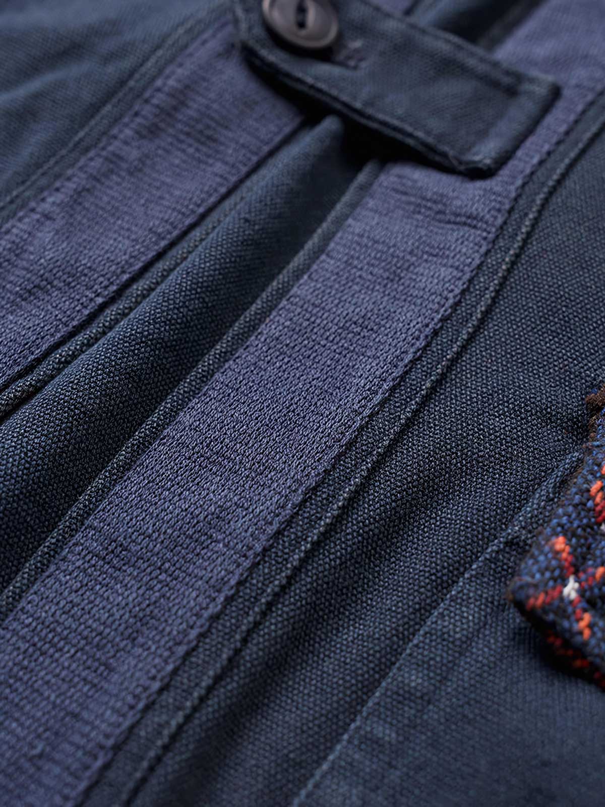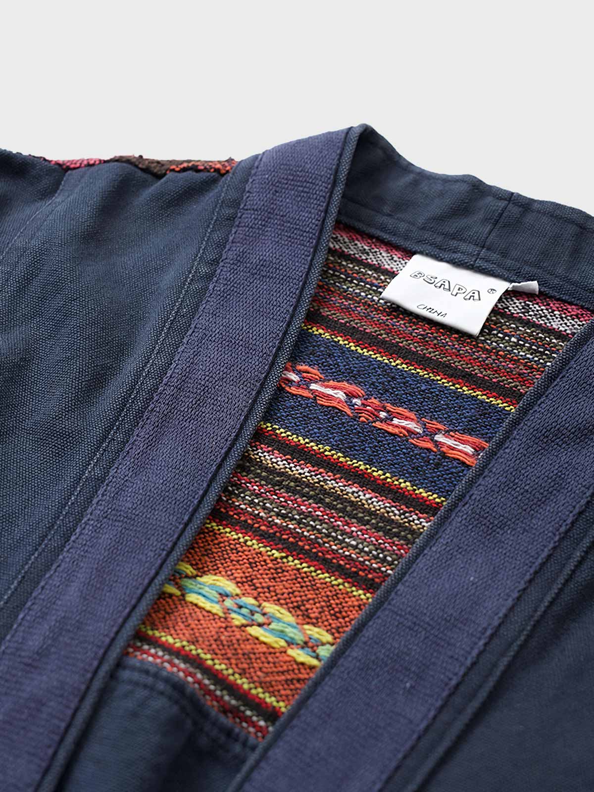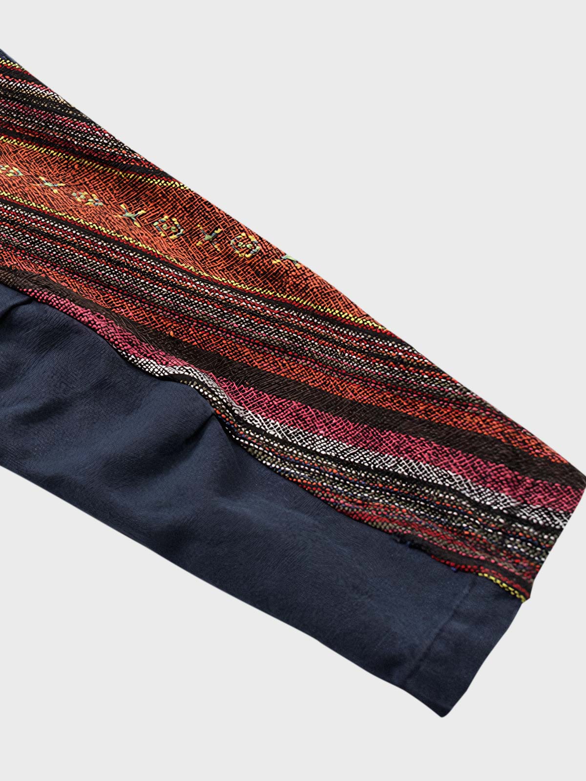 このはんてんは、ナバホ族の伝統的な織物を使用したパッチワークが特徴です。ナバホ織りはアメリカ先住民族の文化的遺産であり、独自の色彩と模様が特徴です。このはんてんは、そのような伝統技術を現代のファッションに取り入れたアイテムで、文化的な背景と現代的なデザインが融合しています。