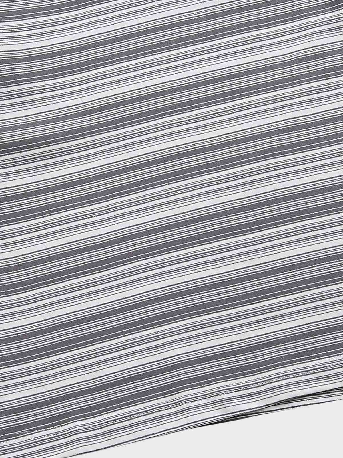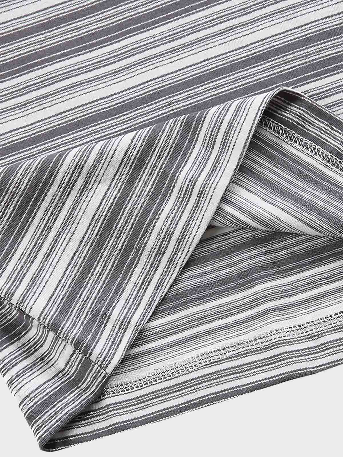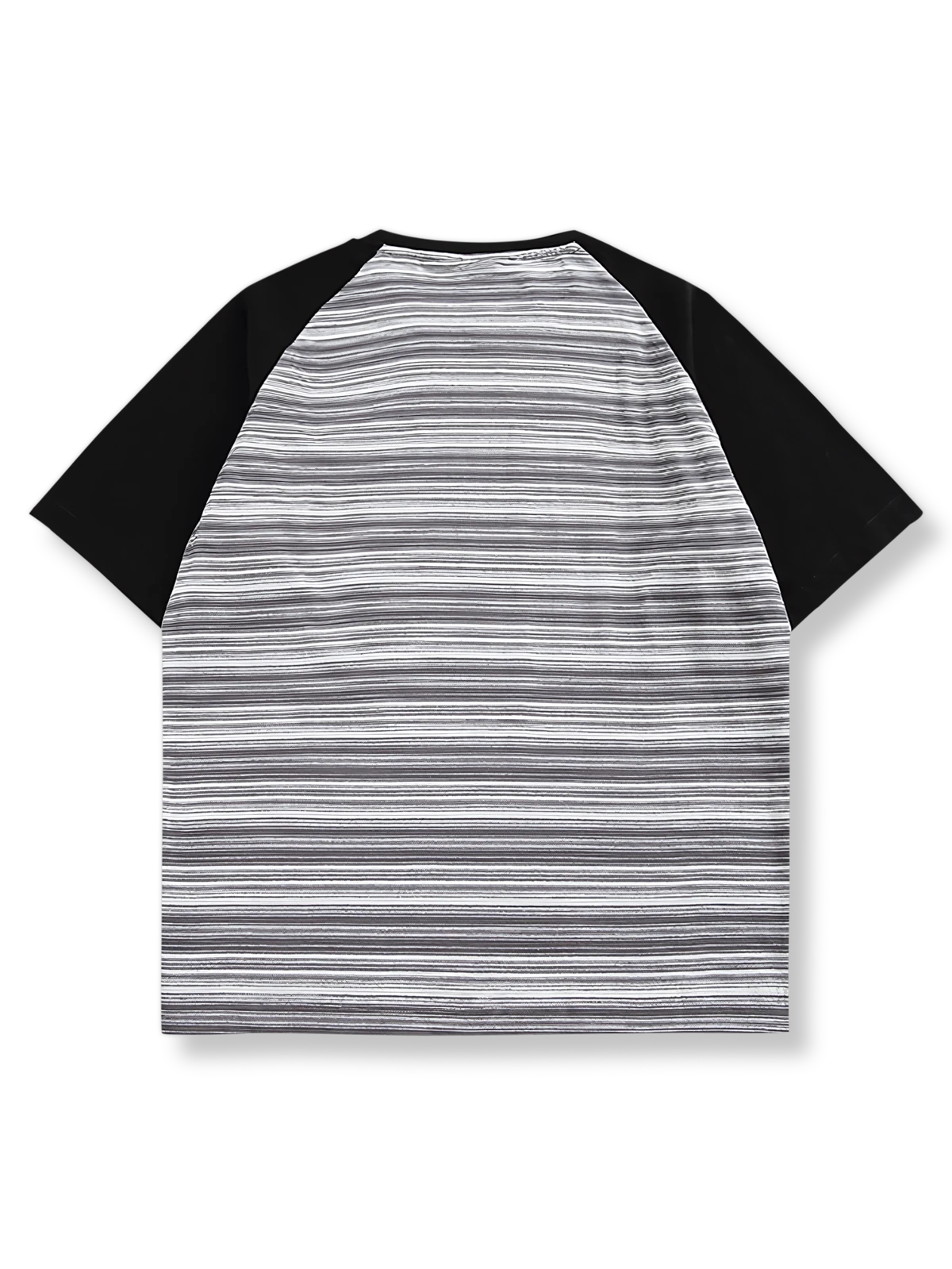 柔らかい混紡素材を使用し、通気性と快適性を確保しています。精緻なストライプデザインと鮮やかなコントラスト色の袖口が、シャツに動的な視覚効果を与え、デザインの魅力を強調しています。