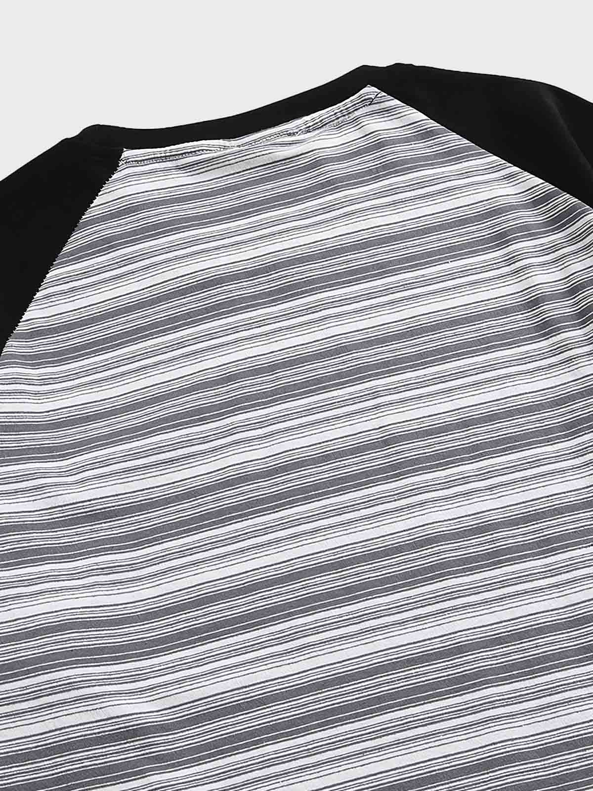このラグランスリーブTシャツは、クラシックなストライプパターンに現代的な要素を取り入れ、コントラストカラーの袖口を特徴としています。ストライプは長い服飾史において重要な役割を果たしてきた要素で、ここにモダンな色の対比が加わることで、伝統と現代のスタイルが巧みに結合されています。