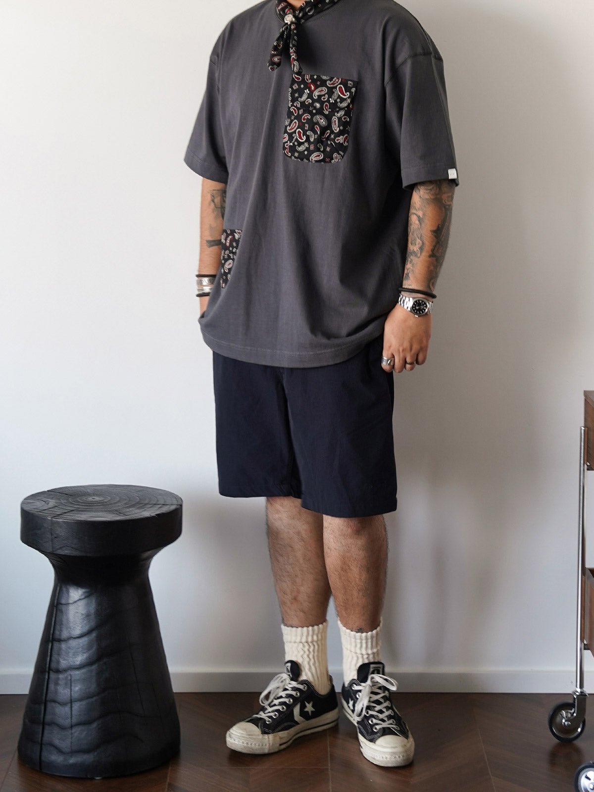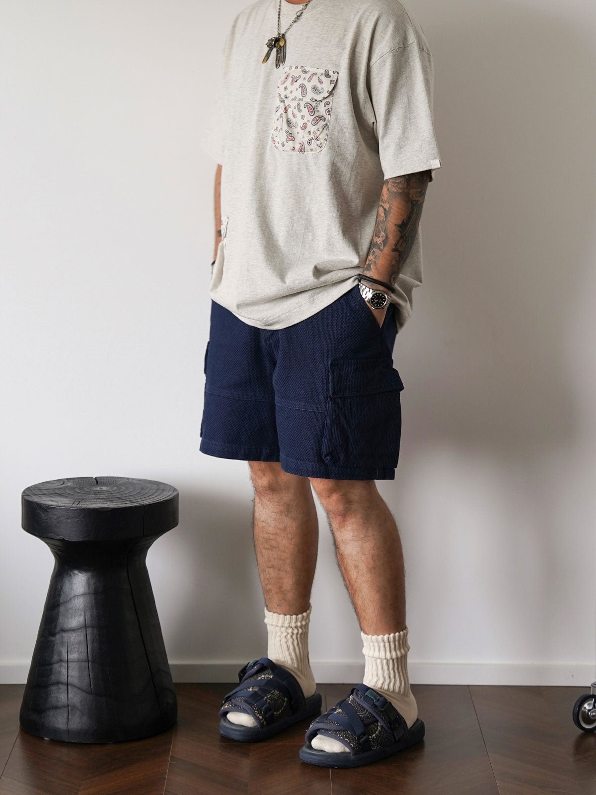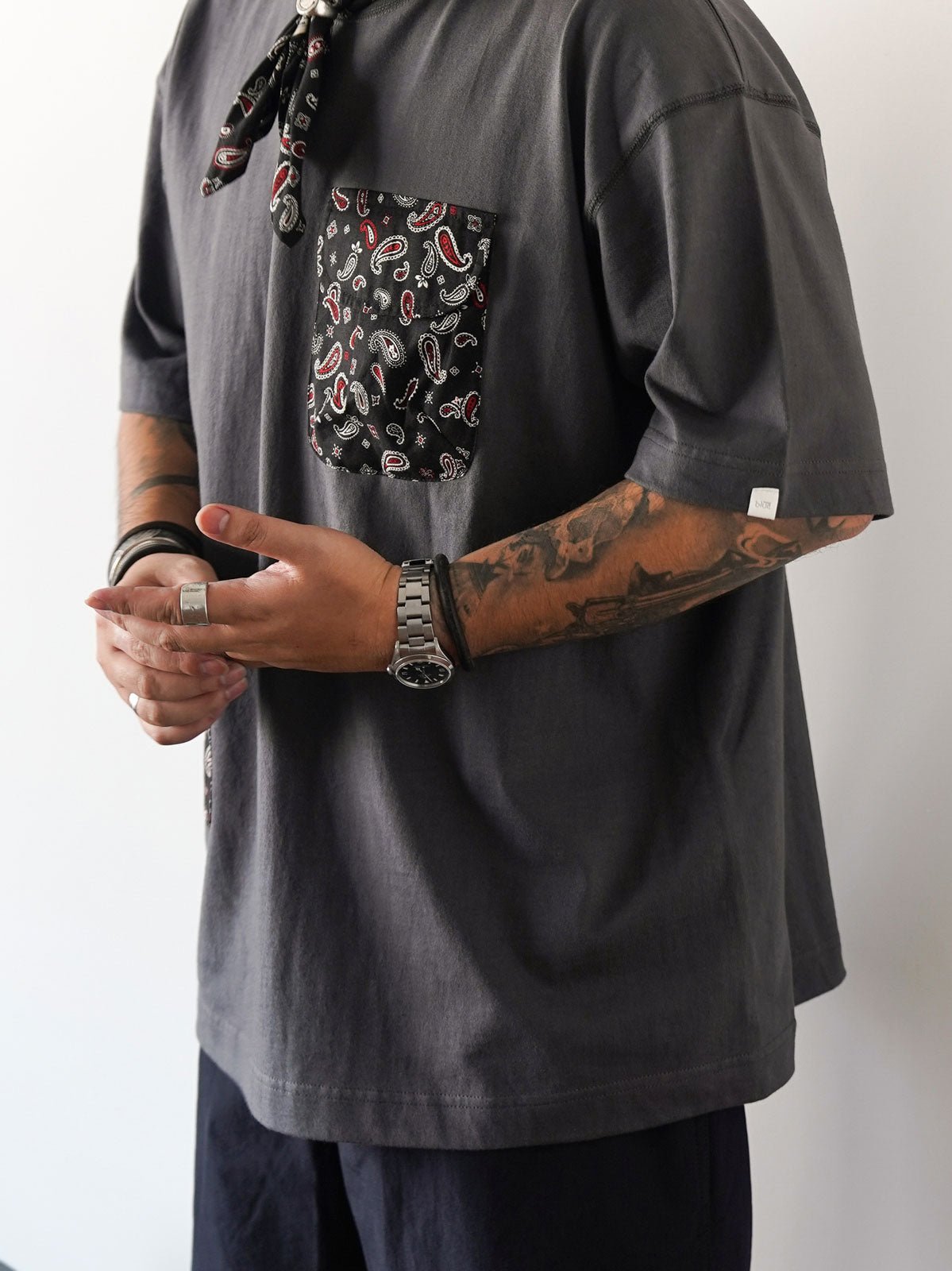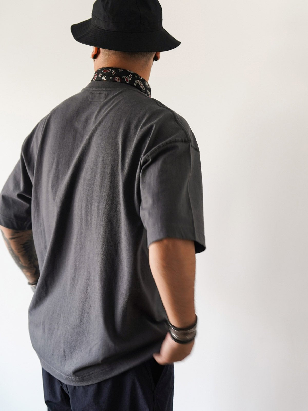 この半袖Tシャツは、高品質のペイズリープリント生地を使用したポケットが特徴です。デザインはアシンメトリーの立体的なダブルポケットで、異なるサイズの物を整理しやすくなっています。カラーはライトグレーとダークグレーの2色展開で、270gのヘビーウェイトコットン素材を使用しており、厚みがあり、しっかりとしたシルエットが高級感を演出します。チューブ編みのシームレスデザインで、快適な着心地を提供します。襟は厚手のダブルリブで、内側には肩を通るテープが追加されており、型崩れしにくい仕様です。肩と襟はトリプルステッチで強度を高めています。ゆったりとしたドロップショルダーのデザインは、さまざまな和風のスタイルに適しています。日常のカジュアルコーディネートに最適です。