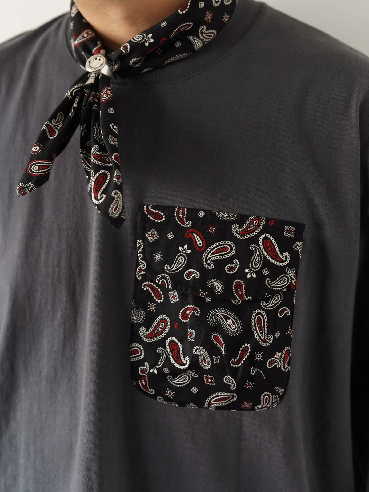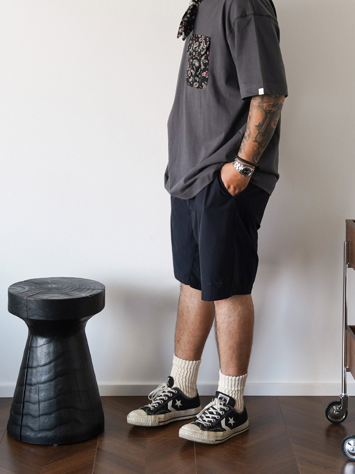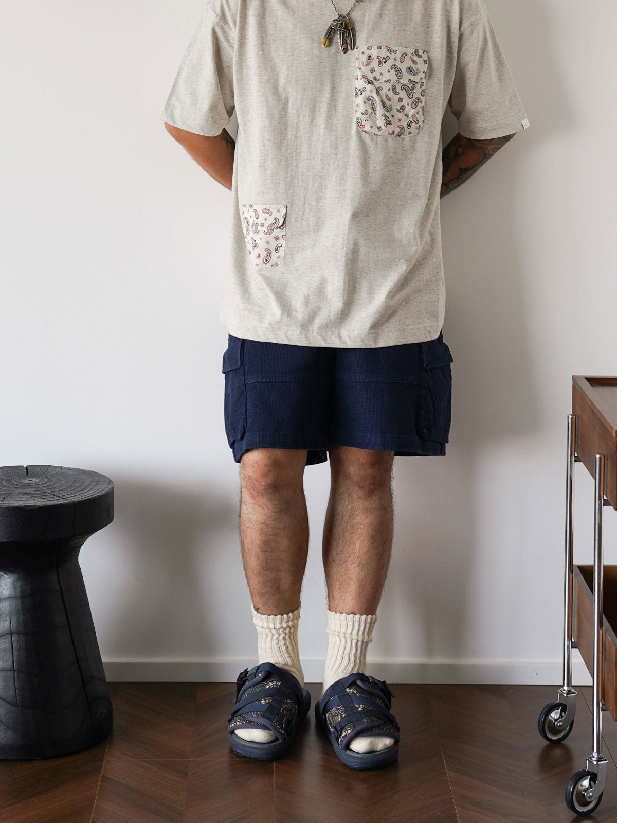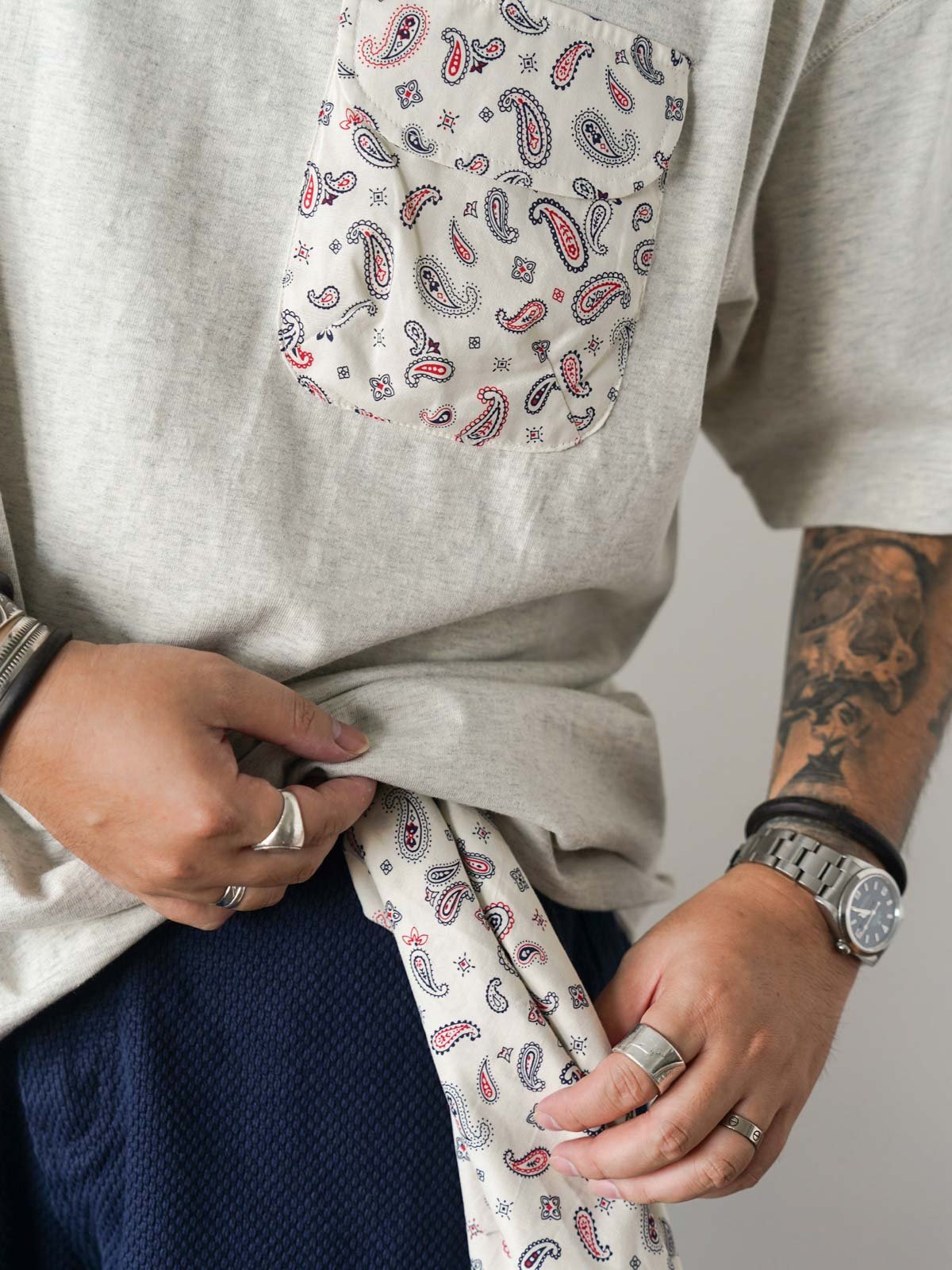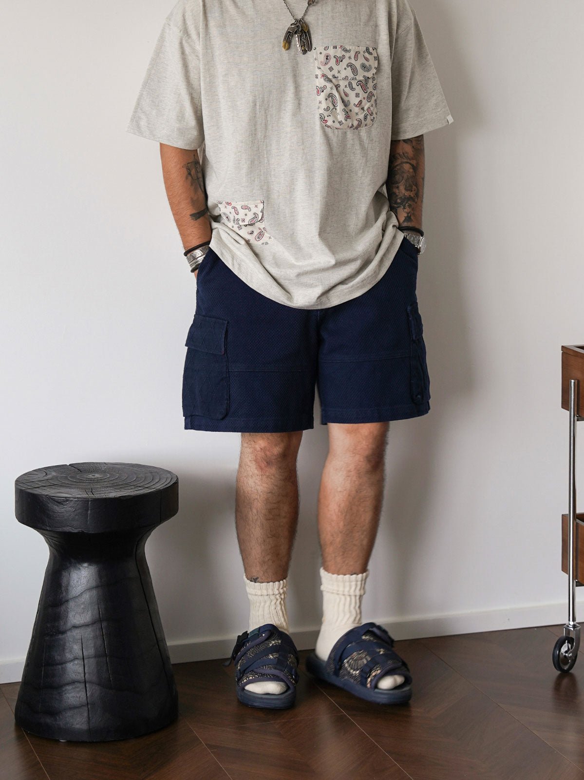 この半袖Tシャツは、高品質のペイズリープリント生地を使用したポケットが特徴です。デザインはアシンメトリーの立体的なダブルポケットで、異なるサイズの物を整理しやすくなっています。カラーはライトグレーとダークグレーの2色展開で、270gのヘビーウェイトコットン素材を使用しており、厚みがあり、しっかりとしたシルエットが高級感を演出します。チューブ編みのシームレスデザインで、快適な着心地を提供します。襟は厚手のダブルリブで、内側には肩を通るテープが追加されており、型崩れしにくい仕様です。肩と襟はトリプルステッチで強度を高めています。ゆったりとしたドロップショルダーのデザインは、さまざまな和風のスタイルに適しています。日常のカジュアルコーディネートに最適です。