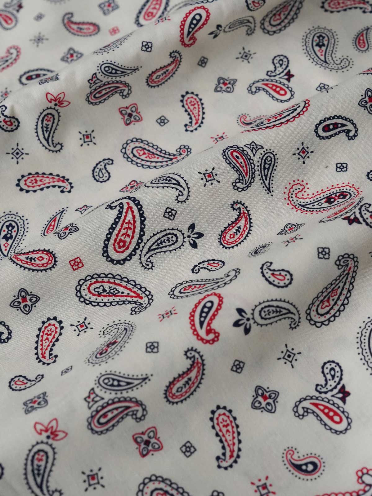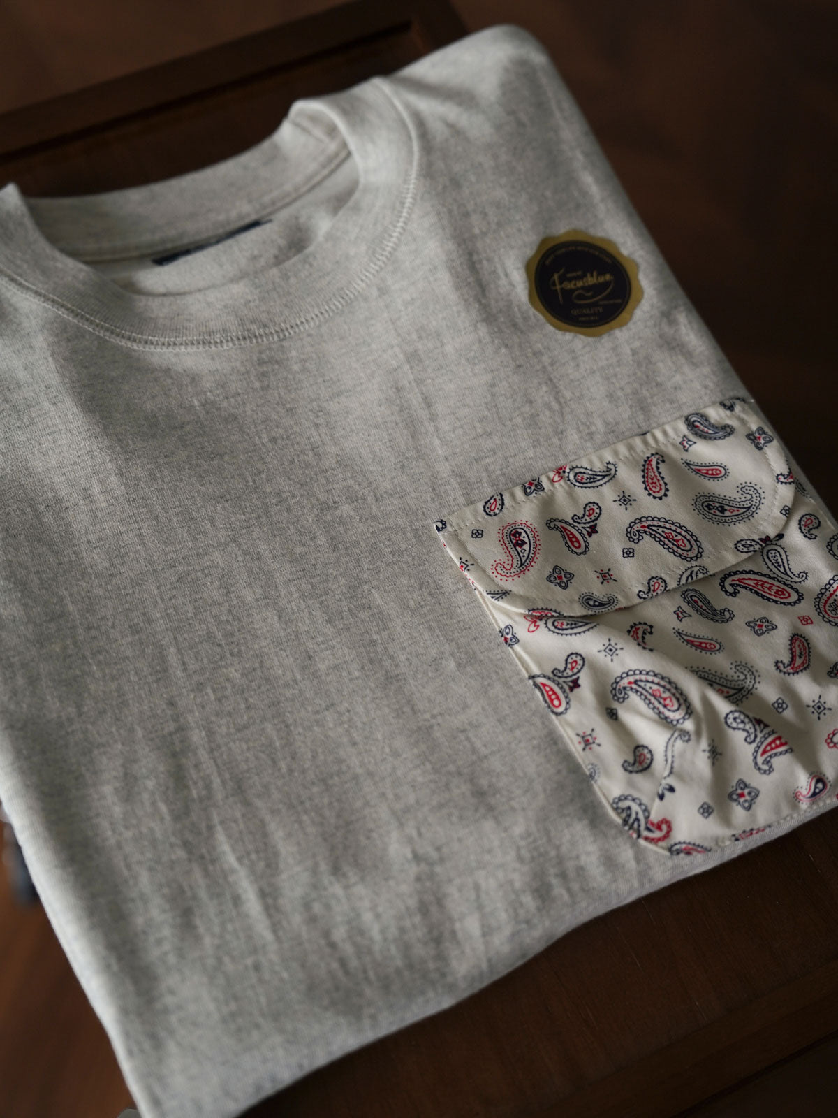 270gのコットン素材、ペイズリープリントのダブルポケットデザイン、ゆったりとしたドロップショルダー。