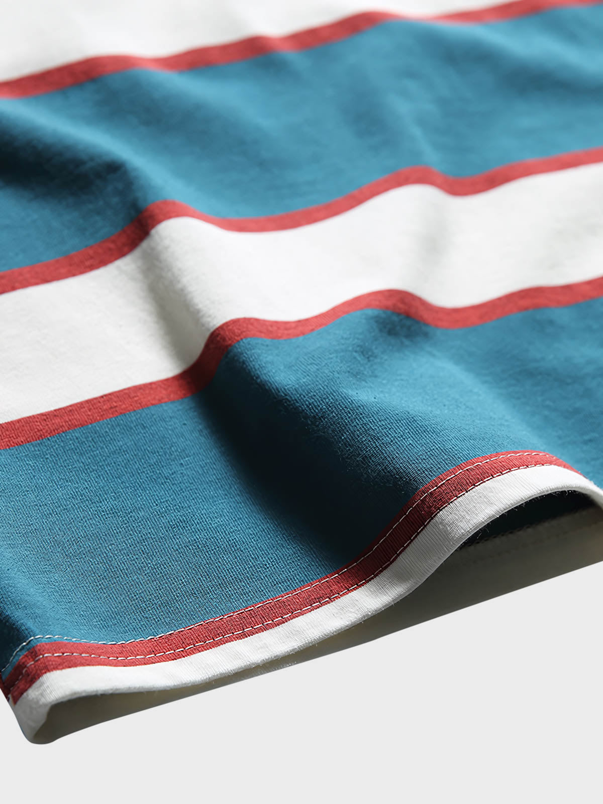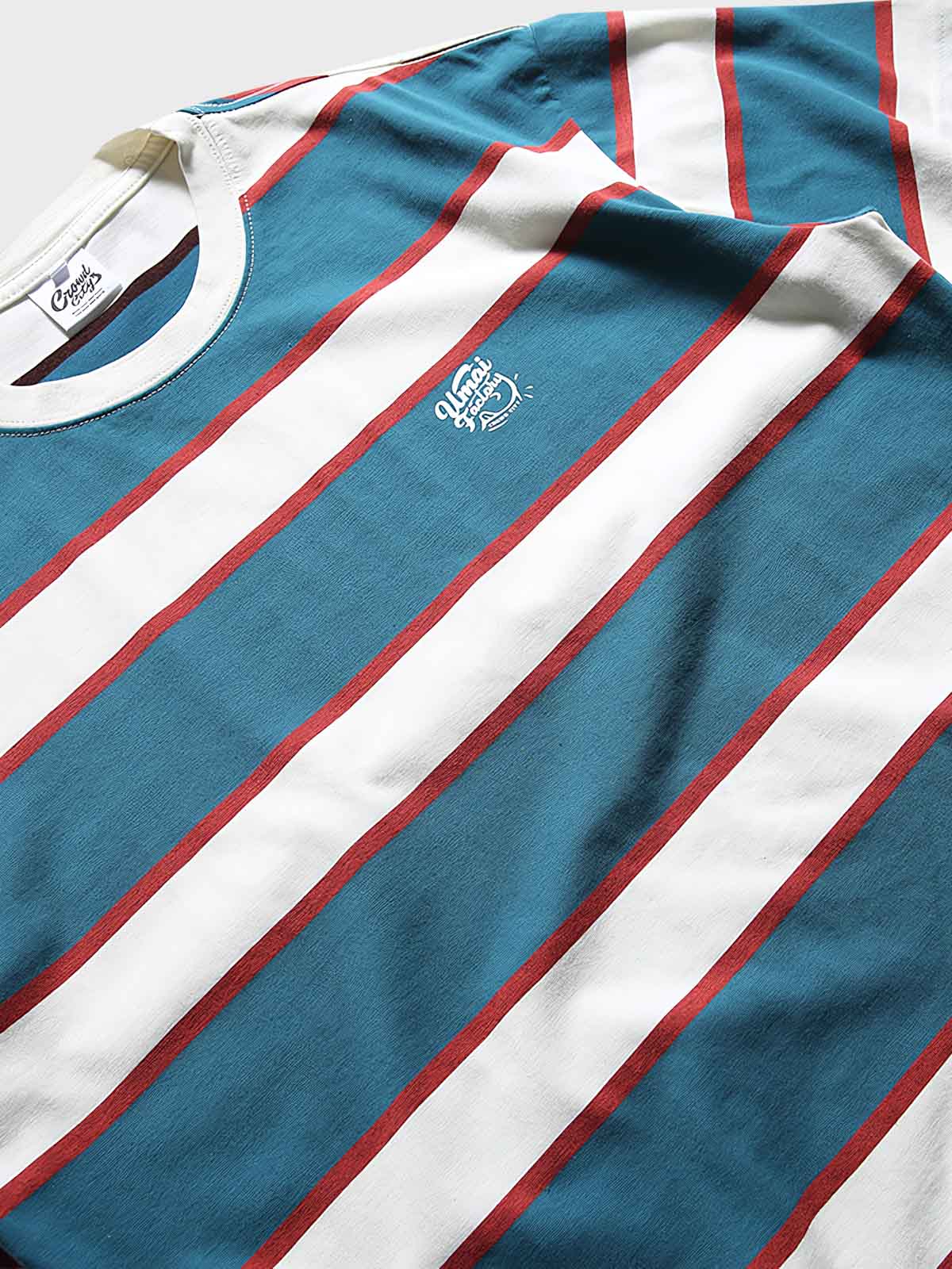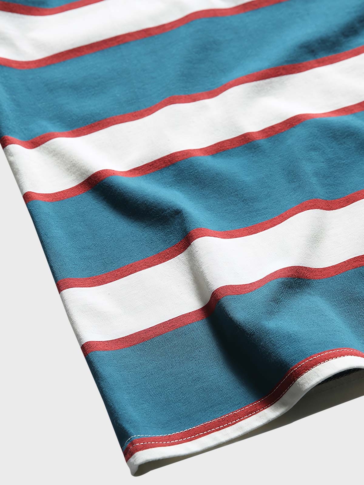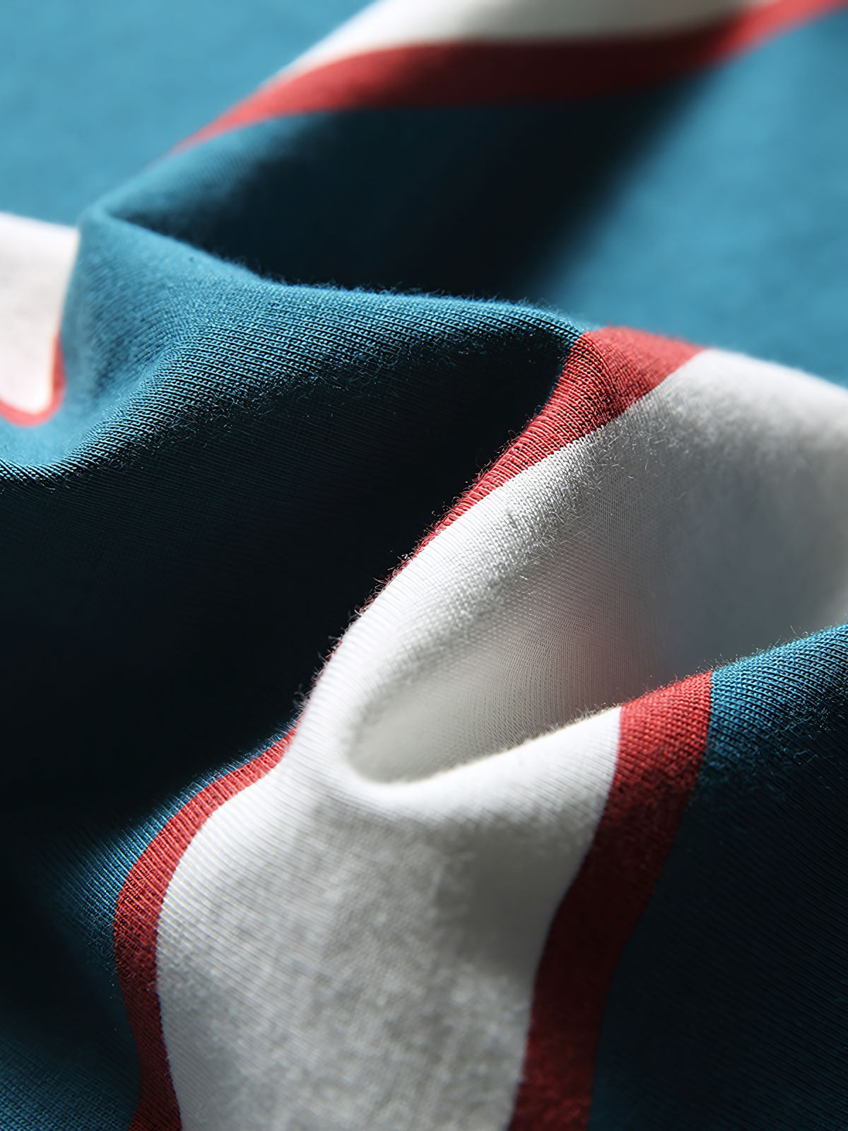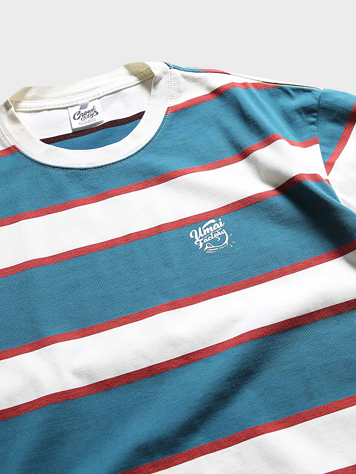 高品質の純綿は通気性と吸湿性に富み、日常の使用に耐えうる耐久性を備えています。シンプルながらも効果的な胸元のアルファベットプリントは、ストライプパターンを引き立てる重要なデザイン要素です。