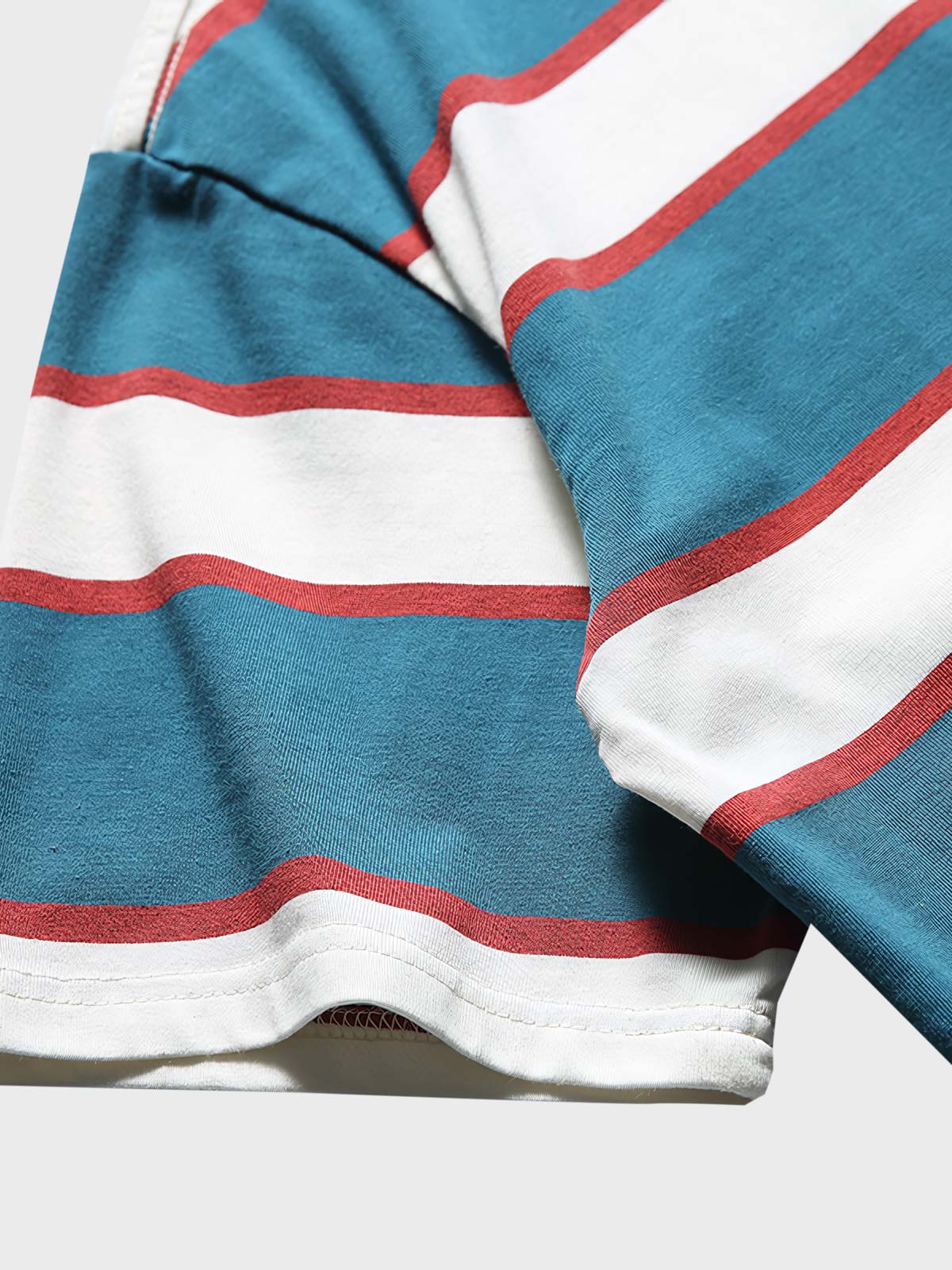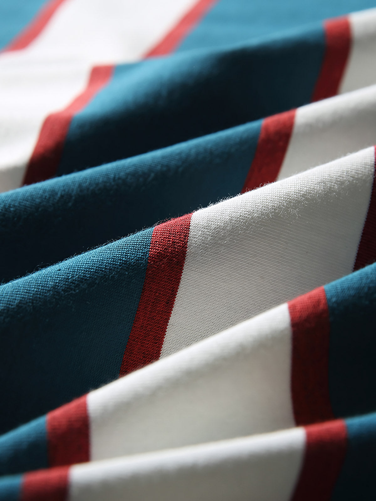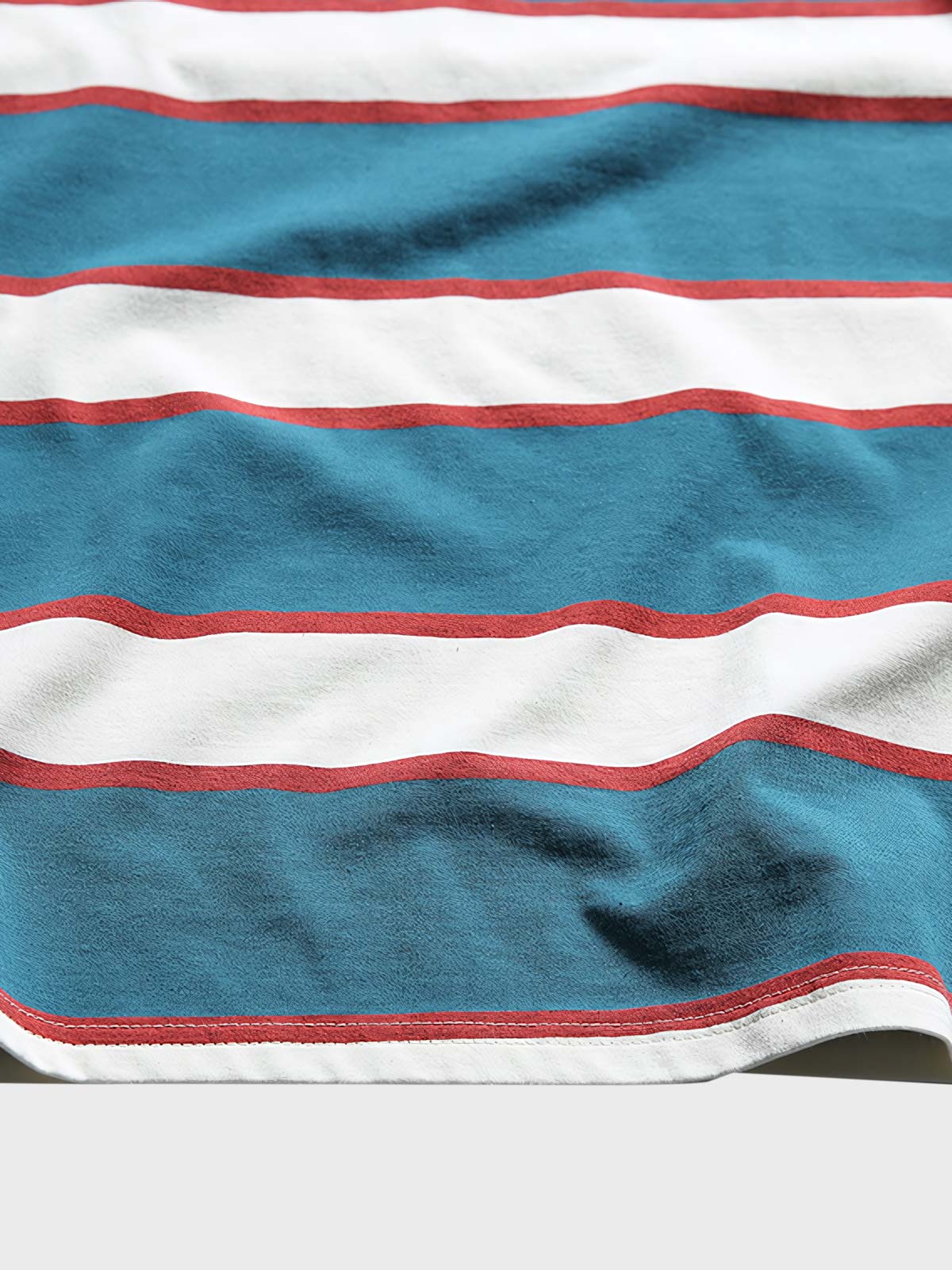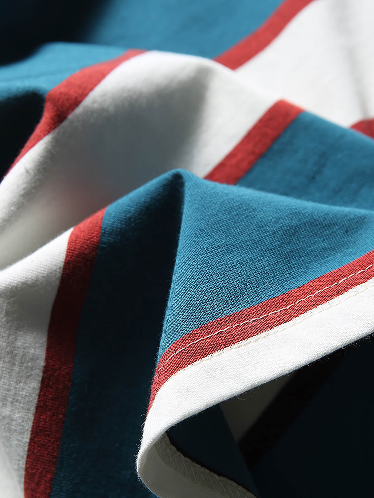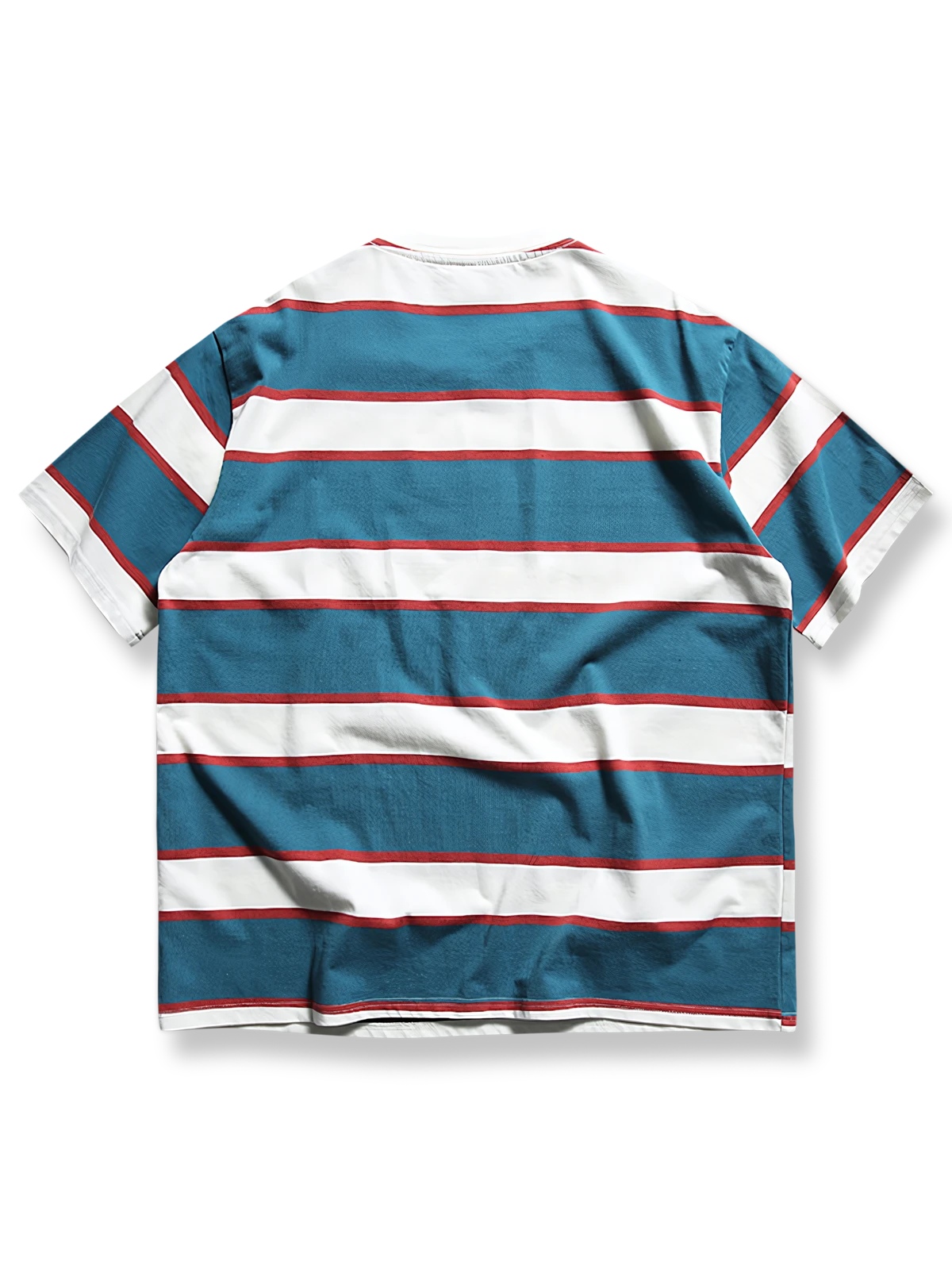 高品質の純綿は通気性と吸湿性に富み、日常の使用に耐えうる耐久性を備えています。シンプルながらも効果的な胸元のアルファベットプリントは、ストライプパターンを引き立てる重要なデザイン要素です。