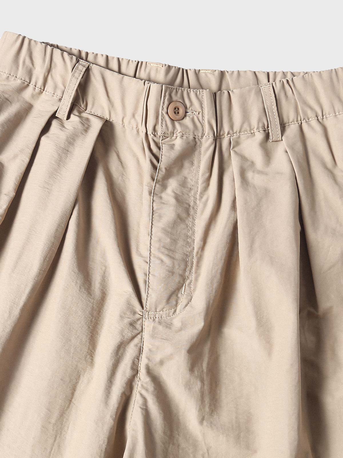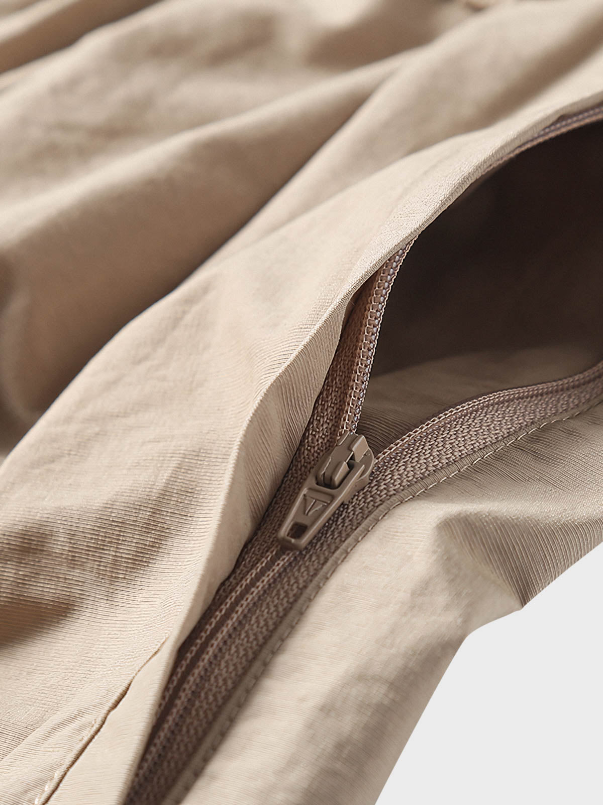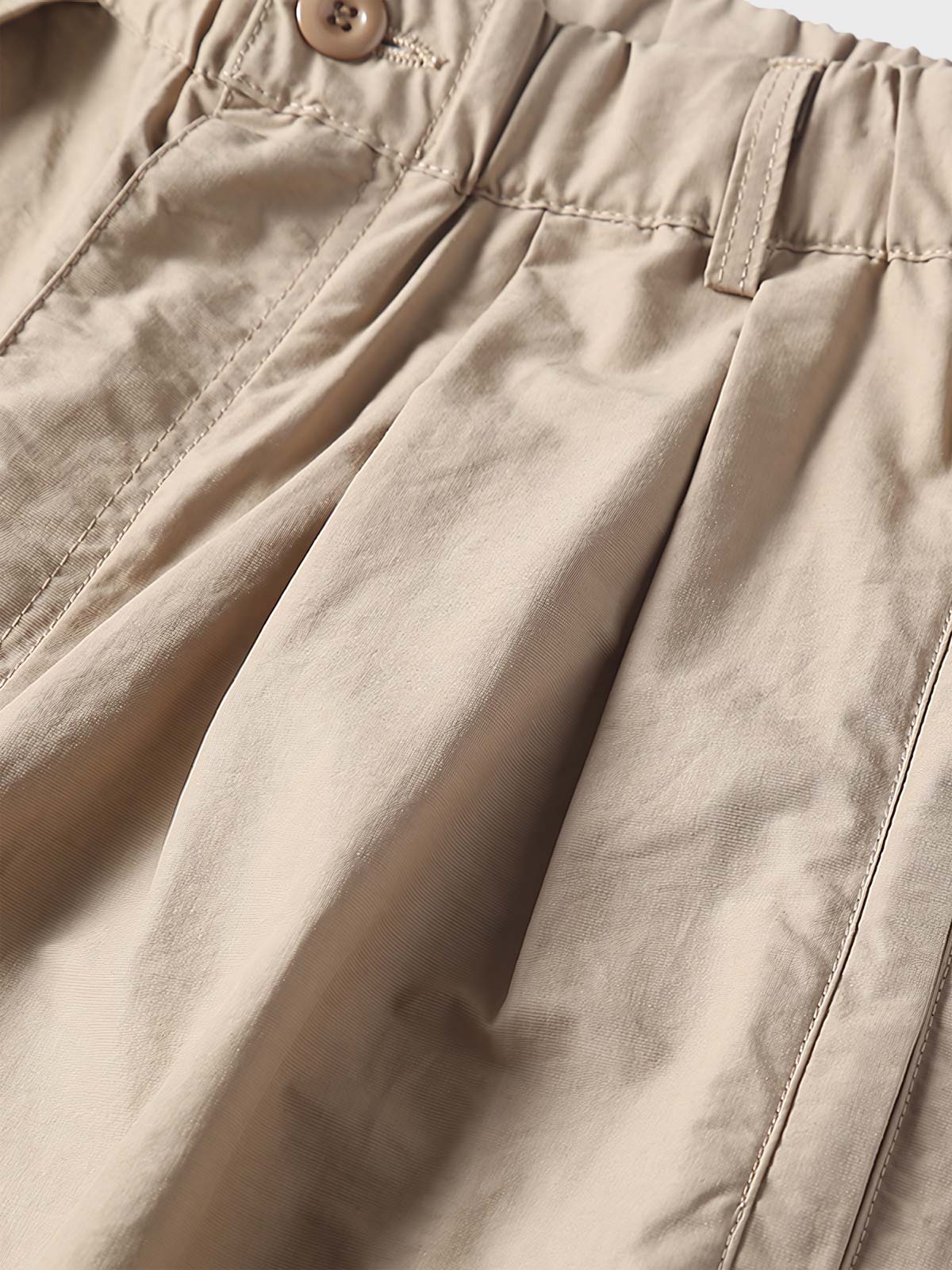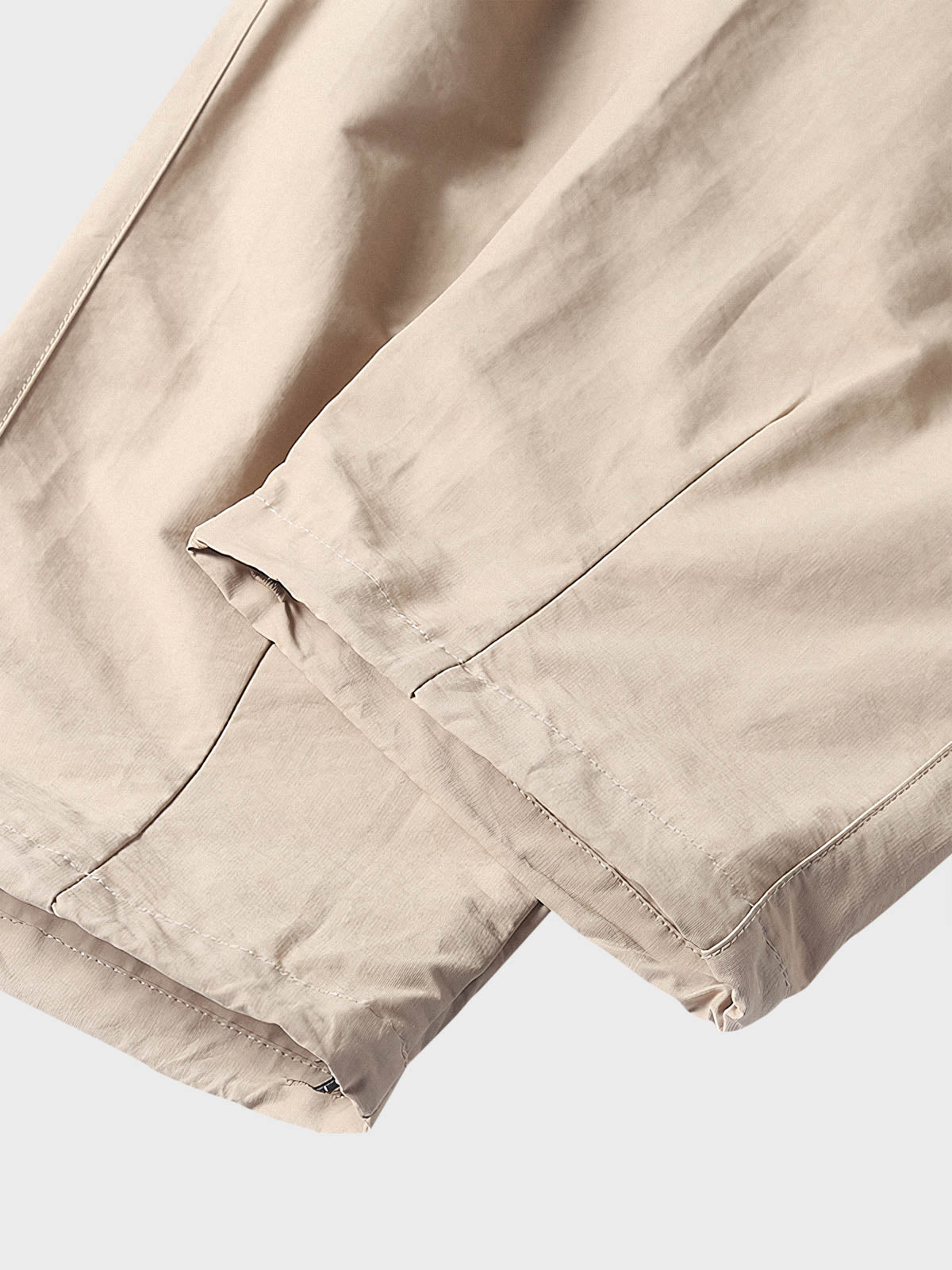 ゆったりとしたシルエットにより、動きやすさを確保しつつ、洗練された都会的な印象を与えます。ウエストのゴムバンドと調節可能なドローストリングは、個々の体型に合わせてフィット感を調整できるように配慮されています。サイドとバックに配されたポケットは、機能性を高めると同時に、ユーティリティスタイルの要素を強調しています。