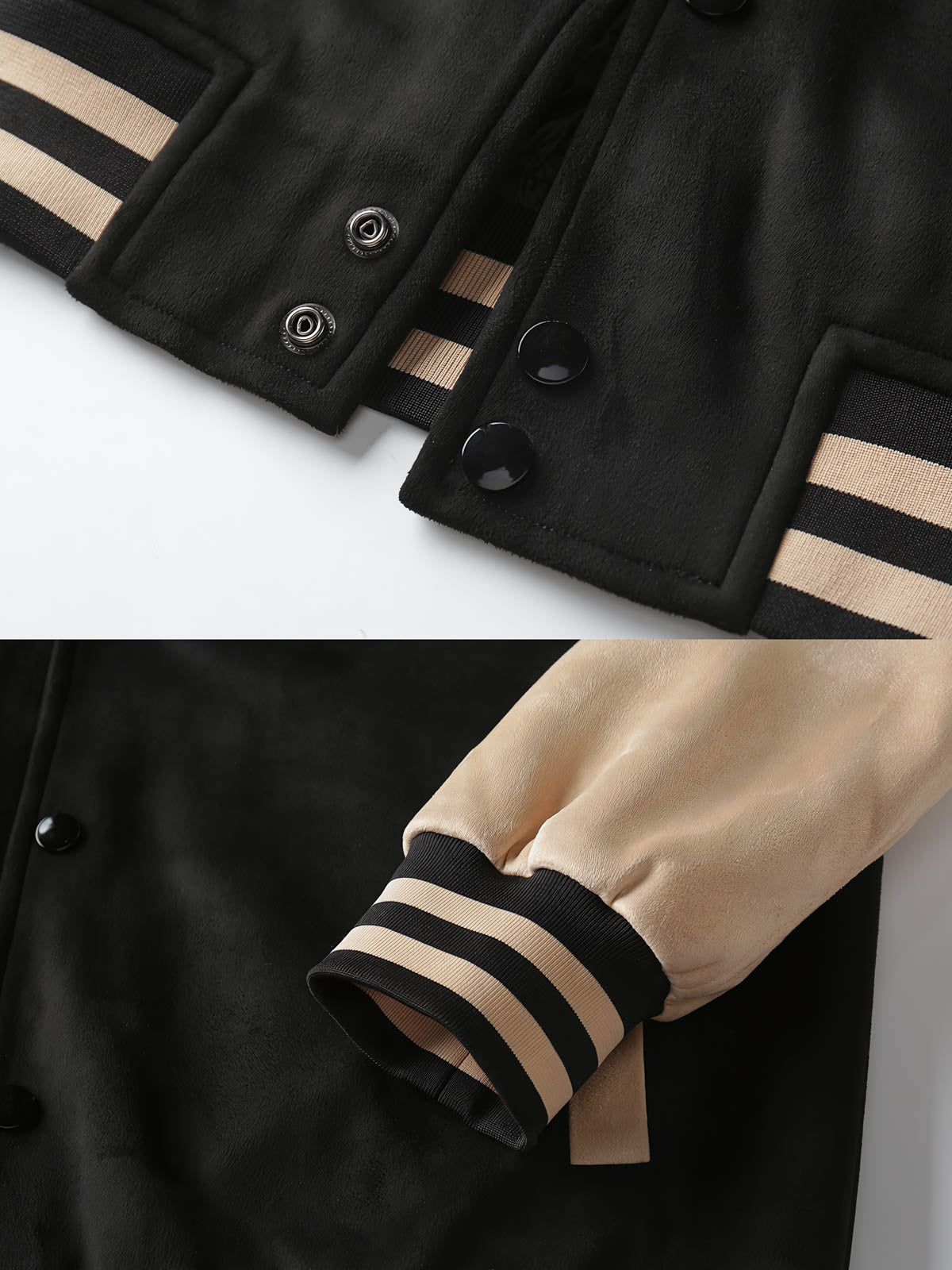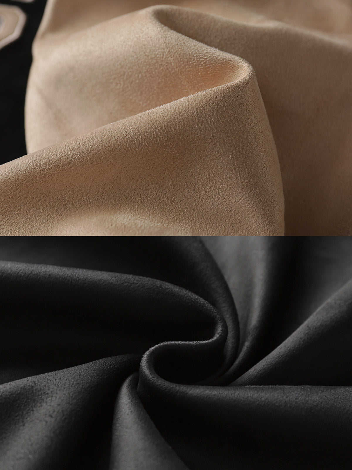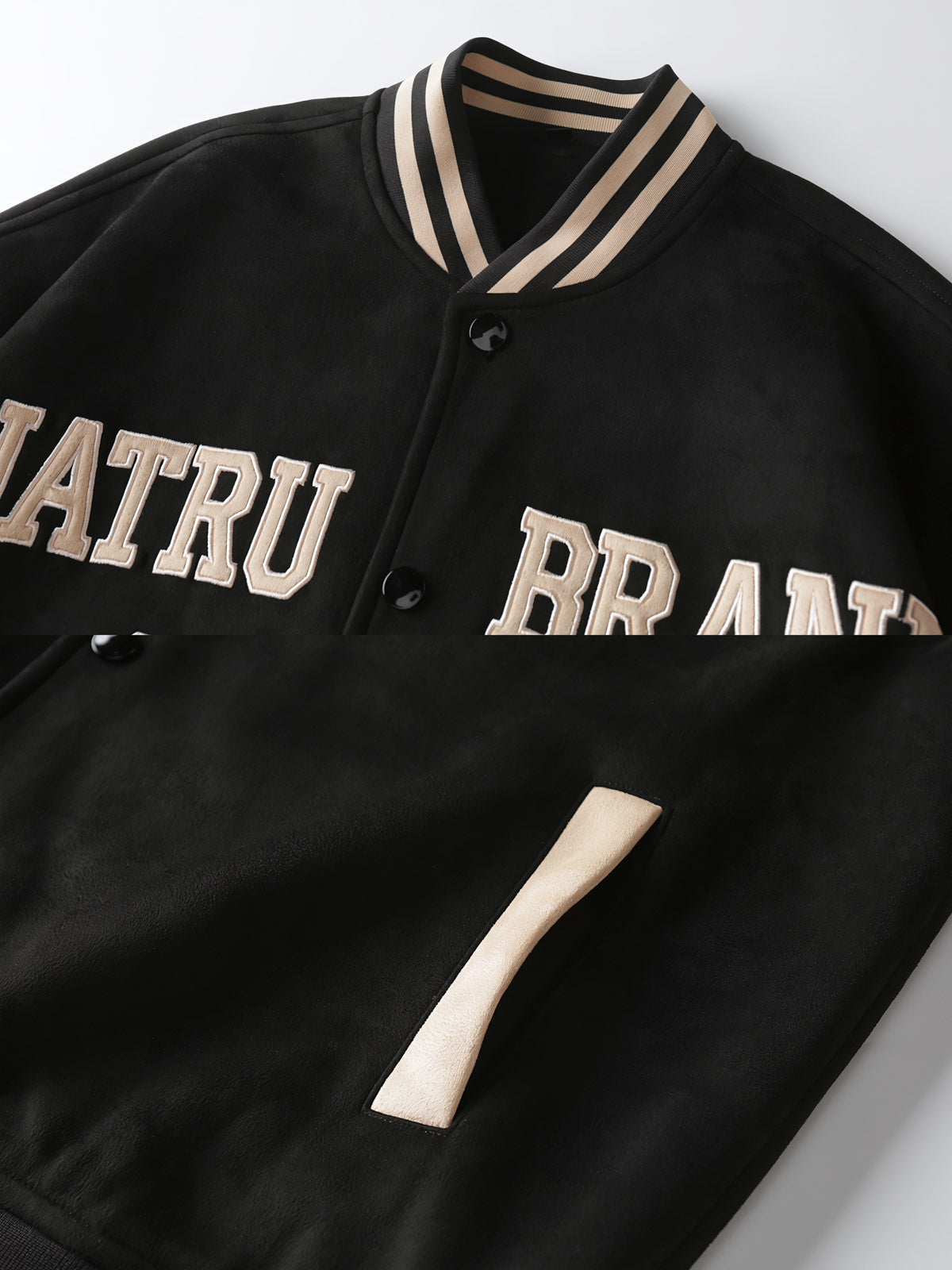 このディアスキンベロアの野球ジャケットは、リラックスフィットのデザインを採用しており、クラシックな野球ジャケットの快適さを保ちつつ、現代的なファッション要素を加えています。ディアスキンベロア素材の選択により、着用感と全体の品質が向上しました。