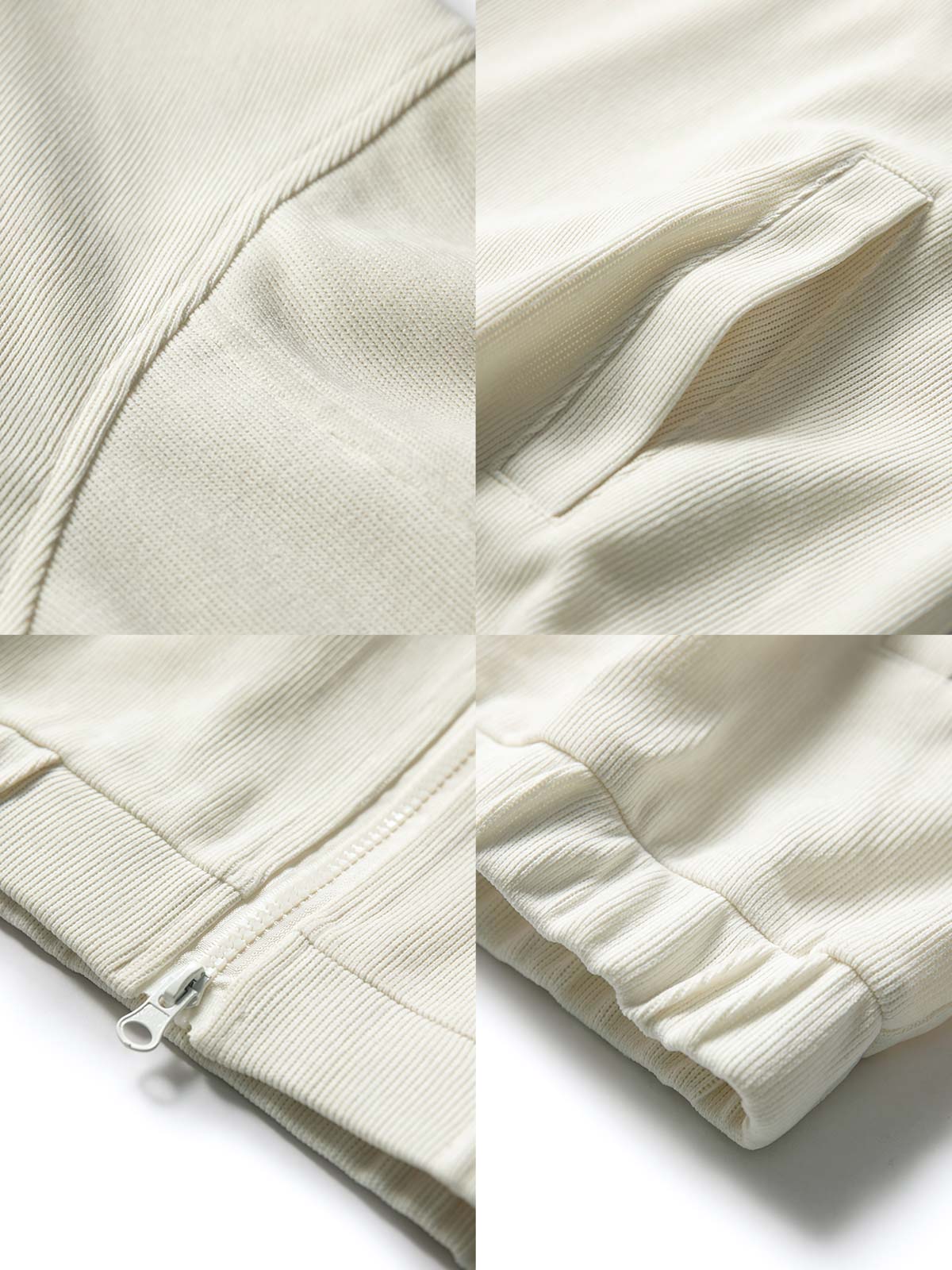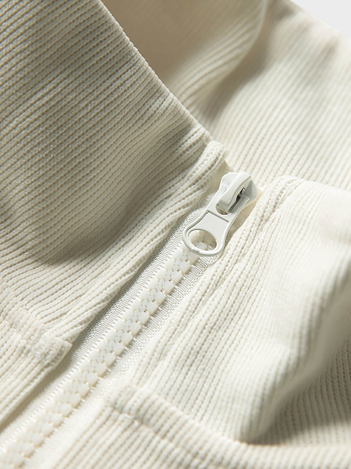 ジャケットはリラックスフィットで、快適な着心地を提供しながらも、すっきりとした印象を与えます。裾と袖口のリブがしっかりとフィットし、形を整えます。