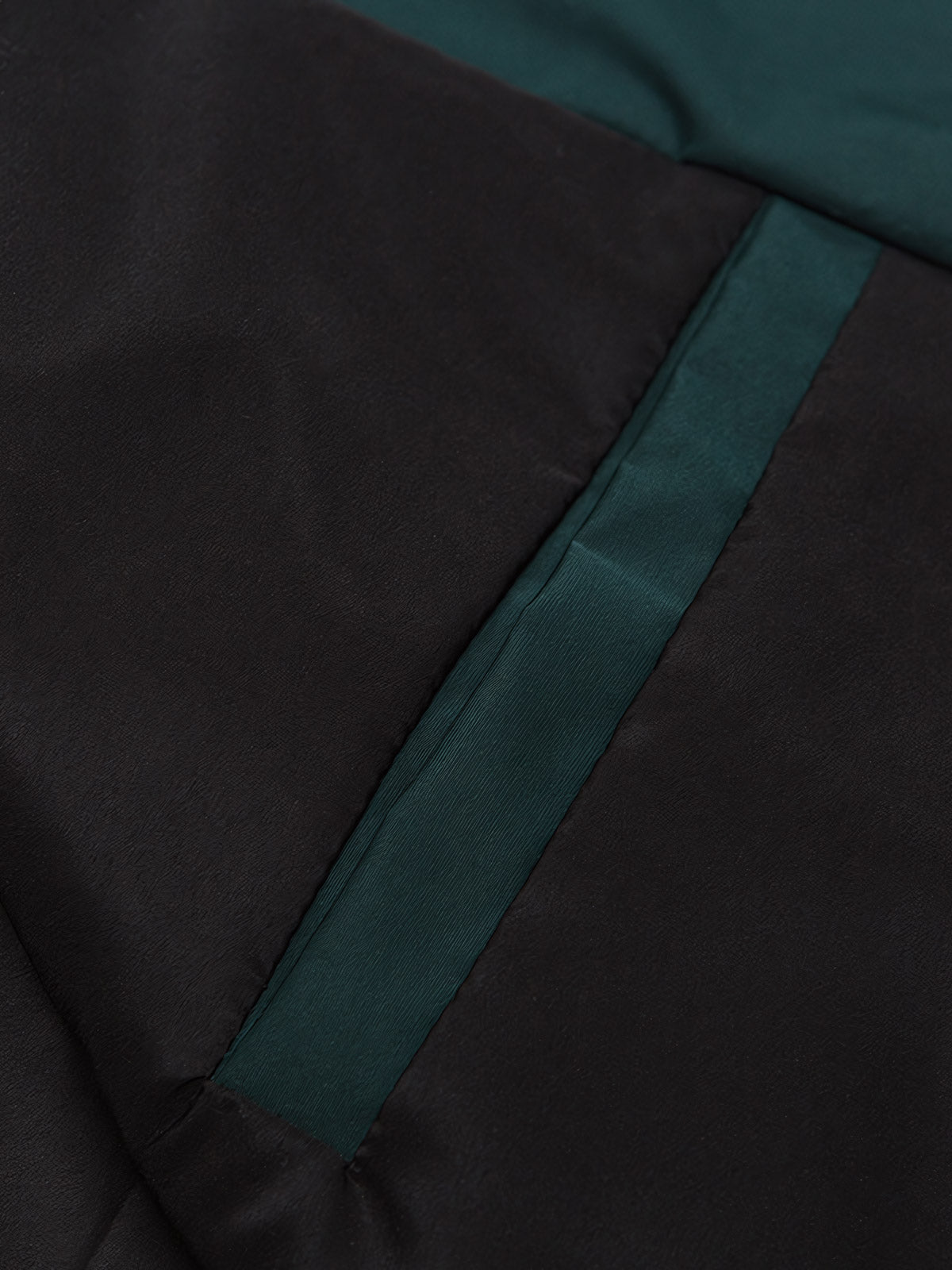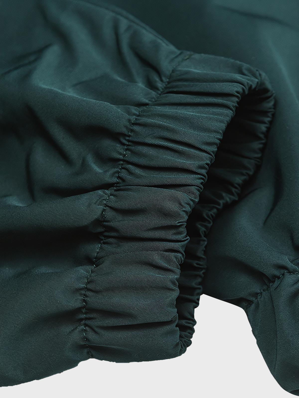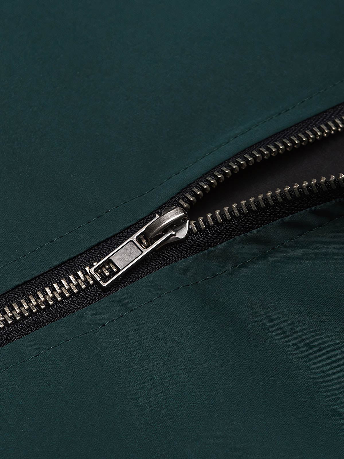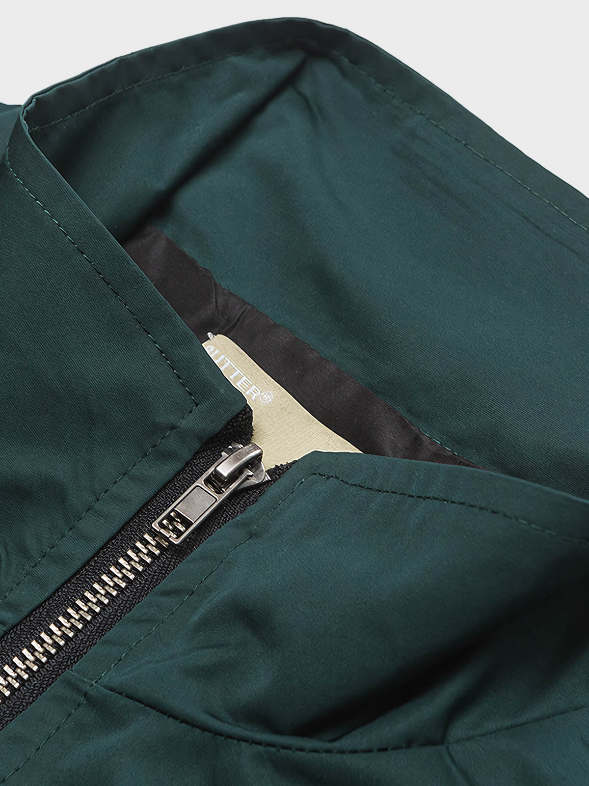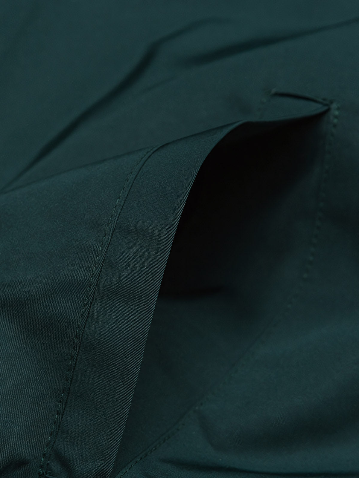 耐久性のある素材を使用し、シンプルなラインと精緻な縫製技術がジャケットの高品質を際立たせています。深緑色の色選びは控えめな都市感を表現し、胸部の小さなロゴはシンプルなデザインにほんの少しの特徴を加えています。