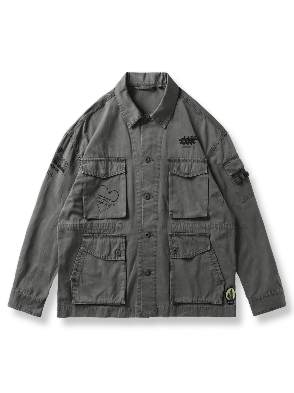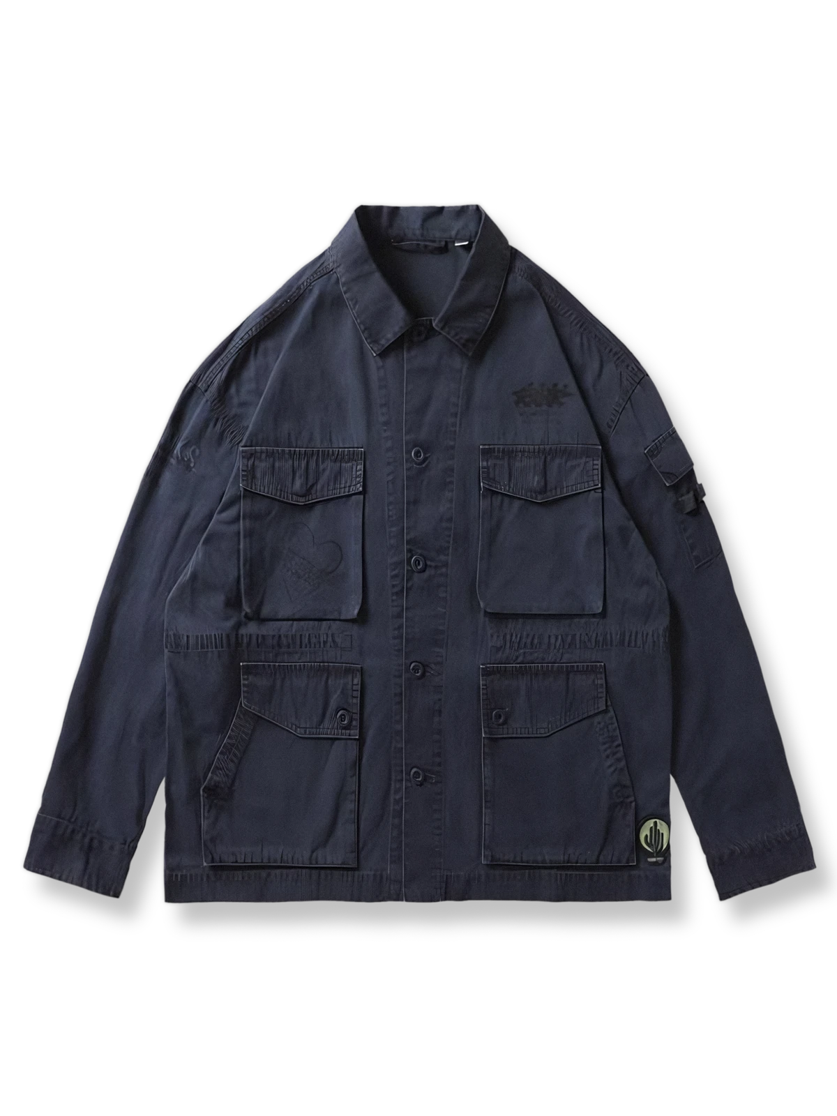 このワークジャケットは、ウォッシュドバティック加工による独特なヴィンテージ感と、多色プリントデザインが特徴です。4つのポケットが機能性を高め、ワークスタイルを強調します。コットン99%の素材を使用し、快適な着心地と優れた通気性を実現。春や秋のシーズンに最適な一着です。