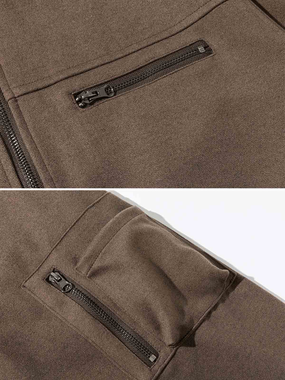 耐久性に優れた上質な素材を使用し、都会的な雰囲気を醸し出す洗練された色合いに仕上げています。特徴的なジップポケットとフラップポケットは、デザイン性だけでなく実用性にも配慮されており、細部にまでこだわりが感じられるディテールが魅力です。